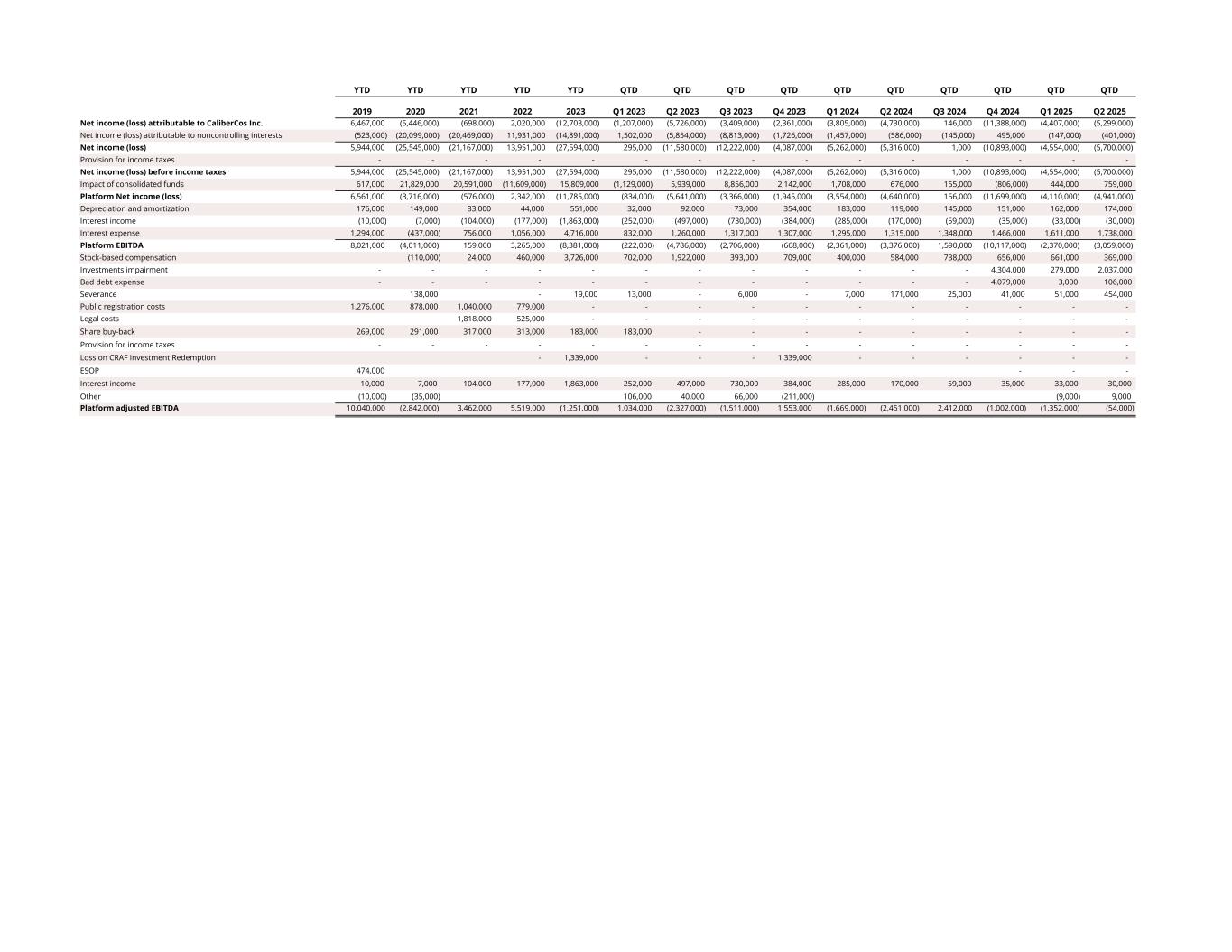 YTD YTD YTD YTD YTD QTD QTD QTD QTD QTD QTD QTD QTD QTD QTD 2019 2020 2021 2022 2023 Q1 2023 Q2 2023 Q3 2023 Q4 2023 Q1 2024 Q2 2024 Q3 2024 Q4 2024 Q1 2025 Q2 2025 Net income (loss) attributable to CaliberCos Inc. 6,467,000 (5,446,000) (698,000) 2,020,000 (12,703,000) (1,207,000) (5,726,000) (3,409,000) (2,361,000) (3,805,000) (4,730,000) 146,000 (11,388,000) (4,407,000) (5,299,000) Net income (loss) attributable to noncontrolling interests (523,000) (20,099,000) (20,469,000) 11,931,000 (14,891,000) 1,502,000 (5,854,000) (8,813,000) (1,726,000) (1,457,000) (586,000) (145,000) 495,000 (147,000) (401,000) Net income (loss) 5,944,000 (25,545,000) (21,167,000) 13,951,000 (27,594,000) 295,000 (11,580,000) (12,222,000) (4,087,000) (5,262,000) (5,316,000) 1,000 (10,893,000) (4,554,000) (5,700,000) Provision for income taxes - - - - - - - - - - - - - - - Net income (loss) before income taxes 5,944,000 (25,545,000) (21,167,000) 13,951,000 (27,594,000) 295,000 (11,580,000) (12,222,000) (4,087,000) (5,262,000) (5,316,000) 1,000 (10,893,000) (4,554,000) (5,700,000) Impact of consolidated funds 617,000 21,829,000 20,591,000 (11,609,000) 15,809,000 (1,129,000) 5,939,000 8,856,000 2,142,000 1,708,000 676,000 155,000 (806,000) 444,000 759,000 Platform Net income (loss) 6,561,000 (3,716,000) (576,000) 2,342,000 (11,785,000) (834,000) (5,641,000) (3,366,000) (1,945,000) (3,554,000) (4,640,000) 156,000 (11,699,000) (4,110,000) (4,941,000) Depreciation and amortization 176,000 149,000 83,000 44,000 551,000 32,000 92,000 73,000 354,000 183,000 119,000 145,000 151,000 162,000 174,000 Interest income (10,000) (7,000) (104,000) (177,000) (1,863,000) (252,000) (497,000) (730,000) (384,000) (285,000) (170,000) (59,000) (35,000) (33,000) (30,000) Interest expense 1,294,000 (437,000) 756,000 1,056,000 4,716,000 832,000 1,260,000 1,317,000 1,307,000 1,295,000 1,315,000 1,348,000 1,466,000 1,611,000 1,738,000 Platform EBITDA 8,021,000 (4,011,000) 159,000 3,265,000 (8,381,000) (222,000) (4,786,000) (2,706,000) (668,000) (2,361,000) (3,376,000) 1,590,000 (10,117,000) (2,370,000) (3,059,000) Stock-based compensation (110,000) 24,000 460,000 3,726,000 702,000 1,922,000 393,000 709,000 400,000 584,000 738,000 656,000 661,000 369,000 Investments impairment - - - - - - - - - - - - 4,304,000 279,000 2,037,000 Bad debt expense - - - - - - - - - - - - 4,079,000 3,000 106,000 Severance 138,000 - 19,000 13,000 - 6,000 - 7,000 171,000 25,000 41,000 51,000 454,000 Public registration costs 1,276,000 878,000 1,040,000 779,000 - - - - - - - - - - - Legal costs 1,818,000 525,000 - - - - - - - - - - - Share buy-back 269,000 291,000 317,000 313,000 183,000 183,000 - - - - - - - - - Provision for income taxes - - - - - - - - - - - - - - - Loss on CRAF Investment Redemption - 1,339,000 - - - 1,339,000 - - - - - - ESOP 474,000 - - - Interest income 10,000 7,000 104,000 177,000 1,863,000 252,000 497,000 730,000 384,000 285,000 170,000 59,000 35,000 33,000 30,000 Other (10,000) (35,000) 106,000 40,000 66,000 (211,000) (9,000) 9,000 Platform adjusted EBITDA 10,040,000 (2,842,000) 3,462,000 5,519,000 (1,251,000) 1,034,000 (2,327,000) (1,511,000) 1,553,000 (1,669,000) (2,451,000) 2,412,000 (1,002,000) (1,352,000) (54,000)