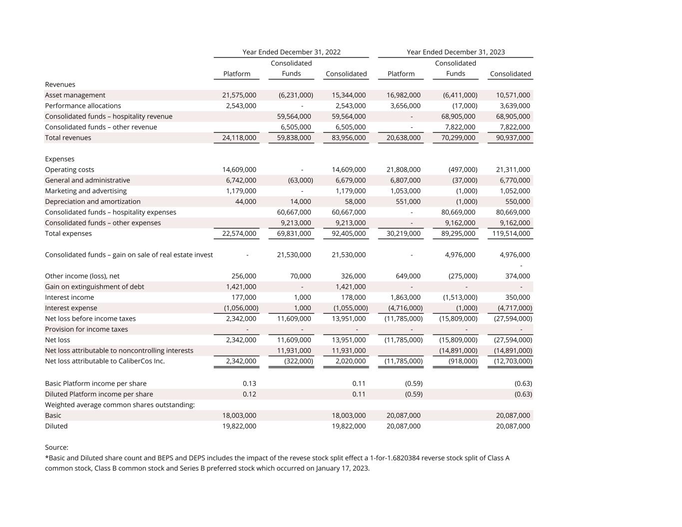 Platform Consolidated Funds Consolidated Platform Consolidated Funds Consolidated Revenues Asset management 21,575,000 (6,231,000) 15,344,000 16,982,000 (6,411,000) 10,571,000 Performance allocations 2,543,000 - 2,543,000 3,656,000 (17,000) 3,639,000 Consolidated funds – hospitality revenue 59,564,000 59,564,000 - 68,905,000 68,905,000 Consolidated funds – other revenue 6,505,000 6,505,000 - 7,822,000 7,822,000 Total revenues 24,118,000 59,838,000 83,956,000 20,638,000 70,299,000 90,937,000 Expenses Operating costs 14,609,000 - 14,609,000 21,808,000 (497,000) 21,311,000 General and administrative 6,742,000 (63,000) 6,679,000 6,807,000 (37,000) 6,770,000 Marketing and advertising 1,179,000 - 1,179,000 1,053,000 (1,000) 1,052,000 Depreciation and amortization 44,000 14,000 58,000 551,000 (1,000) 550,000 Consolidated funds – hospitality expenses 60,667,000 60,667,000 - 80,669,000 80,669,000 Consolidated funds – other expenses 9,213,000 9,213,000 - 9,162,000 9,162,000 Total expenses 22,574,000 69,831,000 92,405,000 30,219,000 89,295,000 119,514,000 Consolidated funds – gain on sale of real estate invest - 21,530,000 21,530,000 - 4,976,000 4,976,000 - Other income (loss), net 256,000 70,000 326,000 649,000 (275,000) 374,000 Gain on extinguishment of debt 1,421,000 - 1,421,000 - - - Interest income 177,000 1,000 178,000 1,863,000 (1,513,000) 350,000 Interest expense (1,056,000) 1,000 (1,055,000) (4,716,000) (1,000) (4,717,000) Net loss before income taxes 2,342,000 11,609,000 13,951,000 (11,785,000) (15,809,000) (27,594,000) Provision for income taxes - - - - - - Net loss 2,342,000 11,609,000 13,951,000 (11,785,000) (15,809,000) (27,594,000) Net loss attributable to noncontrolling interests 11,931,000 11,931,000 (14,891,000) (14,891,000) Net loss attributable to CaliberCos Inc. 2,342,000 (322,000) 2,020,000 (11,785,000) (918,000) (12,703,000) Basic Platform income per share 0.13 0.11 (0.59) (0.63) Diluted Platform income per share 0.12 0.11 (0.59) (0.63) Weighted average common shares outstanding: Basic 18,003,000 18,003,000 20,087,000 20,087,000 Diluted 19,822,000 19,822,000 20,087,000 20,087,000 Source: Year Ended December 31, 2022 Year Ended December 31, 2023 *Basic and Diluted share count and BEPS and DEPS includes the impact of the revese stock split effect a 1-for-1.6820384 reverse stock split of Class A common stock, Class B common stock and Series B preferred stock which occurred on January 17, 2023.