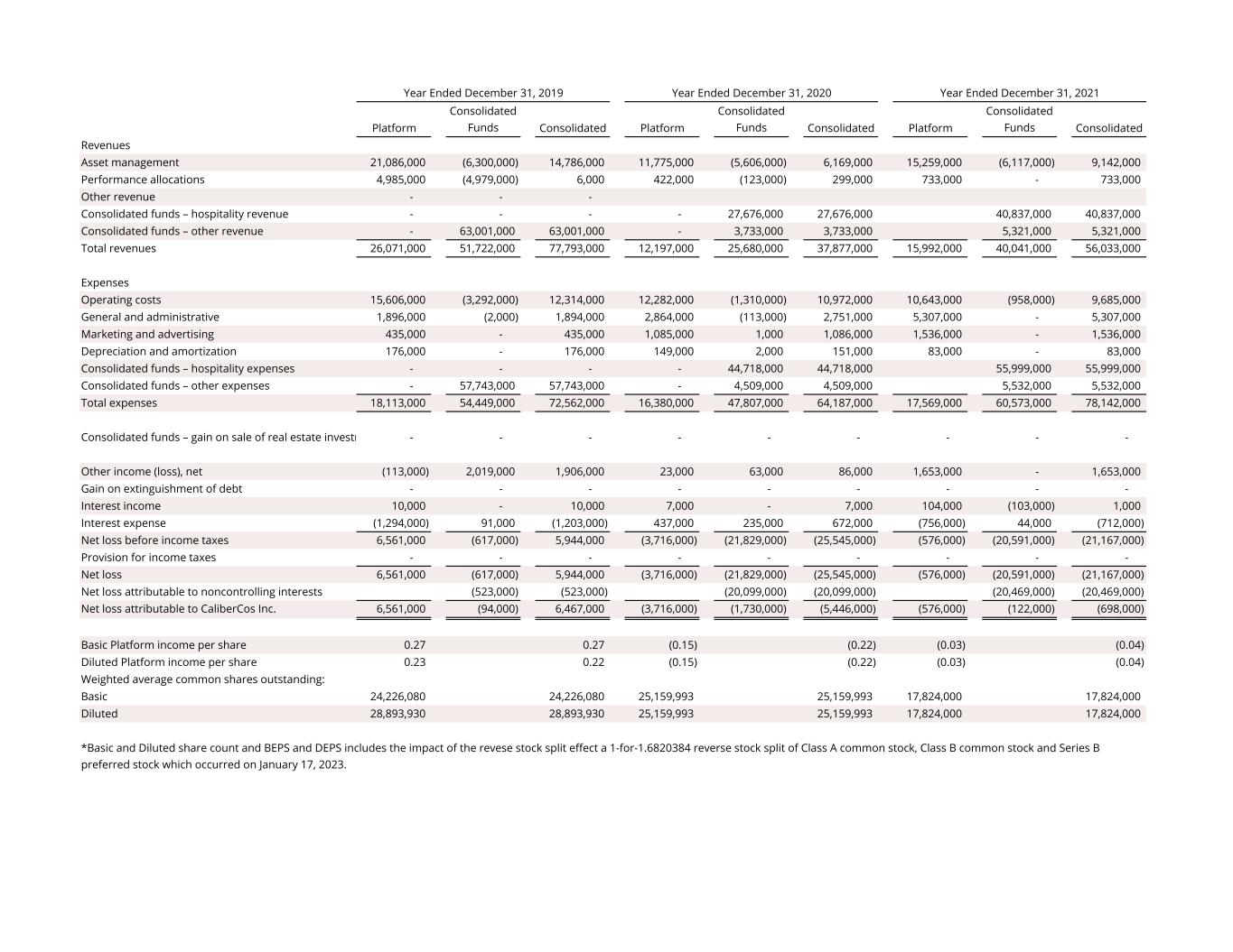 Platform Consolidated Funds Consolidated Platform Consolidated Funds Consolidated Platform Consolidated Funds Consolidated Revenues Asset management 21,086,000 (6,300,000) 14,786,000 11,775,000 (5,606,000) 6,169,000 15,259,000 (6,117,000) 9,142,000 Performance allocations 4,985,000 (4,979,000) 6,000 422,000 (123,000) 299,000 733,000 - 733,000 Other revenue - - - Consolidated funds – hospitality revenue - - - - 27,676,000 27,676,000 40,837,000 40,837,000 Consolidated funds – other revenue - 63,001,000 63,001,000 - 3,733,000 3,733,000 5,321,000 5,321,000 Total revenues 26,071,000 51,722,000 77,793,000 12,197,000 25,680,000 37,877,000 15,992,000 40,041,000 56,033,000 Expenses Operating costs 15,606,000 (3,292,000) 12,314,000 12,282,000 (1,310,000) 10,972,000 10,643,000 (958,000) 9,685,000 General and administrative 1,896,000 (2,000) 1,894,000 2,864,000 (113,000) 2,751,000 5,307,000 - 5,307,000 Marketing and advertising 435,000 - 435,000 1,085,000 1,000 1,086,000 1,536,000 - 1,536,000 Depreciation and amortization 176,000 - 176,000 149,000 2,000 151,000 83,000 - 83,000 Consolidated funds – hospitality expenses - - - - 44,718,000 44,718,000 55,999,000 55,999,000 Consolidated funds – other expenses - 57,743,000 57,743,000 - 4,509,000 4,509,000 5,532,000 5,532,000 Total expenses 18,113,000 54,449,000 72,562,000 16,380,000 47,807,000 64,187,000 17,569,000 60,573,000 78,142,000 Consolidated funds – gain on sale of real estate investm - - - - - - - - - Other income (loss), net (113,000) 2,019,000 1,906,000 23,000 63,000 86,000 1,653,000 - 1,653,000 Gain on extinguishment of debt - - - - - - - - - Interest income 10,000 - 10,000 7,000 - 7,000 104,000 (103,000) 1,000 Interest expense (1,294,000) 91,000 (1,203,000) 437,000 235,000 672,000 (756,000) 44,000 (712,000) Net loss before income taxes 6,561,000 (617,000) 5,944,000 (3,716,000) (21,829,000) (25,545,000) (576,000) (20,591,000) (21,167,000) Provision for income taxes - - - - - - - - - Net loss 6,561,000 (617,000) 5,944,000 (3,716,000) (21,829,000) (25,545,000) (576,000) (20,591,000) (21,167,000) Net loss attributable to noncontrolling interests (523,000) (523,000) (20,099,000) (20,099,000) (20,469,000) (20,469,000) Net loss attributable to CaliberCos Inc. 6,561,000 (94,000) 6,467,000 (3,716,000) (1,730,000) (5,446,000) (576,000) (122,000) (698,000) Basic Platform income per share 0.27 0.27 (0.15) (0.22) (0.03) (0.04) Diluted Platform income per share 0.23 0.22 (0.15) (0.22) (0.03) (0.04) Weighted average common shares outstanding: Basic 24,226,080 24,226,080 25,159,993 25,159,993 17,824,000 17,824,000 Diluted 28,893,930 28,893,930 25,159,993 25,159,993 17,824,000 17,824,000 Year Ended December 31, 2019 Year Ended December 31, 2020 Year Ended December 31, 2021 *Basic and Diluted share count and BEPS and DEPS includes the impact of the revese stock split effect a 1-for-1.6820384 reverse stock split of Class A common stock, Class B common stock and Series B preferred stock which occurred on January 17, 2023.