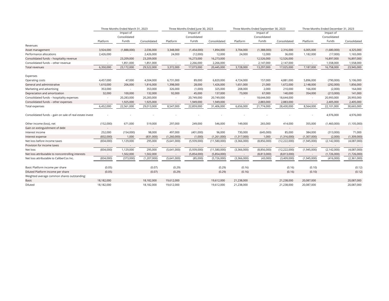 Platform Impact of Consolidated Funds Consolidated Platform Impact of Consolidated Funds Consolidated Platform Impact of Consolidated Funds Consolidated Platform Impact of Consolidated Funds Consolidated Revenues Asset management 3,924,000 (1,888,000) 2,036,000 3,348,000 (1,454,000) 1,894,000 3,704,000 (1,388,000) 2,316,000 6,005,000 (1,680,000) 4,325,000 Performance allocations 2,426,000 - 2,426,000 24,000 (12,000) 12,000 24,000 12,000 36,000 1,182,000 (17,000) 1,165,000 Consolidated funds – hospitality revenue - 23,209,000 23,209,000 - 16,273,000 16,273,000 - 12,526,000 12,526,000 - 16,897,000 16,897,000 Consolidated funds – other revenue - 1,851,000 1,851,000 - 2,266,000 2,266,000 - 2,147,000 2,147,000 - 1,558,000 1,558,000 Total revenues 6,350,000 23,172,000 29,522,000 3,372,000 17,073,000 20,445,000 3,728,000 13,297,000 17,025,000 7,187,000 16,758,000 23,945,000 Expenses Operating costs 4,457,000 47,000 4,504,000 6,731,000 89,000 6,820,000 4,724,000 157,000 4,881,000 5,896,000 (790,000) 5,106,000 General and administrative 1,610,000 206,000 1,816,000 1,398,000 28,000 1,426,000 1,651,000 21,000 1,672,000 2,148,000 (292,000) 1,856,000 Marketing and advertising 353,000 - 353,000 326,000 (1,000) 325,000 208,000 2,000 210,000 166,000 (2,000) 164,000 Depreciation and amortization 32,000 100,000 132,000 92,000 45,000 137,000 73,000 67,000 140,000 354,000 (213,000) 141,000 Consolidated funds – hospitality expenses - 20,283,000 20,283,000 - 20,749,000 20,749,000 - 18,644,000 18,644,000 - 20,993,000 20,993,000 Consolidated funds – other expenses - 1,925,000 1,925,000 - 1,949,000 1,949,000 - 2,883,000 2,883,000 - 2,405,000 2,405,000 Total expenses 6,452,000 22,561,000 29,013,000 8,547,000 22,859,000 31,406,000 6,656,000 21,774,000 28,430,000 8,564,000 22,101,000 30,665,000 Consolidated funds – gain on sale of real estate invest - - - - - - - - - - 4,976,000 4,976,000 Other income (loss), net (152,000) 671,000 519,000 297,000 249,000 546,000 149,000 265,000 414,000 355,000 (1,460,000) (1,105,000) Gain on extinguishment of debt - - - - - - - - - - - - Interest income 252,000 (154,000) 98,000 497,000 (401,000) 96,000 730,000 (645,000) 85,000 384,000 (313,000) 71,000 Interest expense (832,000) 1,000 (831,000) (1,260,000) (1,000) (1,261,000) (1,317,000) 1,000 (1,316,000) (1,307,000) (2,000) (1,309,000) Net loss before income taxes (834,000) 1,129,000 295,000 (5,641,000) (5,939,000) (11,580,000) (3,366,000) (8,856,000) (12,222,000) (1,945,000) (2,142,000) (4,087,000) Provision for income taxes - - - - - - - - - - - - Net loss (834,000) 1,129,000 295,000 (5,641,000) (5,939,000) (11,580,000) (3,366,000) (8,856,000) (12,222,000) (1,945,000) (2,142,000) (4,087,000) Net loss attributable to noncontrolling interests - 1,502,000 1,502,000 - (5,854,000) (5,854,000) - (8,813,000) (8,813,000) - (1,726,000) (1,726,000) Net loss attributable to CaliberCos Inc. (834,000) (373,000) (1,207,000) (5,641,000) (85,000) (5,726,000) (3,366,000) (43,000) (3,409,000) (1,945,000) (416,000) (2,361,000) Basic Platform income per share (0.05) (0.07) (0.29) (0.29) (0.16) (0.16) (0.10) (0.12) Diluted Platform income per share (0.05) (0.07) (0.29) (0.29) (0.16) (0.16) (0.10) (0.12) Weighted average common shares outstanding: Basic 18,182,000 18,182,000 19,612,000 19,612,000 21,238,000 21,238,000 20,087,000 20,087,000 Diluted 18,182,000 18,182,000 19,612,000 19,612,000 21,238,000 21,238,000 20,087,000 20,087,000 Three Months Ended March 31, 2023 Three Months Ended June 30, 2023 Three Months Ended September 30, 2023 Three Months Ended December 31, 2023