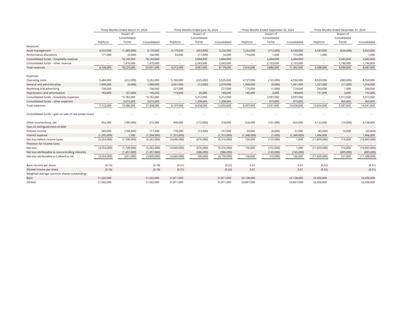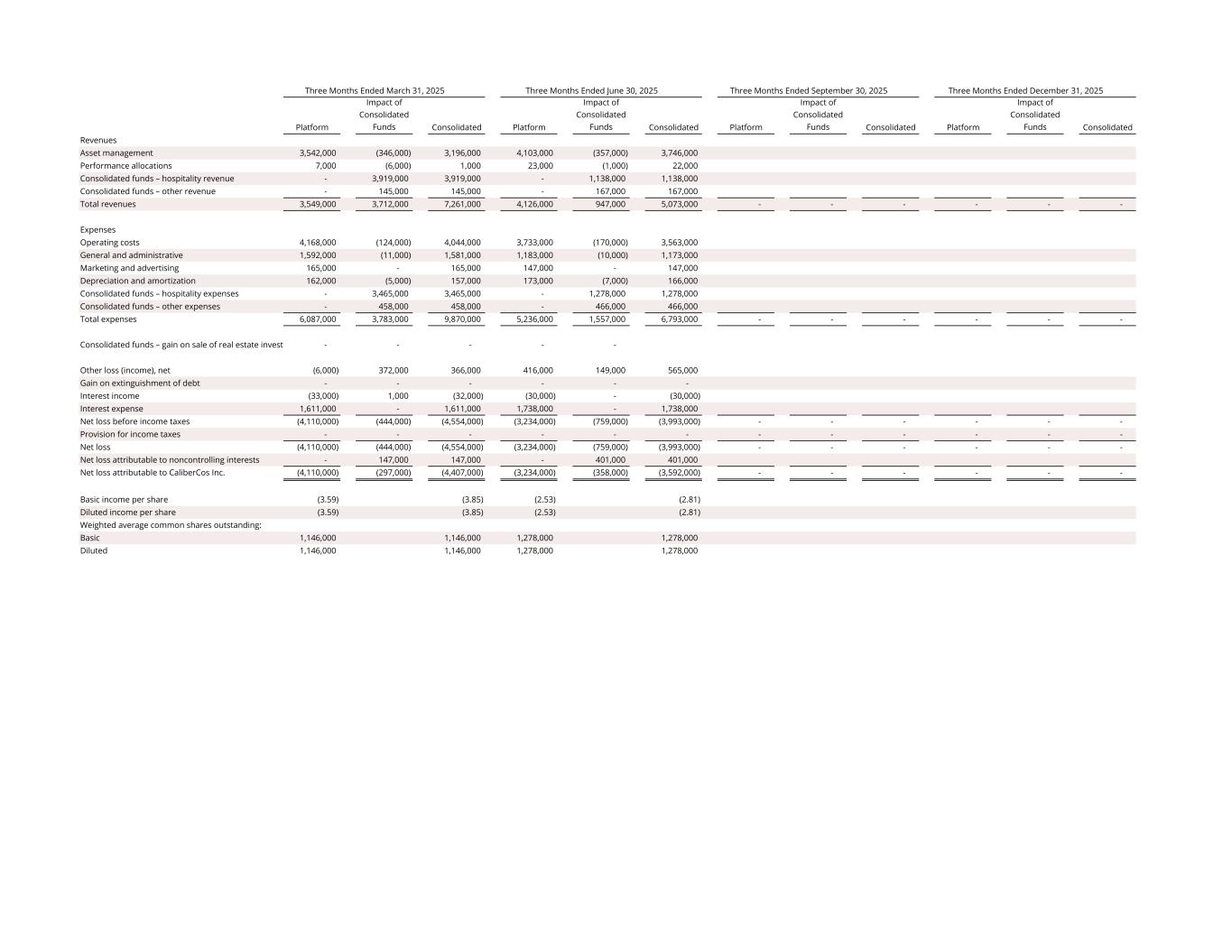 Platform Impact of Consolidated Funds Consolidated Platform Impact of Consolidated Funds Consolidated Platform Impact of Consolidated Funds Consolidated Platform Impact of Consolidated Funds Consolidated Revenues Asset management 3,542,000 (346,000) 3,196,000 4,103,000 (357,000) 3,746,000 Performance allocations 7,000 (6,000) 1,000 23,000 (1,000) 22,000 Consolidated funds – hospitality revenue - 3,919,000 3,919,000 - 1,138,000 1,138,000 Consolidated funds – other revenue - 145,000 145,000 - 167,000 167,000 Total revenues 3,549,000 3,712,000 7,261,000 4,126,000 947,000 5,073,000 - - - - - - Expenses Operating costs 4,168,000 (124,000) 4,044,000 3,733,000 (170,000) 3,563,000 General and administrative 1,592,000 (11,000) 1,581,000 1,183,000 (10,000) 1,173,000 Marketing and advertising 165,000 - 165,000 147,000 - 147,000 Depreciation and amortization 162,000 (5,000) 157,000 173,000 (7,000) 166,000 Consolidated funds – hospitality expenses - 3,465,000 3,465,000 - 1,278,000 1,278,000 Consolidated funds – other expenses - 458,000 458,000 - 466,000 466,000 Total expenses 6,087,000 3,783,000 9,870,000 5,236,000 1,557,000 6,793,000 - - - - - - Consolidated funds – gain on sale of real estate invest - - - - - Other loss (income), net (6,000) 372,000 366,000 416,000 149,000 565,000 Gain on extinguishment of debt - - - - - - Interest income (33,000) 1,000 (32,000) (30,000) - (30,000) Interest expense 1,611,000 - 1,611,000 1,738,000 - 1,738,000 Net loss before income taxes (4,110,000) (444,000) (4,554,000) (3,234,000) (759,000) (3,993,000) - - - - - - Provision for income taxes - - - - - - - - - - - - Net loss (4,110,000) (444,000) (4,554,000) (3,234,000) (759,000) (3,993,000) - - - - - - Net loss attributable to noncontrolling interests - 147,000 147,000 - 401,000 401,000 Net loss attributable to CaliberCos Inc. (4,110,000) (297,000) (4,407,000) (3,234,000) (358,000) (3,592,000) - - - - - - Basic income per share (3.59) (3.85) (2.53) (2.81) Diluted income per share (3.59) (3.85) (2.53) (2.81) Weighted average common shares outstanding: Basic 1,146,000 1,146,000 1,278,000 1,278,000 Diluted 1,146,000 1,146,000 1,278,000 1,278,000 Three Months Ended March 31, 2025 Three Months Ended June 30, 2025 Three Months Ended September 30, 2025 Three Months Ended December 31, 2025