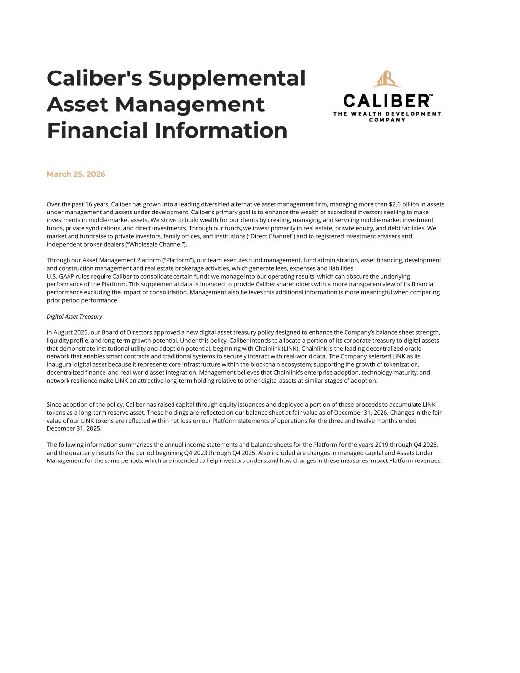 Over the past 16 years, Caliber has grown into a leading diversified alternative asset management firm, managing more than $2.6 billion in assets under management and assets under development. Caliber’s primary goal is to enhance the wealth of accredited investors seeking to make investments in middle-market assets. We strive to build wealth for our clients by creating, managing, and servicing middle-market investment funds, private syndications, and direct investments. Through our funds, we invest primarily in real estate, private equity, and debt facilities. We market and fundraise to private investors, family offices, and institutions (“Direct Channel”) and to registered investment advisers and independent broker-dealers (“Wholesale Channel”). Through our Asset Management Platform (“Platform”), our team executes fund management, fund administration, asset financing, development and construction management and real estate brokerage activities, which generate fees, expenses and liabilities. U.S. GAAP rules require Caliber to consolidate certain funds we manage into our operating results, which can obscure the underlying performance of the Platform. This supplemental data is intended to provide Caliber shareholders with a more transparent view of its financial performance excluding the impact of consolidation. Management also believes this additional information is more meaningful when comparing prior period performance. Digital Asset Treasury In August 2025, our Board of Directors approved a new digital asset treasury policy designed to enhance the Company’s balance sheet strength, liquidity profile, and long-term growth potential. Under this policy, Caliber intends to allocate a portion of its corporate treasury to digital assets that demonstrate institutional utility and adoption potential, beginning with Chainlink (LINK). Chainlink is the leading decentralized oracle network that enables smart contracts and traditional systems to securely interact with real-world data. The Company selected LINK as its inaugural digital asset because it represents core infrastructure within the blockchain ecosystem; supporting the growth of tokenization, decentralized finance, and real-world asset integration. Management believes that Chainlink’s enterprise adoption, technology maturity, and network resilience make LINK an attractive long-term holding relative to other digital assets at similar stages of adoption. Since adoption of the policy, Caliber has raised capital through equity issuances and deployed a portion of those proceeds to accumulate LINK tokens as a long-term reserve asset. These holdings are reflected on our balance sheet at fair value as of December 31, 2026. Changes in the fair value of our LINK tokens are reflected within net loss on our Platform statements of operations for the three and twelve months ended December 31, 2025. The following information summarizes the annual income statements and balance sheets for the Platform for the years 2019 through Q4 2025, and the quarterly results for the period beginning Q4 2023 through Q4 2025. Also included are changes in managed capital and Assets Under Management for the same periods, which are intended to help investors understand how changes in these measures impact Platform revenues. Caliber's Supplemental Asset Management Financial Information March 25, 2026