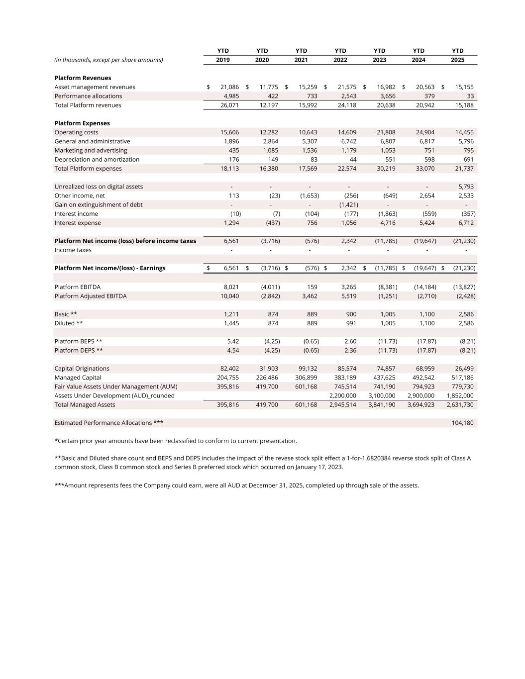 YTD YTD YTD YTD YTD YTD YTD (in thousands, except per share amounts) 2019 2020 2021 2022 2023 2024 2025 Platform Revenues Asset management revenues 21,086$ 11,775$ 15,259$ 21,575$ 16,982$ 20,563$ 15,155$ Performance allocations 4,985 422 733 2,543 3,656 379 33 Total Platform revenues 26,071 12,197 15,992 24,118 20,638 20,942 15,188 Platform Expenses Operating costs 15,606 12,282 10,643 14,609 21,808 24,904 14,455 General and administrative 1,896 2,864 5,307 6,742 6,807 6,817 5,796 Marketing and advertising 435 1,085 1,536 1,179 1,053 751 795 Depreciation and amortization 176 149 83 44 551 598 691 Total Platform expenses 18,113 16,380 17,569 22,574 30,219 33,070 21,737 Unrealized loss on digital assets - - - - - - 5,793 Other income, net 113 (23) (1,653) (256) (649) 2,654 2,533 Gain on extinguishment of debt - - - (1,421) - - - Interest income (10) (7) (104) (177) (1,863) (559) (357) Interest expense 1,294 (437) 756 1,056 4,716 5,424 6,712 Platform Net income (loss) before income taxes 6,561 (3,716) (576) 2,342 (11,785) (19,647) (21,230) Income taxes - - - - - - - Platform Net income/(loss) - Earnings 6,561$ (3,716)$ (576)$ 2,342$ (11,785)$ (19,647)$ (21,230)$ Platform EBITDA 8,021 (4,011) 159 3,265 (8,381) (14,184) (13,827) Platform Adjusted EBITDA 10,040 (2,842) 3,462 5,519 (1,251) (2,710) (2,428) Basic ** 1,211 874 889 900 1,005 1,100 2,586 Diluted ** 1,445 874 889 991 1,005 1,100 2,586 Platform BEPS ** 5.42 (4.25) (0.65) 2.60 (11.73) (17.87) (8.21) Platform DEPS ** 4.54 (4.25) (0.65) 2.36 (11.73) (17.87) (8.21) Capital Originations 82,402 31,903 99,132 85,574 74,857 68,959 26,499 Managed Capital 204,755 226,486 306,899 383,189 437,625 492,542 517,186 Fair Value Assets Under Management (AUM) 395,816 419,700 601,168 745,514 741,190 794,923 779,730 Assets Under Development (AUD)_rounded 2,200,000 3,100,000 2,900,000 1,852,000 Total Managed Assets 395,816 419,700 601,168 2,945,514 3,841,190 3,694,923 2,631,730 Estimated Performance Allocations *** 104,180 *Certain prior year amounts have been reclassified to conform to current presentation. ***Amount represents fees the Company could earn, were all AUD at December 31, 2025, completed up through sale of the assets. **Basic and Diluted share count and BEPS and DEPS includes the impact of the revese stock split effect a 1-for-1.6820384 reverse stock split of Class A common stock, Class B common stock and Series B preferred stock which occurred on January 17, 2023.