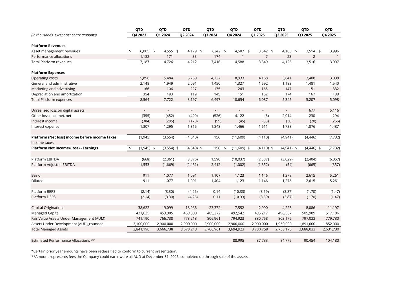 QTD QTD QTD QTD QTD QTD QTD QTD QTD (in thousands, except per share amounts) Q4 2023 Q1 2024 Q2 2024 Q3 2024 Q4 2024 Q1 2025 Q2 2025 Q3 2025 Q4 2025 Platform Revenues Asset management revenues 6,005$ 4,555$ 4,179$ 7,242$ 4,587$ 3,542$ 4,103$ 3,514$ 3,996$ Performance allocations 1,182 171 33 174 1 7 23 2 1 Total Platform revenues 7,187 4,726 4,212 7,416 4,588 3,549 4,126 3,516 3,997 Platform Expenses Operating costs 5,896 5,484 5,760 4,727 8,933 4,168 3,841 3,408 3,038 General and administrative 2,148 1,949 2,091 1,450 1,327 1,592 1,183 1,481 1,540 Marketing and advertising 166 106 227 175 243 165 147 151 332 Depreciation and amortization 354 183 119 145 151 162 174 167 188 Total Platform expenses 8,564 7,722 8,197 6,497 10,654 6,087 5,345 5,207 5,098 Unrealized loss on digital assets - - - - - - - 677 5,116 Other loss (income), net (355) (452) (490) (526) 4,122 (6) 2,014 230 294 Interest income (384) (285) (170) (59) (45) (33) (30) (28) (266) Interest expense 1,307 1,295 1,315 1,348 1,466 1,611 1,738 1,876 1,487 Platform (Net loss) income before income taxes (1,945) (3,554) (4,640) 156 (11,609) (4,110) (4,941) (4,446) (7,732) Income taxes - - - - - - - - - Platform Net income/(loss) - Earnings (1,945)$ (3,554)$ (4,640)$ 156$ (11,609)$ (4,110)$ (4,941)$ (4,446)$ (7,732)$ Platform EBITDA (668) (2,361) (3,376) 1,590 (10,037) (2,337) (3,029) (2,404) (6,057) Platform Adjusted EBITDA 1,553 (1,669) (2,451) 2,412 (1,002) (1,352) (54) (665) (357) Basic 911 1,077 1,091 1,107 1,123 1,146 1,278 2,615 5,261 Diluted 911 1,077 1,091 1,404 1,123 1,146 1,278 2,615 5,261 Platform BEPS (2.14) (3.30) (4.25) 0.14 (10.33) (3.59) (3.87) (1.70) (1.47) Platform DEPS (2.14) (3.30) (4.25) 0.11 (10.33) (3.59) (3.87) (1.70) (1.47) Capital Originations 38,622 19,099 18,936 23,372 7,552 2,990 4,226 8,086 11,197 Managed Capital 437,625 453,905 469,800 485,272 492,542 495,217 498,567 505,989 517,186 Fair Value Assets Under Management (AUM) 741,190 766,738 773,213 806,961 794,923 830,758 803,176 797,033 779,730 Assets Under Development (AUD)_rounded 3,100,000 2,900,000 2,900,000 2,900,000 2,900,000 2,900,000 1,950,000 1,891,000 1,852,000 Total Managed Assets 3,841,190 3,666,738 3,673,213 3,706,961 3,694,923 3,730,758 2,753,176 2,688,033 2,631,730 Estimated Performance Allocations ** 88,995 87,733 84,776 90,454 104,180 *Certain prior year amounts have been reclassified to conform to current presentation. **Amount represents fees the Company could earn, were all AUD at December 31, 2025, completed up through sale of the assets.