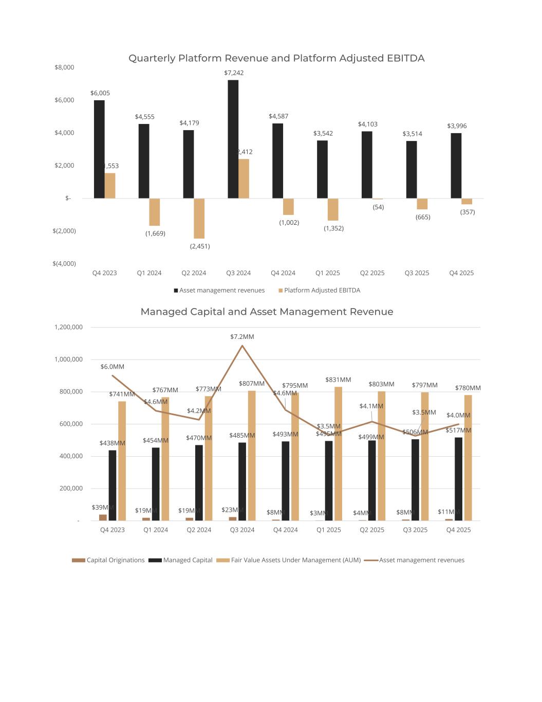 $6,005 $4,555 $4,179 $7,242 $4,587 $3,542 $4,103 $3,514 $3,996 1,553 (1,669) (2,451) 2,412 (1,002) (1,352) (54) (665) (357) $(4,000) $(2,000) $- $2,000 $4,000 $6,000 $8,000 Q4 2023 Q1 2024 Q2 2024 Q3 2024 Q4 2024 Q1 2025 Q2 2025 Q3 2025 Q4 2025 Quarterly Platform Revenue and Platform Adjusted EBITDA Asset management revenues Platform Adjusted EBITDA $39MM $19MM $19MM $23MM $8MM $3MM $4MM $8MM $11MM $438MM $454MM $470MM $485MM $493MM $495MM $499MM $506MM $517MM $741MM $767MM $773MM $807MM $795MM $831MM $803MM $797MM $780MM $6.0MM $4.6MM $4.2MM $7.2MM $4.6MM $3.5MM $4.1MM $3.5MM $4.0MM - 200,000 400,000 600,000 800,000 1,000,000 1,200,000 Q4 2023 Q1 2024 Q2 2024 Q3 2024 Q4 2024 Q1 2025 Q2 2025 Q3 2025 Q4 2025 Managed Capital and Asset Management Revenue Capital Originations Managed Capital Fair Value Assets Under Management (AUM) Asset management revenues