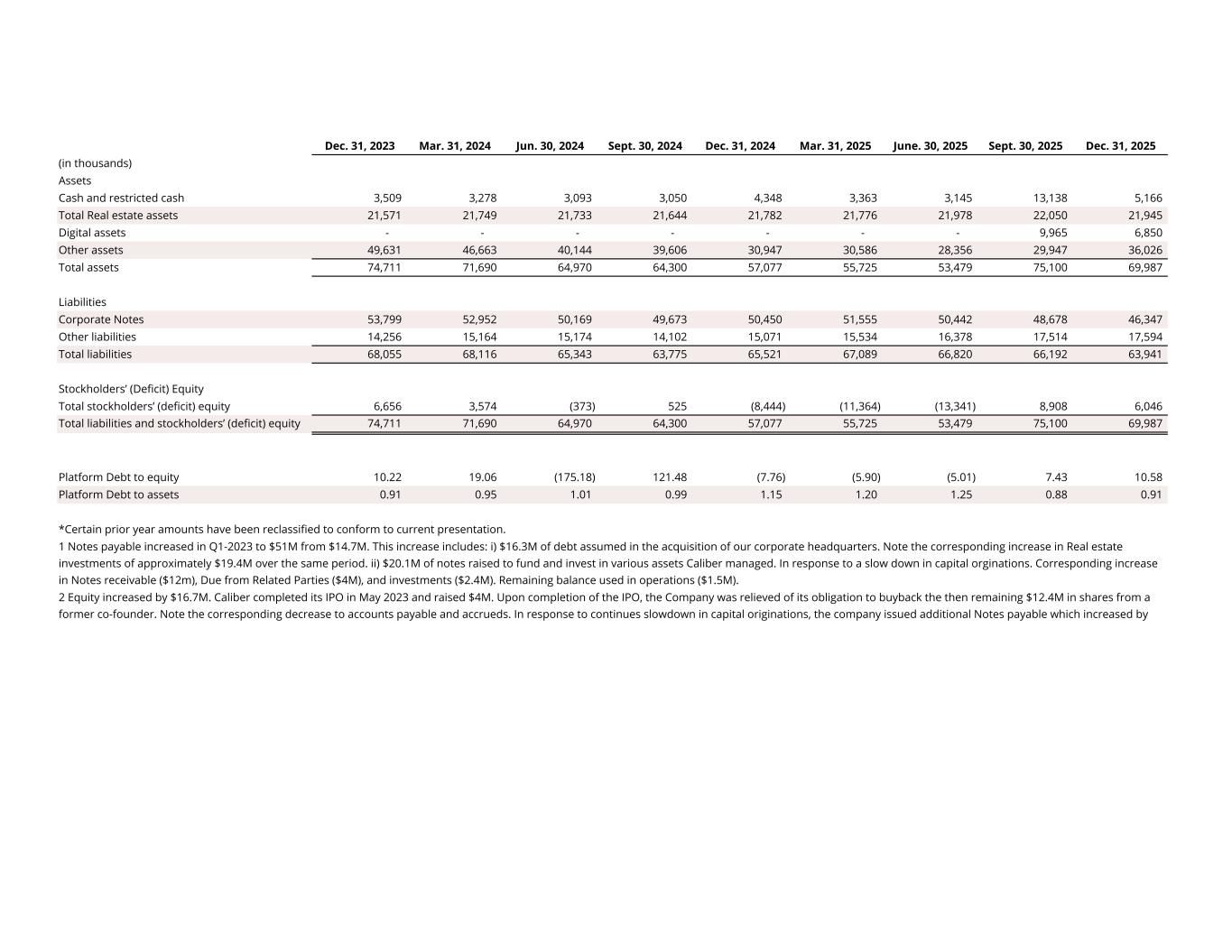 Dec. 31, 2023 Mar. 31, 2024 Jun. 30, 2024 Sept. 30, 2024 Dec. 31, 2024 Mar. 31, 2025 June. 30, 2025 Sept. 30, 2025 Dec. 31, 2025 (in thousands) Assets Cash and restricted cash 3,509 3,278 3,093 3,050 4,348 3,363 3,145 13,138 5,166 Total Real estate assets 21,571 21,749 21,733 21,644 21,782 21,776 21,978 22,050 21,945 Digital assets - - - - - - - 9,965 6,850 Other assets 49,631 46,663 40,144 39,606 30,947 30,586 28,356 29,947 36,026 Total assets 74,711 71,690 64,970 64,300 57,077 55,725 53,479 75,100 69,987 Liabilities Corporate Notes 53,799 52,952 50,169 49,673 50,450 51,555 50,442 48,678 46,347 Other liabilities 14,256 15,164 15,174 14,102 15,071 15,534 16,378 17,514 17,594 Total liabilities 68,055 68,116 65,343 63,775 65,521 67,089 66,820 66,192 63,941 Stockholders’ (Deficit) Equity Total stockholders’ (deficit) equity 6,656 3,574 (373) 525 (8,444) (11,364) (13,341) 8,908 6,046 Total liabilities and stockholders’ (deficit) equity 74,711 71,690 64,970 64,300 57,077 55,725 53,479 75,100 69,987 Platform Debt to equity 10.22 19.06 (175.18) 121.48 (7.76) (5.90) (5.01) 7.43 10.58 Platform Debt to assets 0.91 0.95 1.01 0.99 1.15 1.20 1.25 0.88 0.91 *Certain prior year amounts have been reclassified to conform to current presentation. 1 Notes payable increased in Q1-2023 to $51M from $14.7M. This increase includes: i) $16.3M of debt assumed in the acquisition of our corporate headquarters. Note the corresponding increase in Real estate investments of approximately $19.4M over the same period. ii) $20.1M of notes raised to fund and invest in various assets Caliber managed. In response to a slow down in capital orginations. Corresponding increase in Notes receivable ($12m), Due from Related Parties ($4M), and investments ($2.4M). Remaining balance used in operations ($1.5M). 2 Equity increased by $16.7M. Caliber completed its IPO in May 2023 and raised $4M. Upon completion of the IPO, the Company was relieved of its obligation to buyback the then remaining $12.4M in shares from a former co-founder. Note the corresponding decrease to accounts payable and accrueds. In response to continues slowdown in capital originations, the company issued additional Notes payable which increased by