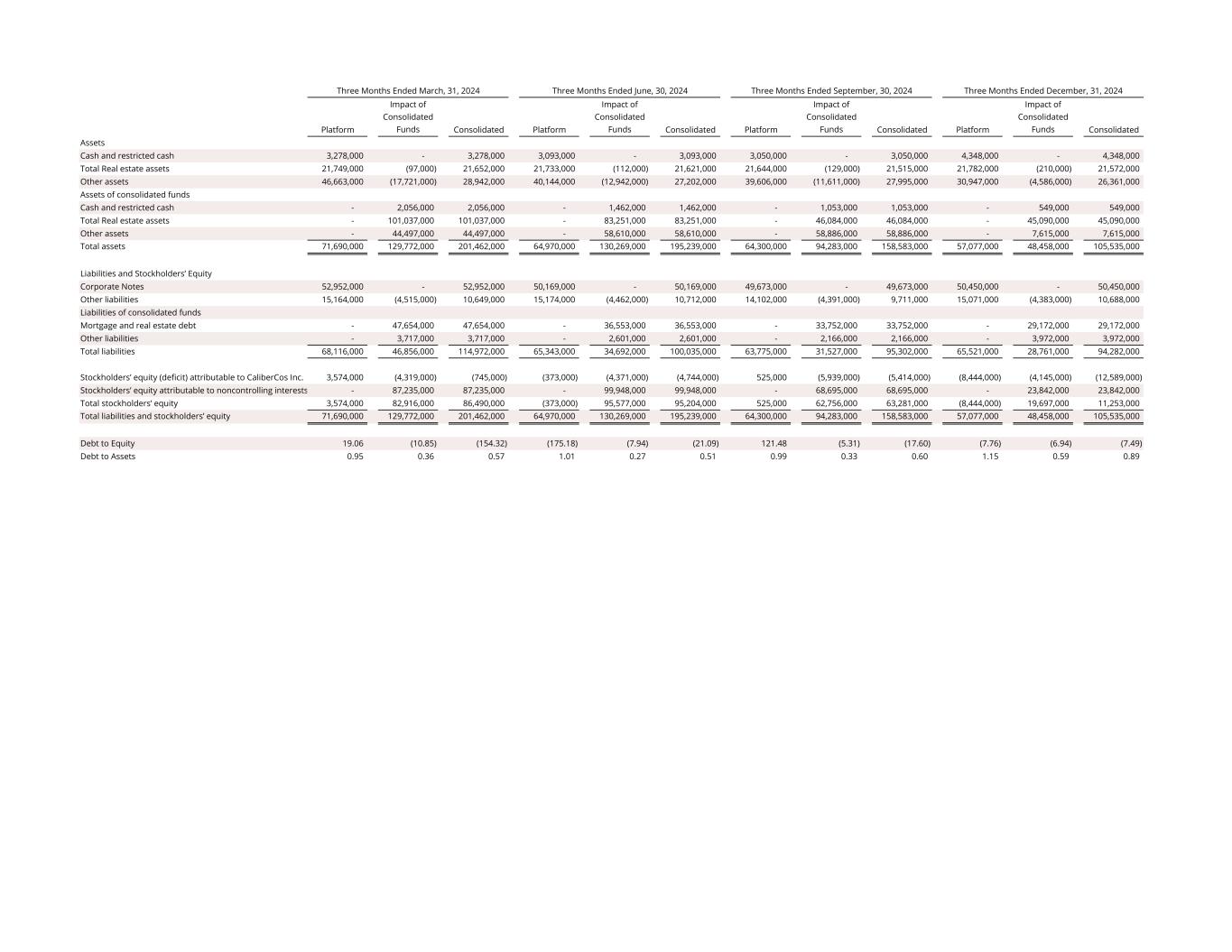 Platform Impact of Consolidated Funds Consolidated Platform Impact of Consolidated Funds Consolidated Platform Impact of Consolidated Funds Consolidated Platform Impact of Consolidated Funds Consolidated Assets Cash and restricted cash 3,278,000 - 3,278,000 3,093,000 - 3,093,000 3,050,000 - 3,050,000 4,348,000 - 4,348,000 Total Real estate assets 21,749,000 (97,000) 21,652,000 21,733,000 (112,000) 21,621,000 21,644,000 (129,000) 21,515,000 21,782,000 (210,000) 21,572,000 Other assets 46,663,000 (17,721,000) 28,942,000 40,144,000 (12,942,000) 27,202,000 39,606,000 (11,611,000) 27,995,000 30,947,000 (4,586,000) 26,361,000 Assets of consolidated funds Cash and restricted cash - 2,056,000 2,056,000 - 1,462,000 1,462,000 - 1,053,000 1,053,000 - 549,000 549,000 Total Real estate assets - 101,037,000 101,037,000 - 83,251,000 83,251,000 - 46,084,000 46,084,000 - 45,090,000 45,090,000 Other assets - 44,497,000 44,497,000 - 58,610,000 58,610,000 - 58,886,000 58,886,000 - 7,615,000 7,615,000 Total assets 71,690,000 129,772,000 201,462,000 64,970,000 130,269,000 195,239,000 64,300,000 94,283,000 158,583,000 57,077,000 48,458,000 105,535,000 Liabilities and Stockholders’ Equity Corporate Notes 52,952,000 - 52,952,000 50,169,000 - 50,169,000 49,673,000 - 49,673,000 50,450,000 - 50,450,000 Other liabilities 15,164,000 (4,515,000) 10,649,000 15,174,000 (4,462,000) 10,712,000 14,102,000 (4,391,000) 9,711,000 15,071,000 (4,383,000) 10,688,000 Liabilities of consolidated funds Mortgage and real estate debt - 47,654,000 47,654,000 - 36,553,000 36,553,000 - 33,752,000 33,752,000 - 29,172,000 29,172,000 Other liabilities - 3,717,000 3,717,000 - 2,601,000 2,601,000 - 2,166,000 2,166,000 - 3,972,000 3,972,000 Total liabilities 68,116,000 46,856,000 114,972,000 65,343,000 34,692,000 100,035,000 63,775,000 31,527,000 95,302,000 65,521,000 28,761,000 94,282,000 Stockholders’ equity (deficit) attributable to CaliberCos Inc. 3,574,000 (4,319,000) (745,000) (373,000) (4,371,000) (4,744,000) 525,000 (5,939,000) (5,414,000) (8,444,000) (4,145,000) (12,589,000) Stockholders’ equity attributable to noncontrolling interests - 87,235,000 87,235,000 - 99,948,000 99,948,000 - 68,695,000 68,695,000 - 23,842,000 23,842,000 Total stockholders’ equity 3,574,000 82,916,000 86,490,000 (373,000) 95,577,000 95,204,000 525,000 62,756,000 63,281,000 (8,444,000) 19,697,000 11,253,000 Total liabilities and stockholders’ equity 71,690,000 129,772,000 201,462,000 64,970,000 130,269,000 195,239,000 64,300,000 94,283,000 158,583,000 57,077,000 48,458,000 105,535,000 Debt to Equity 19.06 (10.85) (154.32) (175.18) (7.94) (21.09) 121.48 (5.31) (17.60) (7.76) (6.94) (7.49) Debt to Assets 0.95 0.36 0.57 1.01 0.27 0.51 0.99 0.33 0.60 1.15 0.59 0.89 Three Months Ended March, 31, 2024 Three Months Ended June, 30, 2024 Three Months Ended December, 31, 2024Three Months Ended September, 30, 2024