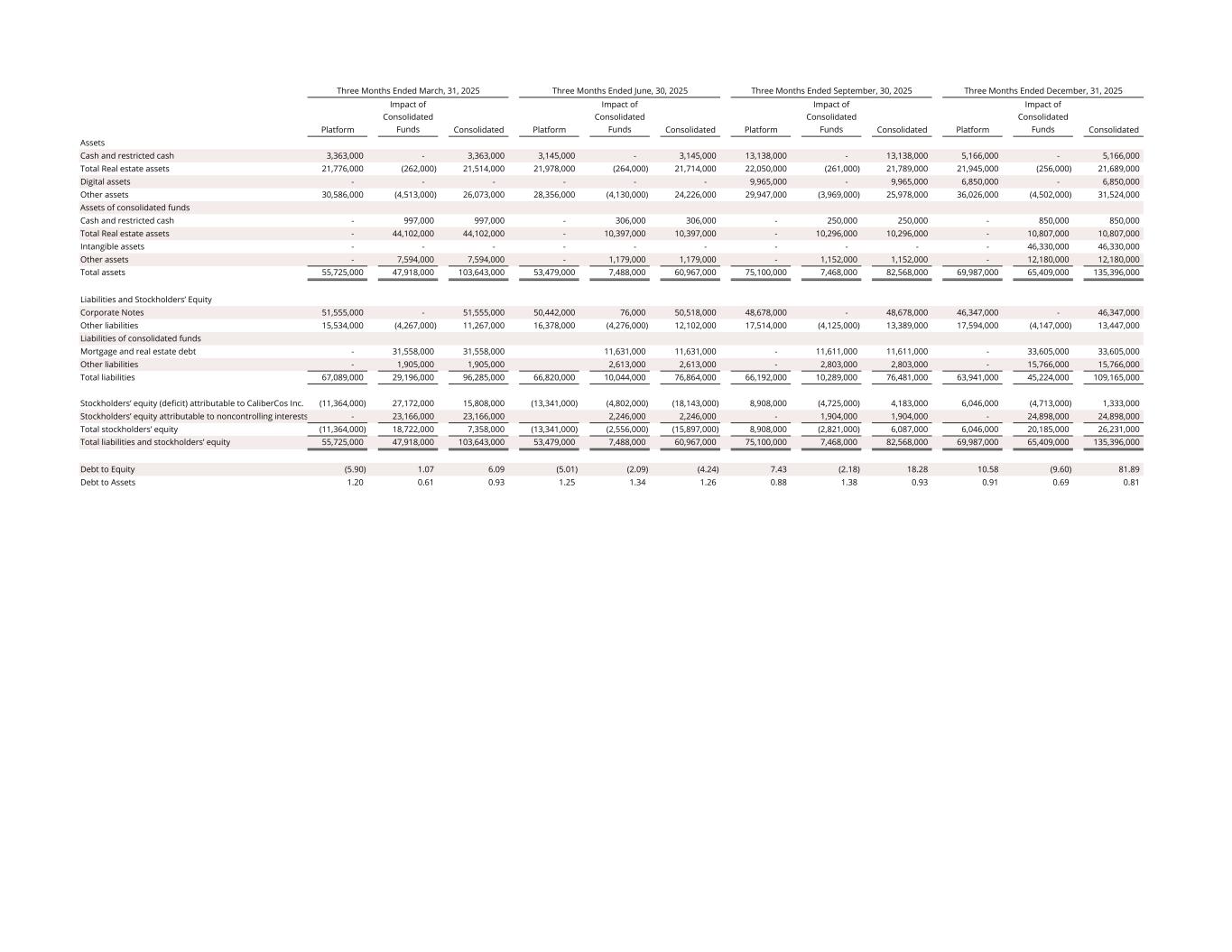 Platform Impact of Consolidated Funds Consolidated Platform Impact of Consolidated Funds Consolidated Platform Impact of Consolidated Funds Consolidated Platform Impact of Consolidated Funds Consolidated Assets Cash and restricted cash 3,363,000 - 3,363,000 3,145,000 - 3,145,000 13,138,000 - 13,138,000 5,166,000 - 5,166,000 Total Real estate assets 21,776,000 (262,000) 21,514,000 21,978,000 (264,000) 21,714,000 22,050,000 (261,000) 21,789,000 21,945,000 (256,000) 21,689,000 Digital assets - - - - - - 9,965,000 - 9,965,000 6,850,000 - 6,850,000 Other assets 30,586,000 (4,513,000) 26,073,000 28,356,000 (4,130,000) 24,226,000 29,947,000 (3,969,000) 25,978,000 36,026,000 (4,502,000) 31,524,000 Assets of consolidated funds Cash and restricted cash - 997,000 997,000 - 306,000 306,000 - 250,000 250,000 - 850,000 850,000 Total Real estate assets - 44,102,000 44,102,000 - 10,397,000 10,397,000 - 10,296,000 10,296,000 - 10,807,000 10,807,000 Intangible assets - - - - - - - - - - 46,330,000 46,330,000 Other assets - 7,594,000 7,594,000 - 1,179,000 1,179,000 - 1,152,000 1,152,000 - 12,180,000 12,180,000 Total assets 55,725,000 47,918,000 103,643,000 53,479,000 7,488,000 60,967,000 75,100,000 7,468,000 82,568,000 69,987,000 65,409,000 135,396,000 Liabilities and Stockholders’ Equity Corporate Notes 51,555,000 - 51,555,000 50,442,000 76,000 50,518,000 48,678,000 - 48,678,000 46,347,000 - 46,347,000 Other liabilities 15,534,000 (4,267,000) 11,267,000 16,378,000 (4,276,000) 12,102,000 17,514,000 (4,125,000) 13,389,000 17,594,000 (4,147,000) 13,447,000 Liabilities of consolidated funds Mortgage and real estate debt - 31,558,000 31,558,000 11,631,000 11,631,000 - 11,611,000 11,611,000 - 33,605,000 33,605,000 Other liabilities - 1,905,000 1,905,000 2,613,000 2,613,000 - 2,803,000 2,803,000 - 15,766,000 15,766,000 Total liabilities 67,089,000 29,196,000 96,285,000 66,820,000 10,044,000 76,864,000 66,192,000 10,289,000 76,481,000 63,941,000 45,224,000 109,165,000 Stockholders’ equity (deficit) attributable to CaliberCos Inc. (11,364,000) 27,172,000 15,808,000 (13,341,000) (4,802,000) (18,143,000) 8,908,000 (4,725,000) 4,183,000 6,046,000 (4,713,000) 1,333,000 Stockholders’ equity attributable to noncontrolling interests - 23,166,000 23,166,000 2,246,000 2,246,000 - 1,904,000 1,904,000 - 24,898,000 24,898,000 Total stockholders’ equity (11,364,000) 18,722,000 7,358,000 (13,341,000) (2,556,000) (15,897,000) 8,908,000 (2,821,000) 6,087,000 6,046,000 20,185,000 26,231,000 Total liabilities and stockholders’ equity 55,725,000 47,918,000 103,643,000 53,479,000 7,488,000 60,967,000 75,100,000 7,468,000 82,568,000 69,987,000 65,409,000 135,396,000 Debt to Equity (5.90) 1.07 6.09 (5.01) (2.09) (4.24) 7.43 (2.18) 18.28 10.58 (9.60) 81.89 Debt to Assets 1.20 0.61 0.93 1.25 1.34 1.26 0.88 1.38 0.93 0.91 0.69 0.81 Three Months Ended March, 31, 2025 Three Months Ended June, 30, 2025 Three Months Ended September, 30, 2025 Three Months Ended December, 31, 2025