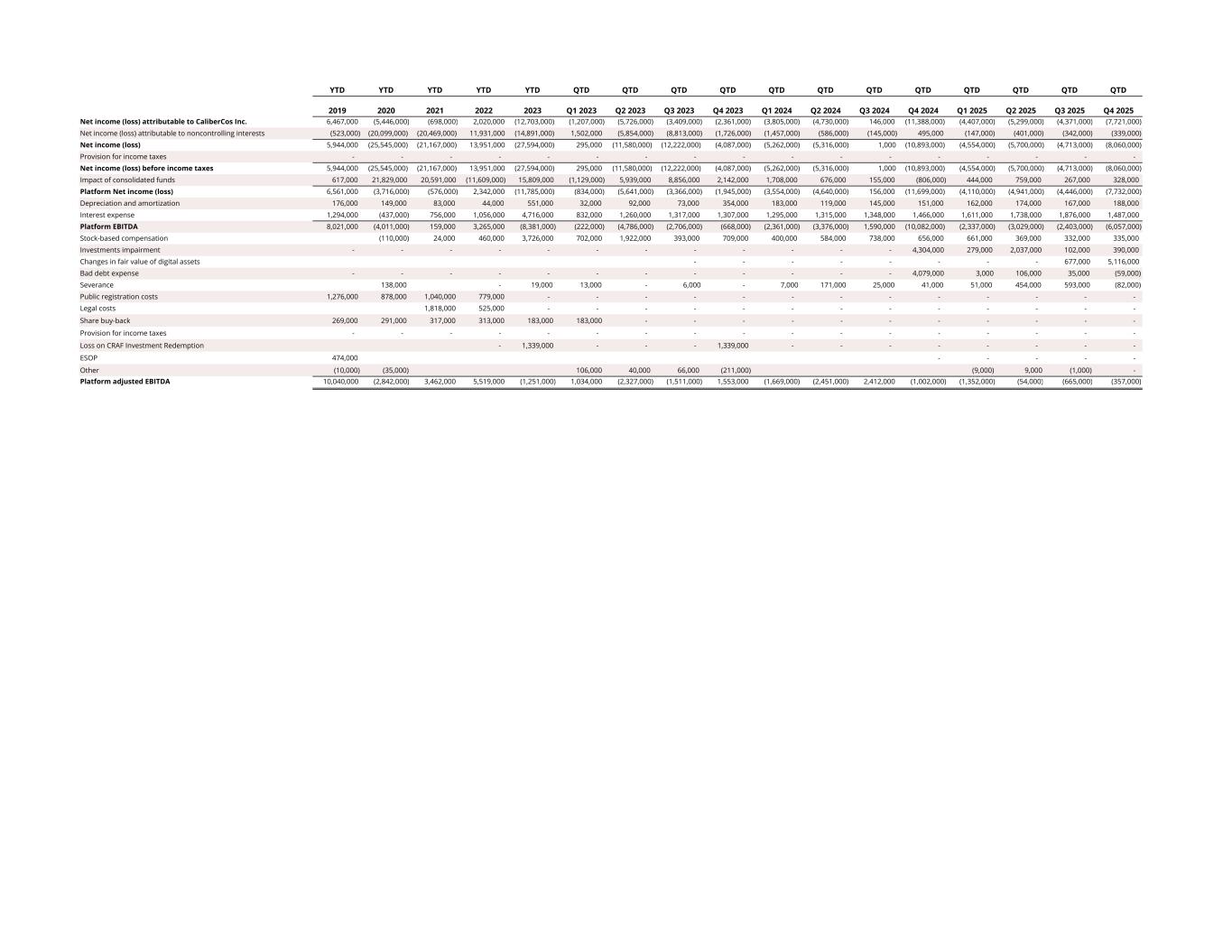YTD YTD YTD YTD YTD QTD QTD QTD QTD QTD QTD QTD QTD QTD QTD QTD QTD 2019 2020 2021 2022 2023 Q1 2023 Q2 2023 Q3 2023 Q4 2023 Q1 2024 Q2 2024 Q3 2024 Q4 2024 Q1 2025 Q2 2025 Q3 2025 Q4 2025 Net income (loss) attributable to CaliberCos Inc. 6,467,000 (5,446,000) (698,000) 2,020,000 (12,703,000) (1,207,000) (5,726,000) (3,409,000) (2,361,000) (3,805,000) (4,730,000) 146,000 (11,388,000) (4,407,000) (5,299,000) (4,371,000) (7,721,000) Net income (loss) attributable to noncontrolling interests (523,000) (20,099,000) (20,469,000) 11,931,000 (14,891,000) 1,502,000 (5,854,000) (8,813,000) (1,726,000) (1,457,000) (586,000) (145,000) 495,000 (147,000) (401,000) (342,000) (339,000) Net income (loss) 5,944,000 (25,545,000) (21,167,000) 13,951,000 (27,594,000) 295,000 (11,580,000) (12,222,000) (4,087,000) (5,262,000) (5,316,000) 1,000 (10,893,000) (4,554,000) (5,700,000) (4,713,000) (8,060,000) Provision for income taxes - - - - - - - - - - - - - - - - - Net income (loss) before income taxes 5,944,000 (25,545,000) (21,167,000) 13,951,000 (27,594,000) 295,000 (11,580,000) (12,222,000) (4,087,000) (5,262,000) (5,316,000) 1,000 (10,893,000) (4,554,000) (5,700,000) (4,713,000) (8,060,000) Impact of consolidated funds 617,000 21,829,000 20,591,000 (11,609,000) 15,809,000 (1,129,000) 5,939,000 8,856,000 2,142,000 1,708,000 676,000 155,000 (806,000) 444,000 759,000 267,000 328,000 Platform Net income (loss) 6,561,000 (3,716,000) (576,000) 2,342,000 (11,785,000) (834,000) (5,641,000) (3,366,000) (1,945,000) (3,554,000) (4,640,000) 156,000 (11,699,000) (4,110,000) (4,941,000) (4,446,000) (7,732,000) Depreciation and amortization 176,000 149,000 83,000 44,000 551,000 32,000 92,000 73,000 354,000 183,000 119,000 145,000 151,000 162,000 174,000 167,000 188,000 Interest expense 1,294,000 (437,000) 756,000 1,056,000 4,716,000 832,000 1,260,000 1,317,000 1,307,000 1,295,000 1,315,000 1,348,000 1,466,000 1,611,000 1,738,000 1,876,000 1,487,000 Platform EBITDA 8,021,000 (4,011,000) 159,000 3,265,000 (8,381,000) (222,000) (4,786,000) (2,706,000) (668,000) (2,361,000) (3,376,000) 1,590,000 (10,082,000) (2,337,000) (3,029,000) (2,403,000) (6,057,000) Stock-based compensation (110,000) 24,000 460,000 3,726,000 702,000 1,922,000 393,000 709,000 400,000 584,000 738,000 656,000 661,000 369,000 332,000 335,000 Investments impairment - - - - - - - - - - - - 4,304,000 279,000 2,037,000 102,000 390,000 Changes in fair value of digital assets - - - - - - - - 677,000 5,116,000 Bad debt expense - - - - - - - - - - - - 4,079,000 3,000 106,000 35,000 (59,000) Severance 138,000 - 19,000 13,000 - 6,000 - 7,000 171,000 25,000 41,000 51,000 454,000 593,000 (82,000) Public registration costs 1,276,000 878,000 1,040,000 779,000 - - - - - - - - - - - - - Legal costs 1,818,000 525,000 - - - - - - - - - - - - - Share buy-back 269,000 291,000 317,000 313,000 183,000 183,000 - - - - - - - - - - - Provision for income taxes - - - - - - - - - - - - - - - - - Loss on CRAF Investment Redemption - 1,339,000 - - - 1,339,000 - - - - - - - - ESOP 474,000 - - - - - Other (10,000) (35,000) 106,000 40,000 66,000 (211,000) (9,000) 9,000 (1,000) - Platform adjusted EBITDA 10,040,000 (2,842,000) 3,462,000 5,519,000 (1,251,000) 1,034,000 (2,327,000) (1,511,000) 1,553,000 (1,669,000) (2,451,000) 2,412,000 (1,002,000) (1,352,000) (54,000) (665,000) (357,000)