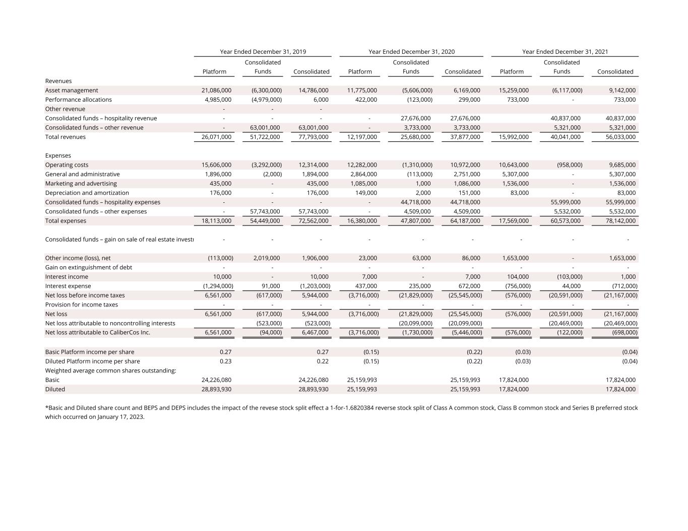 Platform p Consolidated Funds Consolidated Platform p Consolidated Funds Consolidated Platform p Consolidated Funds Consolidated Revenues Asset management 21,086,000 (6,300,000) 14,786,000 11,775,000 (5,606,000) 6,169,000 15,259,000 (6,117,000) 9,142,000 Performance allocations 4,985,000 (4,979,000) 6,000 422,000 (123,000) 299,000 733,000 - 733,000 Other revenue - - - Consolidated funds – hospitality revenue - - - - 27,676,000 27,676,000 40,837,000 40,837,000 Consolidated funds – other revenue - 63,001,000 63,001,000 - 3,733,000 3,733,000 5,321,000 5,321,000 Total revenues 26,071,000 51,722,000 77,793,000 12,197,000 25,680,000 37,877,000 15,992,000 40,041,000 56,033,000 Expenses Operating costs 15,606,000 (3,292,000) 12,314,000 12,282,000 (1,310,000) 10,972,000 10,643,000 (958,000) 9,685,000 General and administrative 1,896,000 (2,000) 1,894,000 2,864,000 (113,000) 2,751,000 5,307,000 - 5,307,000 Marketing and advertising 435,000 - 435,000 1,085,000 1,000 1,086,000 1,536,000 - 1,536,000 Depreciation and amortization 176,000 - 176,000 149,000 2,000 151,000 83,000 - 83,000 Consolidated funds – hospitality expenses - - - - 44,718,000 44,718,000 55,999,000 55,999,000 Consolidated funds – other expenses - 57,743,000 57,743,000 - 4,509,000 4,509,000 5,532,000 5,532,000 Total expenses 18,113,000 54,449,000 72,562,000 16,380,000 47,807,000 64,187,000 17,569,000 60,573,000 78,142,000 Consolidated funds – gain on sale of real estate investm - - - - - - - - - Other income (loss), net (113,000) 2,019,000 1,906,000 23,000 63,000 86,000 1,653,000 - 1,653,000 Gain on extinguishment of debt - - - - - - - - - Interest income 10,000 - 10,000 7,000 - 7,000 104,000 (103,000) 1,000 Interest expense (1,294,000) 91,000 (1,203,000) 437,000 235,000 672,000 (756,000) 44,000 (712,000) Net loss before income taxes 6,561,000 (617,000) 5,944,000 (3,716,000) (21,829,000) (25,545,000) (576,000) (20,591,000) (21,167,000) Provision for income taxes - - - - - - - - - Net loss 6,561,000 (617,000) 5,944,000 (3,716,000) (21,829,000) (25,545,000) (576,000) (20,591,000) (21,167,000) Net loss attributable to noncontrolling interests (523,000) (523,000) (20,099,000) (20,099,000) (20,469,000) (20,469,000) Net loss attributable to CaliberCos Inc. 6,561,000 (94,000) 6,467,000 (3,716,000) (1,730,000) (5,446,000) (576,000) (122,000) (698,000) Basic Platform income per share 0.27 0.27 (0.15) (0.22) (0.03) (0.04) Diluted Platform income per share 0.23 0.22 (0.15) (0.22) (0.03) (0.04) Weighted average common shares outstanding: Basic 24,226,080 24,226,080 25,159,993 25,159,993 17,824,000 17,824,000 Diluted 28,893,930 28,893,930 25,159,993 25,159,993 17,824,000 17,824,000 Year Ended December 31, 2019 Year Ended December 31, 2020 Year Ended December 31, 2021 *Basic and Diluted share count and BEPS and DEPS includes the impact of the revese stock split effect a 1-for-1.6820384 reverse stock split of Class A common stock, Class B common stock and Series B preferred stock which occurred on January 17, 2023.