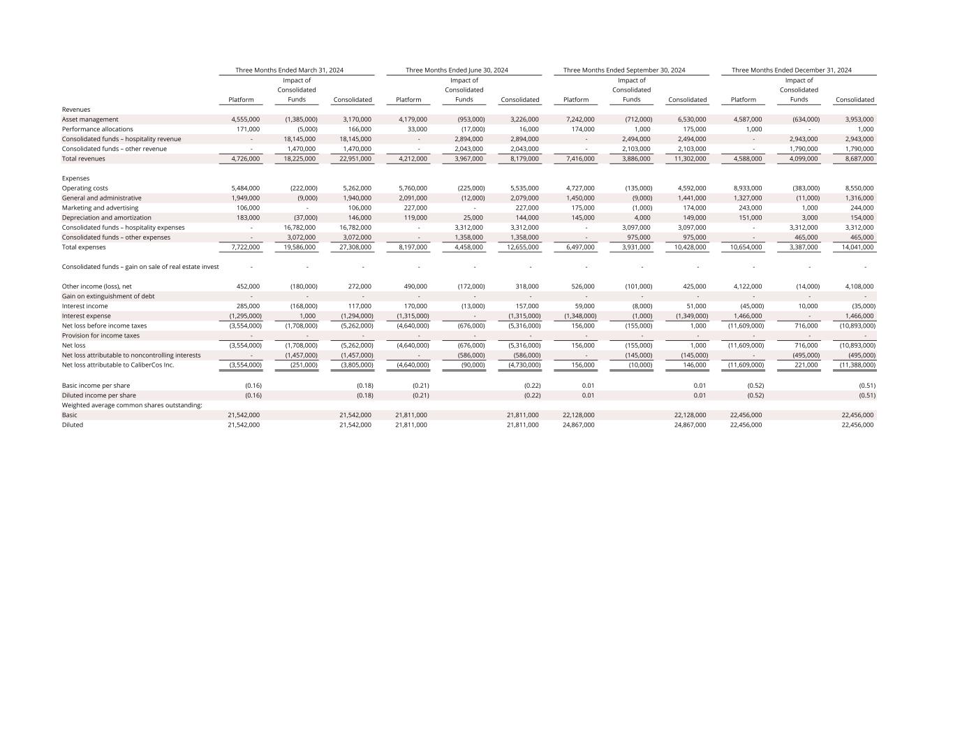 Platform Impact of Consolidated Funds Consolidated Platform Impact of Consolidated Funds Consolidated Platform Impact of Consolidated Funds Consolidated Platform Impact of Consolidated Funds Consolidated Revenues Asset management 4,555,000 (1,385,000) 3,170,000 4,179,000 (953,000) 3,226,000 7,242,000 (712,000) 6,530,000 4,587,000 (634,000) 3,953,000 Performance allocations 171,000 (5,000) 166,000 33,000 (17,000) 16,000 174,000 1,000 175,000 1,000 - 1,000 Consolidated funds – hospitality revenue - 18,145,000 18,145,000 - 2,894,000 2,894,000 - 2,494,000 2,494,000 - 2,943,000 2,943,000 Consolidated funds – other revenue - 1,470,000 1,470,000 - 2,043,000 2,043,000 - 2,103,000 2,103,000 - 1,790,000 1,790,000 Total revenues 4,726,000 18,225,000 22,951,000 4,212,000 3,967,000 8,179,000 7,416,000 3,886,000 11,302,000 4,588,000 4,099,000 8,687,000 Expenses Operating costs 5,484,000 (222,000) 5,262,000 5,760,000 (225,000) 5,535,000 4,727,000 (135,000) 4,592,000 8,933,000 (383,000) 8,550,000 General and administrative 1,949,000 (9,000) 1,940,000 2,091,000 (12,000) 2,079,000 1,450,000 (9,000) 1,441,000 1,327,000 (11,000) 1,316,000 Marketing and advertising 106,000 - 106,000 227,000 - 227,000 175,000 (1,000) 174,000 243,000 1,000 244,000 Depreciation and amortization 183,000 (37,000) 146,000 119,000 25,000 144,000 145,000 4,000 149,000 151,000 3,000 154,000 Consolidated funds – hospitality expenses - 16,782,000 16,782,000 - 3,312,000 3,312,000 - 3,097,000 3,097,000 - 3,312,000 3,312,000 Consolidated funds – other expenses - 3,072,000 3,072,000 - 1,358,000 1,358,000 - 975,000 975,000 - 465,000 465,000 Total expenses 7,722,000 19,586,000 27,308,000 8,197,000 4,458,000 12,655,000 6,497,000 3,931,000 10,428,000 10,654,000 3,387,000 14,041,000 Consolidated funds – gain on sale of real estate invest - - - - - - - - - - - - Other income (loss), net 452,000 (180,000) 272,000 490,000 (172,000) 318,000 526,000 (101,000) 425,000 4,122,000 (14,000) 4,108,000 Gain on extinguishment of debt - - - - - - - - - - - - Interest income 285,000 (168,000) 117,000 170,000 (13,000) 157,000 59,000 (8,000) 51,000 (45,000) 10,000 (35,000) Interest expense (1,295,000) 1,000 (1,294,000) (1,315,000) - (1,315,000) (1,348,000) (1,000) (1,349,000) 1,466,000 - 1,466,000 Net loss before income taxes (3,554,000) (1,708,000) (5,262,000) (4,640,000) (676,000) (5,316,000) 156,000 (155,000) 1,000 (11,609,000) 716,000 (10,893,000) Provision for income taxes - - - - - - - - - - - - Net loss (3,554,000) (1,708,000) (5,262,000) (4,640,000) (676,000) (5,316,000) 156,000 (155,000) 1,000 (11,609,000) 716,000 (10,893,000) Net loss attributable to noncontrolling interests - (1,457,000) (1,457,000) - (586,000) (586,000) - (145,000) (145,000) - (495,000) (495,000) Net loss attributable to CaliberCos Inc. (3,554,000) (251,000) (3,805,000) (4,640,000) (90,000) (4,730,000) 156,000 (10,000) 146,000 (11,609,000) 221,000 (11,388,000) Basic income per share (0.16) (0.18) (0.21) (0.22) 0.01 0.01 (0.52) (0.51) Diluted income per share (0.16) (0.18) (0.21) (0.22) 0.01 0.01 (0.52) (0.51) Weighted average common shares outstanding: Basic 21,542,000 21,542,000 21,811,000 21,811,000 22,128,000 22,128,000 22,456,000 22,456,000 Diluted 21,542,000 21,542,000 21,811,000 21,811,000 24,867,000 24,867,000 22,456,000 22,456,000 Three Months Ended March 31, 2024 Three Months Ended June 30, 2024 Three Months Ended December 31, 2024 Three Months Ended September 30, 2024