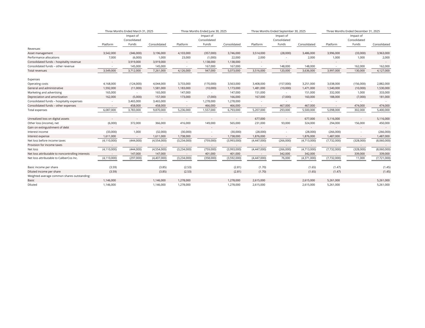 Platform Impact of Consolidated Funds Consolidated Platform Impact of Consolidated Funds Consolidated Platform Impact of Consolidated Funds Consolidated Platform Impact of Consolidated Funds Consolidated Revenues Asset management 3,542,000 (346,000) 3,196,000 4,103,000 (357,000) 3,746,000 3,514,000 (28,000) 3,486,000 3,996,000 (33,000) 3,963,000 Performance allocations 7,000 (6,000) 1,000 23,000 (1,000) 22,000 2,000 - 2,000 1,000 1,000 2,000 Consolidated funds – hospitality revenue - 3,919,000 3,919,000 - 1,138,000 1,138,000 - - - - - - Consolidated funds – other revenue - 145,000 145,000 - 167,000 167,000 - 148,000 148,000 - 162,000 162,000 Total revenues 3,549,000 3,712,000 7,261,000 4,126,000 947,000 5,073,000 3,516,000 120,000 3,636,000 3,997,000 130,000 4,127,000 Expenses Operating costs 4,168,000 (124,000) 4,044,000 3,733,000 (170,000) 3,563,000 3,408,000 (157,000) 3,251,000 3,038,000 (156,000) 2,882,000 General and administrative 1,592,000 (11,000) 1,581,000 1,183,000 (10,000) 1,173,000 1,481,000 (10,000) 1,471,000 1,540,000 (10,000) 1,530,000 Marketing and advertising 165,000 - 165,000 147,000 - 147,000 151,000 - 151,000 332,000 1,000 333,000 Depreciation and amortization 162,000 (5,000) 157,000 173,000 (7,000) 166,000 167,000 (7,000) 160,000 188,000 (7,000) 181,000 Consolidated funds – hospitality expenses - 3,465,000 3,465,000 - 1,278,000 1,278,000 - - - - - - Consolidated funds – other expenses - 458,000 458,000 - 466,000 466,000 - 467,000 467,000 - 474,000 474,000 Total expenses 6,087,000 3,783,000 9,870,000 5,236,000 1,557,000 6,793,000 5,207,000 293,000 5,500,000 5,098,000 302,000 5,400,000 Unrealized loss on digital assets - - - - - - 677,000 - 677,000 5,116,000 - 5,116,000 Other loss (income), net (6,000) 372,000 366,000 416,000 149,000 565,000 231,000 93,000 324,000 294,000 156,000 450,000 Gain on extinguishment of debt - - - - - - - - - - - - Interest income (33,000) 1,000 (32,000) (30,000) - (30,000) (28,000) - (28,000) (266,000) - (266,000) Interest expense 1,611,000 - 1,611,000 1,738,000 - 1,738,000 1,876,000 - 1,876,000 1,487,000 - 1,487,000 Net loss before income taxes (4,110,000) (444,000) (4,554,000) (3,234,000) (759,000) (3,993,000) (4,447,000) (266,000) (4,713,000) (7,732,000) (328,000) (8,060,000) Provision for income taxes - - - - - - - - - - - - Net loss (4,110,000) (444,000) (4,554,000) (3,234,000) (759,000) (3,993,000) (4,447,000) (266,000) (4,713,000) (7,732,000) (328,000) (8,060,000) Net loss attributable to noncontrolling interests - 147,000 147,000 - 401,000 401,000 - 342,000 342,000 - 339,000 339,000 Net loss attributable to CaliberCos Inc. (4,110,000) (297,000) (4,407,000) (3,234,000) (358,000) (3,592,000) (4,447,000) 76,000 (4,371,000) (7,732,000) 11,000 (7,721,000) Basic income per share (3.59) (3.85) (2.53) (2.81) (1.70) (1.65) (1.47) (1.45) Diluted income per share (3.59) (3.85) (2.53) (2.81) (1.70) (1.65) (1.47) (1.45) Weighted average common shares outstanding: Basic 1,146,000 1,146,000 1,278,000 1,278,000 2,615,000 2,615,000 5,261,000 5,261,000 Diluted 1,146,000 1,146,000 1,278,000 1,278,000 2,615,000 2,615,000 5,261,000 5,261,000 Three Months Ended March 31, 2025 Three Months Ended June 30, 2025 Three Months Ended September 30, 2025 Three Months Ended December 31, 2025
