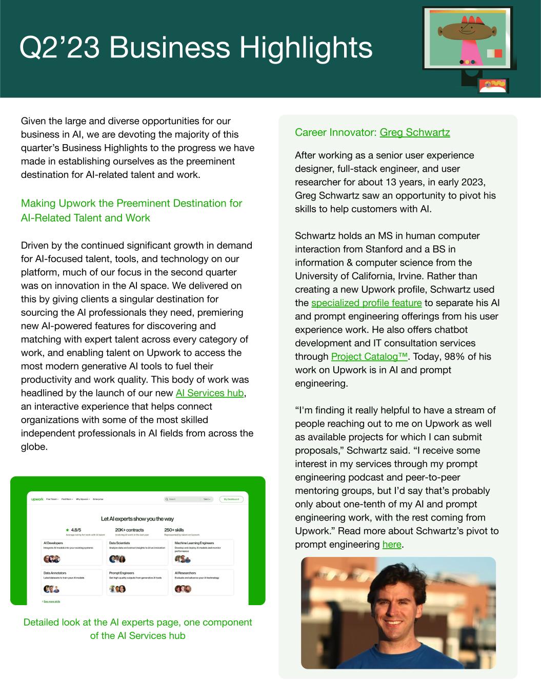 Given the large and diverse opportunities for our business in AI, we are devoting the majority of this quarter’s Business Highlights to the progress we have made in establishing ourselves as the preeminent destination for AI-related talent and work. Making Upwork the Preeminent Destination for AI-Related Talent and Work Driven by the continued significant growth in demand for AI-focused talent, tools, and technology on our platform, much of our focus in the second quarter was on innovation in the AI space. We delivered on this by giving clients a singular destination for sourcing the AI professionals they need, premiering new AI-powered features for discovering and matching with expert talent across every category of work, and enabling talent on Upwork to access the most modern generative AI tools to fuel their productivity and work quality. This body of work was headlined by the launch of our new AI Services hub, an interactive experience that helps connect organizations with some of the most skilled independent professionals in AI fields from across the globe. Detailed look at the AI experts page, one component of the AI Services hub Q2’23 Business Highlights 4 Career Innovator: Greg Schwartz After working as a senior user experience designer, full-stack engineer, and user researcher for about 13 years, in early 2023, Greg Schwartz saw an opportunity to pivot his skills to help customers with AI. Schwartz holds an MS in human computer interaction from Stanford and a BS in information & computer science from the University of California, Irvine. Rather than creating a new Upwork profile, Schwartz used the specialized profile feature to separate his AI and prompt engineering offerings from his user experience work. He also offers chatbot development and IT consultation services through Project Catalog™. Today, 98% of his work on Upwork is in AI and prompt engineering. “I'm finding it really helpful to have a stream of people reaching out to me on Upwork as well as available projects for which I can submit proposals,” Schwartz said. “I receive some interest in my services through my prompt engineering podcast and peer-to-peer mentoring groups, but I’d say that’s probably only about one-tenth of my AI and prompt engineering work, with the rest coming from Upwork.” Read more about Schwartz’s pivot to prompt engineering here.