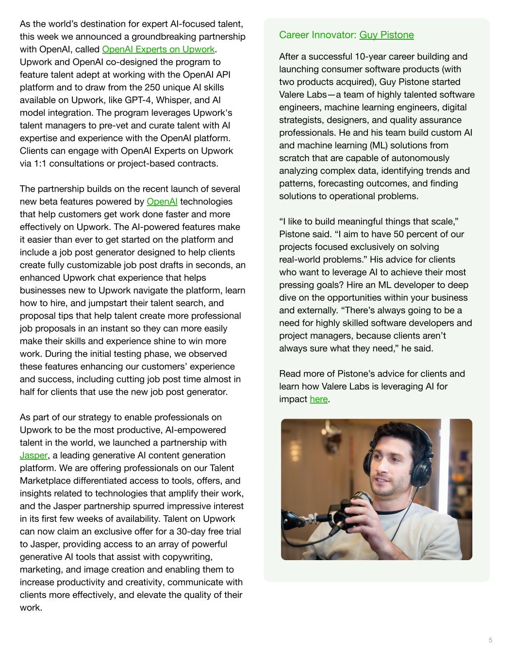 As the world’s destination for expert AI-focused talent, this week we announced a groundbreaking partnership with OpenAI, called OpenAI Experts on Upwork. Upwork and OpenAI co-designed the program to feature talent adept at working with the OpenAI API platform and to draw from the 250 unique AI skills available on Upwork, like GPT-4, Whisper, and AI model integration. The program leverages Upwork's talent managers to pre-vet and curate talent with AI expertise and experience with the OpenAI platform. Clients can engage with OpenAI Experts on Upwork via 1:1 consultations or project-based contracts. The partnership builds on the recent launch of several new beta features powered by OpenAI technologies that help customers get work done faster and more effectively on Upwork. The AI-powered features make it easier than ever to get started on the platform and include a job post generator designed to help clients create fully customizable job post drafts in seconds, an enhanced Upwork chat experience that helps businesses new to Upwork navigate the platform, learn how to hire, and jumpstart their talent search, and proposal tips that help talent create more professional job proposals in an instant so they can more easily make their skills and experience shine to win more work. During the initial testing phase, we observed these features enhancing our customers’ experience and success, including cutting job post time almost in half for clients that use the new job post generator. As part of our strategy to enable professionals on Upwork to be the most productive, AI-empowered talent in the world, we launched a partnership with Jasper, a leading generative AI content generation platform. We are offering professionals on our Talent Marketplace differentiated access to tools, offers, and insights related to technologies that amplify their work, and the Jasper partnership spurred impressive interest in its first few weeks of availability. Talent on Upwork can now claim an exclusive offer for a 30-day free trial to Jasper, providing access to an array of powerful generative AI tools that assist with copywriting, marketing, and image creation and enabling them to increase productivity and creativity, communicate with clients more effectively, and elevate the quality of their work. 5 Career Innovator: Marcus Grimm “I was let go from my job in July 2020, when the agency I was working for downsized during the early months of the pandemic. It was the first time that I had ever lost a job. Our youngest was going into his last year of college—one of our last years of super big expenses. I was a middle-aged person, mid-career. I wasn’t sure what I was going to do,” said Marcus Grimm, marketing automation & strategy expert. A friend recommended that Grimm establish a profile on Upwork. It took a few weeks, but he quickly started building relationships on the platform and soon had enough work that he longer had to apply for jobs—they started coming to him. “After I'd done a few jobs, I told my wife that I didn't think I needed to search for traditional jobs anymore. I felt that freelancing was a better lifestyle. Fast-forward to today, and the crazy thing is that this year I will earn much more than I’ve ever made in my life in a year. The stability has given us the ability to purchase a second home, where we can spend as much time as we want. I love the life freelancing has afforded us. I haven’t lost one minute of sleep since I lost my job because there are just so many opportunities for me on Upwork. I just have to make sure I don’t fill my calendar with too much work!” Career Innovator: Guy Pistone After a successful 10-year career building and launching consumer software products (with two products acquired), Guy Pistone started Valere Labs—a team of highly talented software engineers, machine learning engineers, digital strategists, designers, and quality assurance professionals. He and his team build custom AI and machine learning (ML) solutions from scratch that are capable of autonomously analyzing complex data, identifying trends and patterns, forecasting outcomes, and finding solutions to operational problems. “I like to build meaningful things that scale,” Pistone said. “I aim to have 50 percent of our projects focused ex lusively on solving real-world problems.” His advice for clients who want to lever ge AI to a hieve their most pressing goals? Hire an ML developer to deep dive on the opportunities within your business and externally. “There’s always going to be a need for highly skilled software developers and project managers, because clients aren’t always sure what they need,” he said. Read more of Pistone’s advice for clients and learn how Valere Labs is leveraging AI for impact here.