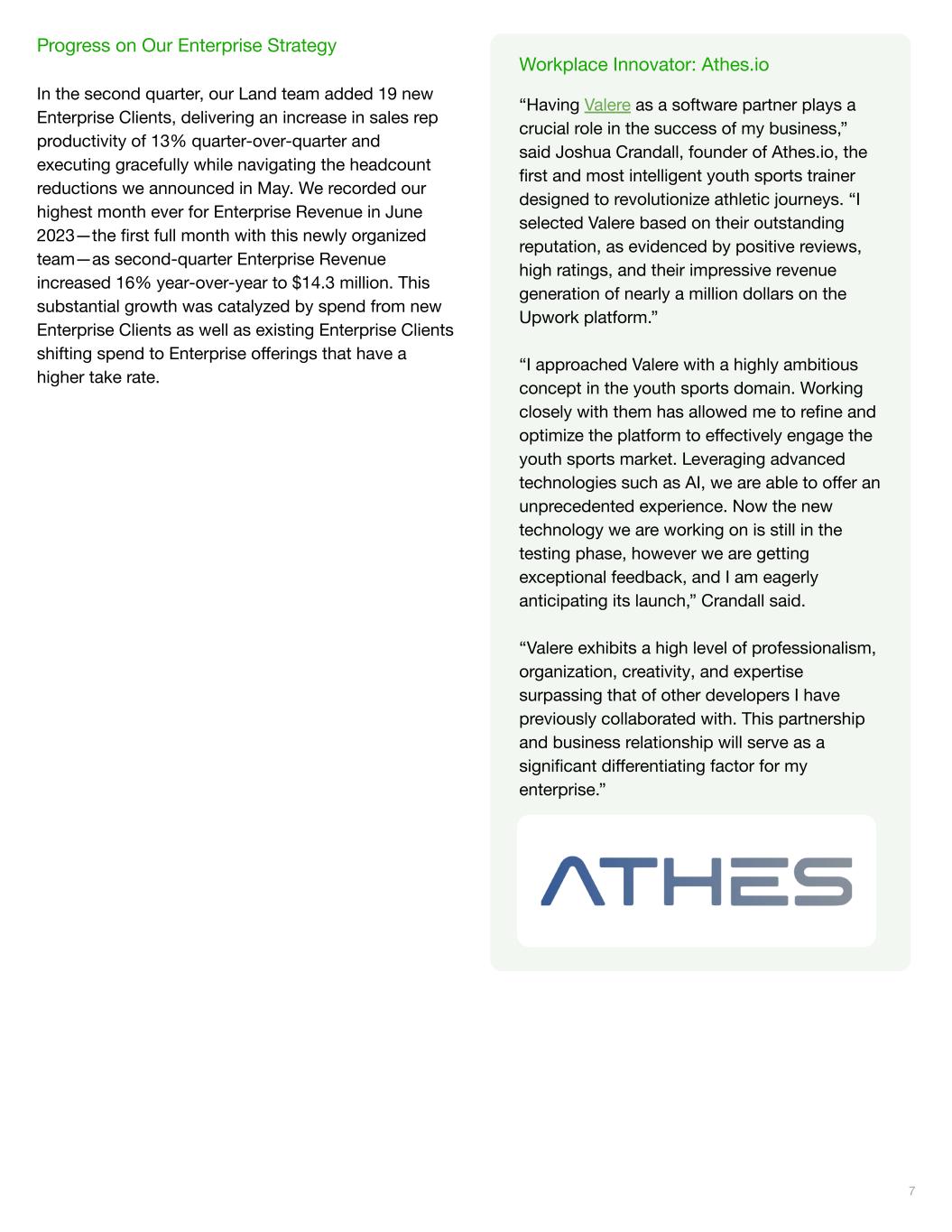 Progress on Our Enterprise Strategy In the second quarter, our Land team added 19 new Enterprise Clients, delivering an increase in sales rep productivity of 13% quarter-over-quarter and executing gracefully while navigating the headcount reductions we announced in May. We recorded our highest month ever for Enterprise Revenue in June 2023—the first full month with this newly organized team—as second-quarter Enterprise Revenue increased 16% year-over-year to $14.3 million. This substantial growth was catalyzed by spend from new Enterprise Clients as well as existing Enterprise Clients shifting spend to Enterprise offerings that have a higher take rate. 7 Workplace Innovator: Athes.io “Having Valere as a software partner plays a crucial role in the success of my business,” said Joshua Crandall, founder of Athes.io, the first and most intelligent youth sports trainer designed to revolutionize athletic journeys. “I selected Valere based on their outstanding reputation, as evidenced by positive reviews, high ratings, and their impressive revenue generation of nearly a million dollars on the Upwork platform.” “I approached Valere with a highly ambitious concept in the youth sports domain. Working closely with them has allowed me to refine and optimize the platform to effectively engage the youth sports market. Leveraging advanced technologies such as AI, we are able to offer an unprecedented experience. Now the new technology we are working on is still in the testing phase, however we are getting exceptional feedback, and I am eagerly anticipating its launch,” Crandall said. “Valere exhibits a high level of professionalism, organization, creativity, and expertise surpassing that of other developers I have previously collaborated with. This partnership and business relationship will serve as a significant differentiating factor for my enterprise.”