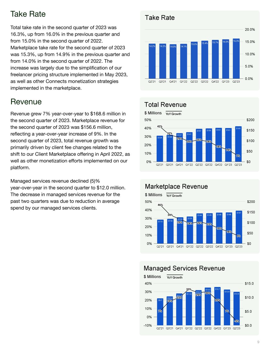 Take Rate Total take rate in the second quarter of 2023 was 16.3%, up from 16.0% in the previous quarter and from 15.0% in the second quarter of 2022. Marketplace take rate for the second quarter of 2023 was 15.3%, up from 14.9% in the previous quarter and from 14.0% in the second quarter of 2022. The increase was largely due to the simplification of our freelancer pricing structure implemented in May 2023, as well as other Connects monetization strategies implemented in the marketplace. Revenue Revenue grew 7% year-over-year to $168.6 million in the second quarter of 2023. Marketplace revenue for the second quarter of 2023 was $156.6 million, reflecting a year-over-year increase of 9%. In the second quarter of 2023, total revenue growth was primarily driven by client fee changes related to the shift to our Client Marketplace offering in April 2022, as well as other monetization efforts implemented on our platform. Managed services revenue declined (5)% year-over-year in the second quarter to $12.0 million. The decrease in managed services revenue for the past two quarters was due to reduction in average spend by our managed services clients. 9