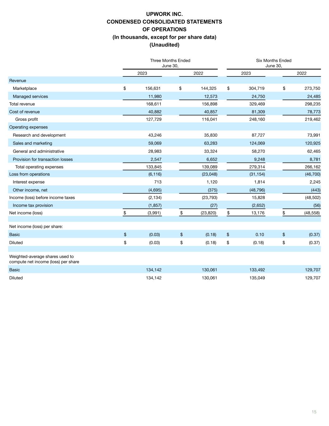 15 UPWORK INC. CONDENSED CONSOLIDATED STATEMENTS OF OPERATIONS (In thousands, except for per share data) (Unaudited) Three Months Ended June 30, Six Months Ended June 30, 2023 2022 2023 2022 Revenue Marketplace $ 156,631 $ 144,325 $ 304,719 $ 273,750 Managed services 11,980 12,573 24,750 24,485 Total revenue 168,611 156,898 329,469 298,235 Cost of revenue 40,882 40,857 81,309 78,773 Gross profit 127,729 116,041 248,160 219,462 Operating expenses Research and development 43,246 35,830 87,727 73,991 Sales and marketing 59,069 63,283 124,069 120,925 General and administrative 28,983 33,324 58,270 62,465 Provision for transaction losses 2,547 6,652 9,248 8,781 Total operating expenses 133,845 139,089 279,314 266,162 Loss from operations (6,116) (23,048) (31,154) (46,700) Interest expense 713 1,120 1,814 2,245 Other income, net (4,695) (375) (48,796) (443) Income (loss) before income taxes (2,134) (23,793) 15,828 (48,502) Income tax provision (1,857) (27) (2,652) (56) Net income (loss) $ (3,991) $ (23,820) $ 13,176 $ (48,558) Net income (loss) per share: Basic $ (0.03) $ (0.18) $ 0.10 $ (0.37) Diluted $ (0.03) $ (0.18) $ (0.18) $ (0.37) Weighted-average shares used to compute net income (loss) per share Basic 134,142 130,061 133,492 129,707 Diluted 134,142 130,061 135,049 129,707