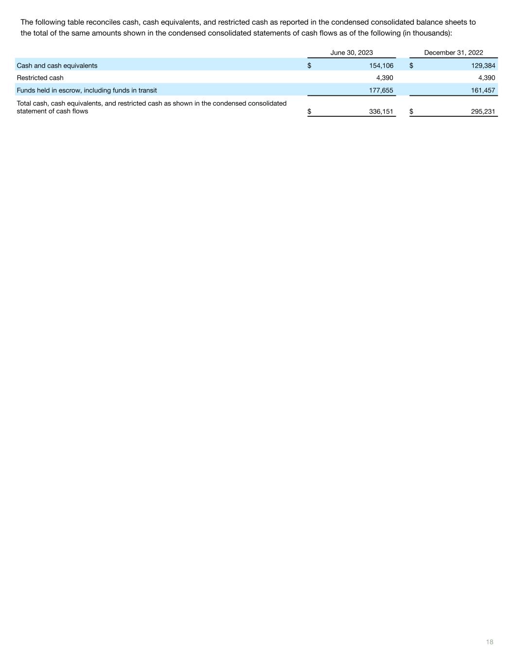 The following table reconciles cash, cash equivalents, and restricted cash as reported in the condensed consolidated balance sheets to the total of the same amounts shown in the condensed consolidated statements of cash flows as of the following (in thousands): 18 June 30, 2023 December 31, 2022 Cash and cash equivalents $ 154,106 $ 129,384 Restricted cash 4,390 4,390 Funds held in escrow, including funds in transit 177,655 161,457 Total cash, cash equivalents, and restricted cash as shown in the condensed consolidated statement of cash flows $ 336,151 $ 295,231
