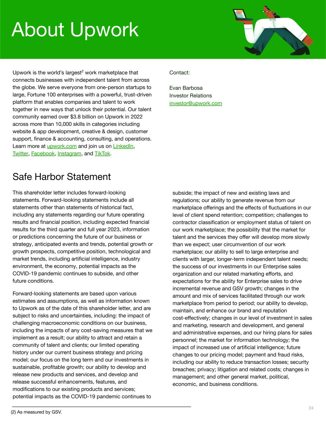 subside; the impact of new and existing laws and regulations; our ability to generate revenue from our marketplace offerings and the effects of fluctuations in our level of client spend retention; competition; challenges to contractor classification or employment status of talent on our work marketplace; the possibility that the market for talent and the services they offer will develop more slowly than we expect; user circumvention of our work marketplace; our ability to sell to large enterprise and clients with larger, longer-term independent talent needs; the success of our investments in our Enterprise sales organization and our related marketing efforts, and expectations for the ability for Enterprise sales to drive incremental revenue and GSV growth; changes in the amount and mix of services facilitated through our work marketplace from period to period; our ability to develop, maintain, and enhance our brand and reputation cost-effectively; changes in our level of investment in sales and marketing, research and development, and general and administrative expenses, and our hiring plans for sales personnel; the market for information technology; the impact of increased use of artificial intelligence; future changes to our pricing model; payment and fraud risks, including our ability to reduce transaction losses; security breaches; privacy; litigation and related costs; changes in management; and other general market, political, economic, and business conditions. Ken Blanchard and Scott Blanchard About Upwork Upwork is the world’s largest2 work marketplace that connects businesses with independent talent from across the globe. We serve everyone from one-person startups to large, Fortune 100 enterprises with a powerful, trust-driven platform that enables companies and talent to work together in new ways that unlock their potential. Our talent community earned over $3.8 billion on Upwork in 2022 across more than 10,000 skills in categories including website & app development, creative & design, customer support, finance & accounting, consulting, and operations. Learn more at upwork.com and join us on LinkedIn, Twitter, Facebook, Instagram, and TikTok. Safe Harbor Statement This shareholder letter includes forward-looking statements. Forward-looking statements include all statements other than statements of historical fact, including any statements regarding our future operating results and financial position, including expected financial results for the third quarter and full year 2023, information or predictions concerning the future of our business or strategy, anticipated events and trends, potential growth or growth prospects, competitive position, technological and market trends, including artificial intelligence, industry environment, the economy, potential impacts as the COVID-19 pandemic continues to subside, and other future conditions. Forward-looking statements are based upon various estimates and assumptions, as well as information known to Upwork as of the date of this shareholder letter, and are subject to risks and uncertainties, including: the impact of challenging macroeconomic conditions on our business, including the impacts of any cost-saving measures that we implement as a result; our ability to attract and retain a community of talent and clients; our limited operating history under our current business strategy and pricing model; our focus on the long term and our investments in sustainable, profitable growth; our ability to develop and release new products and services, and develop and release successful enhancements, features, and modifications to our existing products and services; potential impacts as the COVID-19 pandemic continues to 24 Contact: Evan Barbosa Investor Relations investor@upwork.com (2) As measured by GSV.