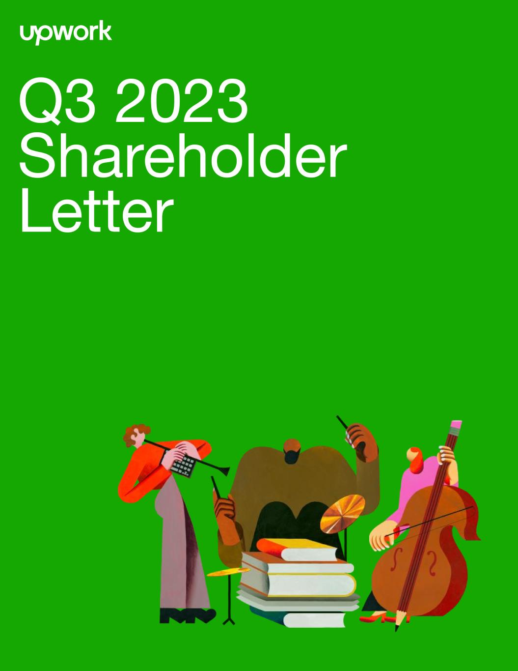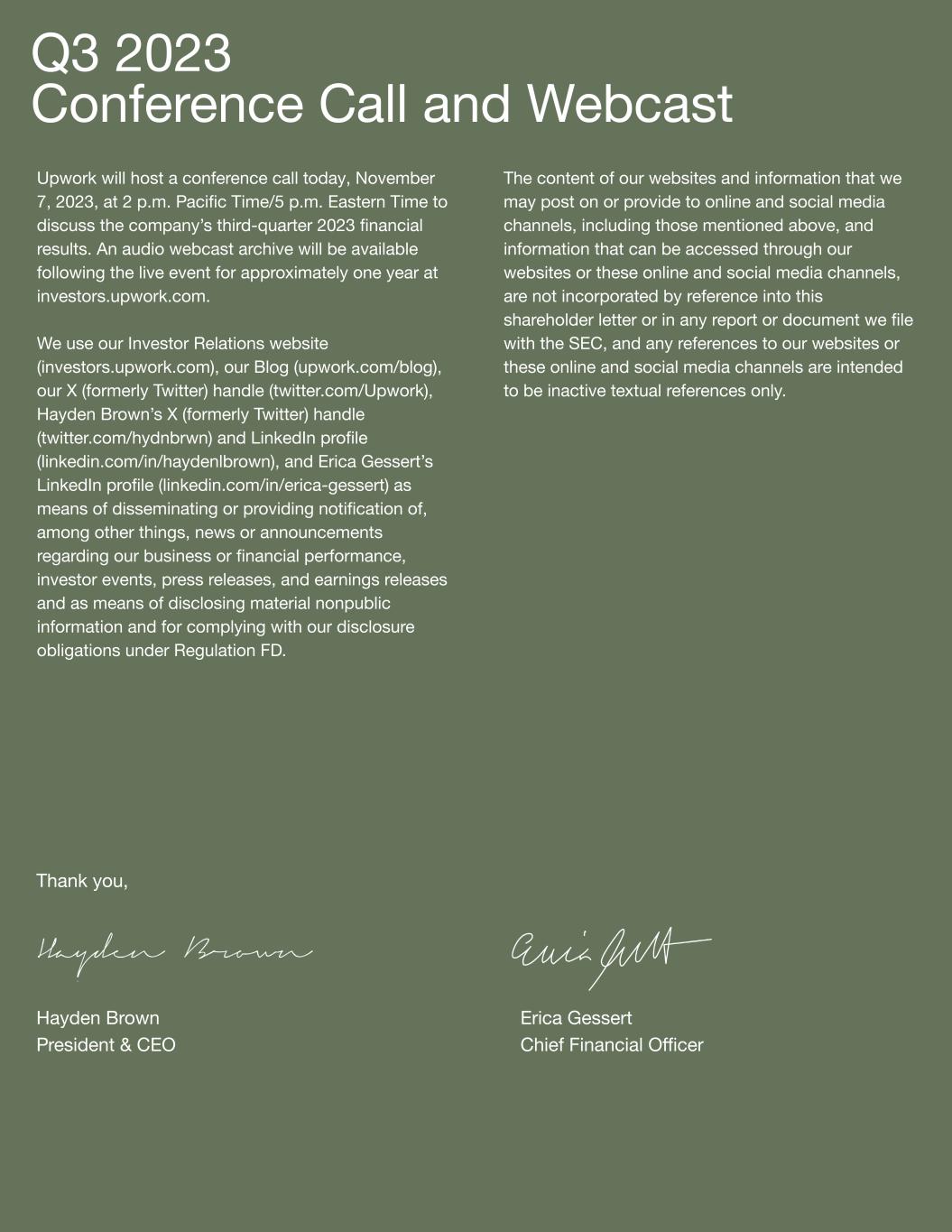 Upwork will host a conference call today, November 7, 2023, at 2 p.m. Pacific Time/5 p.m. Eastern Time to discuss the company’s third-quarter 2023 financial results. An audio webcast archive will be available following the live event for approximately one year at investors.upwork.com. We use our Investor Relations website (investors.upwork.com), our Blog (upwork.com/blog), our X (formerly Twitter) handle (twitter.com/Upwork), Hayden Brown’s X (formerly Twitter) handle (twitter.com/hydnbrwn) and LinkedIn profile (linkedin.com/in/haydenlbrown), and Erica Gessert’s LinkedIn profile (linkedin.com/in/erica-gessert) as means of disseminating or providing notification of, among other things, news or announcements regarding our business or financial performance, investor events, press releases, and earnings releases and as means of disclosing material nonpublic information and for complying with our disclosure obligations under Regulation FD. The content of our websites and information that we may post on or provide to online and social media channels, including those mentioned above, and information that can be accessed through our websites or these online and social media channels, are not incorporated by reference into this shareholder letter or in any report or document we file with the SEC, and any references to our websites or these online and social media channels are intended to be inactive textual references only. Q3 2023 Conference Call and Webcast Thank you, Hayden Brown President & CEO Erica Gessert Chief Financial Officer