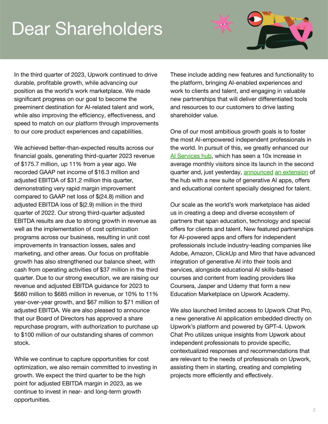 These include adding new features and functionality to the platform, bringing AI-enabled experiences and work to clients and talent, and engaging in valuable new partnerships that will deliver differentiated tools and resources to our customers to drive lasting shareholder value. One of our most ambitious growth goals is to foster the most AI-empowered independent professionals in the world. In pursuit of this, we greatly enhanced our AI Services hub, which has seen a 10x increase in average monthly visitors since its launch in the second quarter and, just yesterday, announced an extension of the hub with a new suite of generative AI apps, offers and educational content specially designed for talent. Our scale as the world’s work marketplace has aided us in creating a deep and diverse ecosystem of partners that span education, technology and special offers for clients and talent. New featured partnerships for AI-powered apps and offers for independent professionals include industry-leading companies like Adobe, Amazon, ClickUp and Miro that have advanced integration of generative AI into their tools and services, alongside educational AI skills-based courses and content from leading providers like Coursera, Jasper and Udemy that form a new Education Marketplace on Upwork Academy. We also launched limited access to Upwork Chat Pro, a new generative AI application embedded directly on Upwork’s platform and powered by GPT-4. Upwork Chat Pro utilizes unique insights from Upwork about independent professionals to provide specific, contextualized responses and recommendations that are relevant to the needs of professionals on Upwork, assisting them in starting, creating and completing projects more efficiently and effectively. In the third quarter of 2023, Upwork continued to drive durable, profitable growth, while advancing our position as the world’s work marketplace. We made significant progress on our goal to become the preeminent destination for AI-related talent and work, while also improving the efficiency, effectiveness, and speed to match on our platform through improvements to our core product experiences and capabilities. We achieved better-than-expected results across our financial goals, generating third-quarter 2023 revenue of $175.7 million, up 11% from a year ago. We recorded GAAP net income of $16.3 million and adjusted EBITDA of $31.2 million this quarter, demonstrating very rapid margin improvement compared to GAAP net loss of $(24.8) million and adjusted EBITDA loss of $(2.9) million in the third quarter of 2022. Our strong third-quarter adjusted EBITDA results are due to strong growth in revenue as well as the implementation of cost optimization programs across our business, resulting in unit cost improvements in transaction losses, sales and marketing, and other areas. Our focus on profitable growth has also strengthened our balance sheet, with cash from operating activities of $37 million in the third quarter. Due to our strong execution, we are raising our revenue and adjusted EBITDA guidance for 2023 to $680 million to $685 million in revenue, or 10% to 11% year-over-year growth, and $67 million to $71 million of adjusted EBITDA. We are also pleased to announce that our Board of Directors has approved a share repurchase program, with authorization to purchase up to $100 million of our outstanding shares of common stock. While we continue to capture opportunities for cost optimization, we also remain committed to investing in growth. We expect the third quarter to be the high point for adjusted EBITDA margin in 2023, as we continue to invest in near- and long-term growth opportunities. Dear Shareholders 2