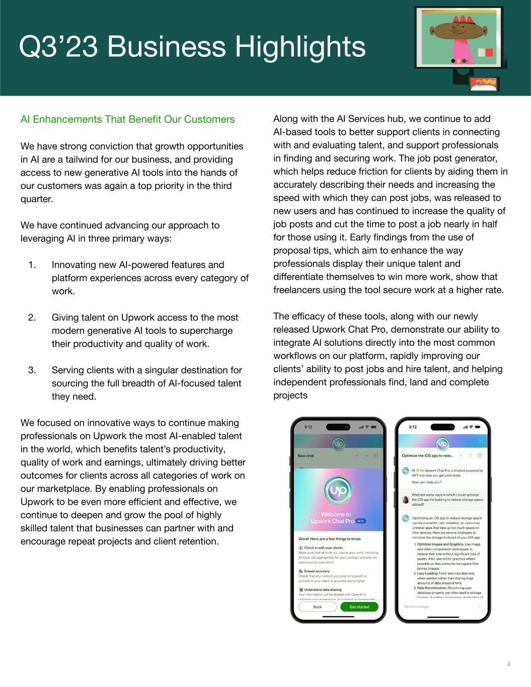 AI Enhancements That Benefit Our Customers We have strong conviction that growth opportunities in AI are a tailwind for our business, and providing access to new generative AI tools into the hands of our customers was again a top priority in the third quarter. We have continued advancing our approach to leveraging AI in three primary ways: 1. Innovating new AI-powered features and platform experiences across every category of work. 2. Giving talent on Upwork access to the most modern generative AI tools to supercharge their productivity and quality of work. 3. Serving clients with a singular destination for sourcing the full breadth of AI-focused talent they need. We focused on innovative ways to continue making professionals on Upwork the most AI-enabled talent in the world, which benefits talent’s productivity, quality of work and earnings, ultimately driving better outcomes for clients across all categories of work on our marketplace. By enabling professionals on Upwork to be even more efficient and effective, we continue to deepen and grow the pool of highly skilled talent that businesses can partner with and encourage repeat projects and client retention. Q3’23 Business Highlights 44 Along with the AI Services hub, we continue to add AI-based tools to better support clients in connecting with and evaluating talent, and support professionals in finding and securing work. The job post generator, which helps reduce friction for clients by aiding them in accurately describing their needs and increasing the speed with which they can post jobs, was released to new users and has continued to increase the quality of job posts and cut the time to post a job nearly in half for those using it. Early findings from the use of proposal tips, which aim to enhance the way professionals display their unique talent and differentiate themselves to win more work, show that freelancers using the tool secure work at a higher rate. The efficacy of these tools, along with our newly released Upwork Chat Pro, demonstrate our ability to integrate AI solutions directly into the most common workflows on our platform, rapidly improving our clients’ ability to post jobs and hire talent, and helping independent professionals find, land and complete projects
