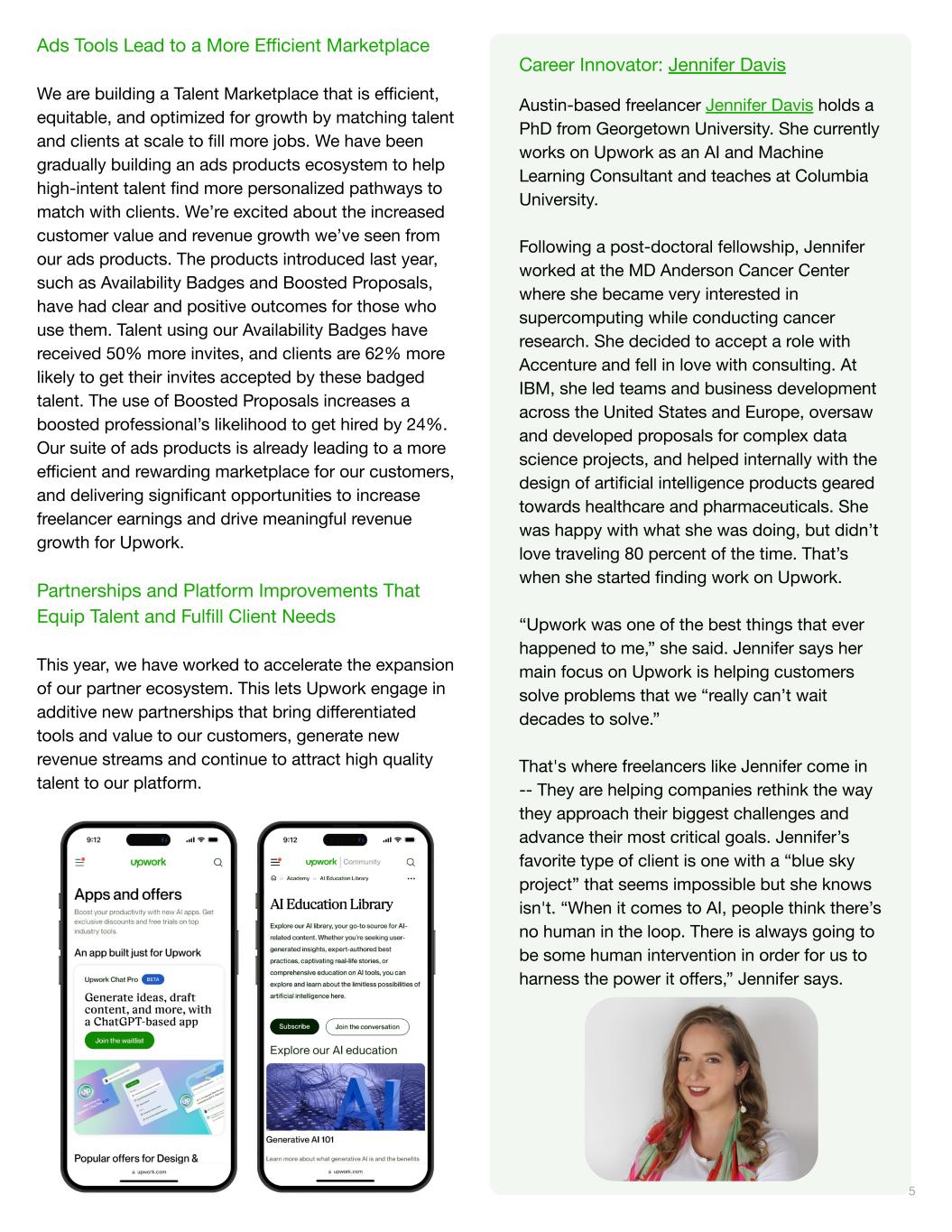 5 Career Innovator: Jennifer Davis Austin-based freelancer Jennifer Davis holds a PhD from Georgetown University. She currently works on Upwork as an AI and Machine Learning Consultant and teaches at Columbia University. Following a post-doctoral fellowship, Jennifer worked at the MD Anderson Cancer Center where she became very interested in supercomputing while conducting cancer research. She decided to accept a role with Accenture and fell in love with consulting. At IBM, she led teams and business development across the United States and Europe, oversaw and developed proposals for complex data science projects, and helped internally with the design of artificial intelligence products geared towards healthcare and pharmaceuticals. She was happy with what she was doing, but didn’t love traveling 80 percent of the time. That’s when she started finding work on Upwork. “Upwork was one of the best things that ever happened to me,” she said. Jennifer says her main focus on Upwork is helping customers solve problems that we “really can’t wait decades to solve.” That's where freelancers like Jennifer come in -- They are helping companies rethink the way they approach their biggest challenges and advance their most critical goals. Jennifer’s favorite type of client is one with a “blue sky project” that seems impossible but she knows isn't. “When it comes to AI, people think there’s no human in the loop. There is always going to be some human intervention in order for us to harness the power it offers,” Jennifer says. Ads Tools Lead to a More Efficient Marketplace We are building a Talent Marketplace that is efficient, equitable, and optimized for growth by matching talent and clients at scale to fill more jobs. We have been gradually building an ads products ecosystem to help high-intent talent find more personalized pathways to match with clients. We’re excited about the increased customer value and revenue growth we’ve seen from our ads products. The products introduced last year, such as Availability Badges and Boosted Proposals, have had clear and positive outcomes for those who use them. Talent using our Availability Badges have received 50% more invites, and clients are 62% more likely to get their invites accepted by these badged talent. The use of Boosted Proposals increases a boosted professional’s likelihood to get hired by 24%. Our suite of ads products is already leading to a more efficient and rewarding marketplace for our customers, and delivering significant opportunities to increase freelancer earnings and drive meaningful revenue growth for Upwork. Partnerships and Platform Improvements That Equip Talent and Fulfill Client Needs This year, we have worked to accelerate the expansion of our partner ecosystem. This lets Upwork engage in additive new partnerships that bring differentiated tools and value to our customers, generate new revenue streams and continue to attract high quality talent to our platform.
