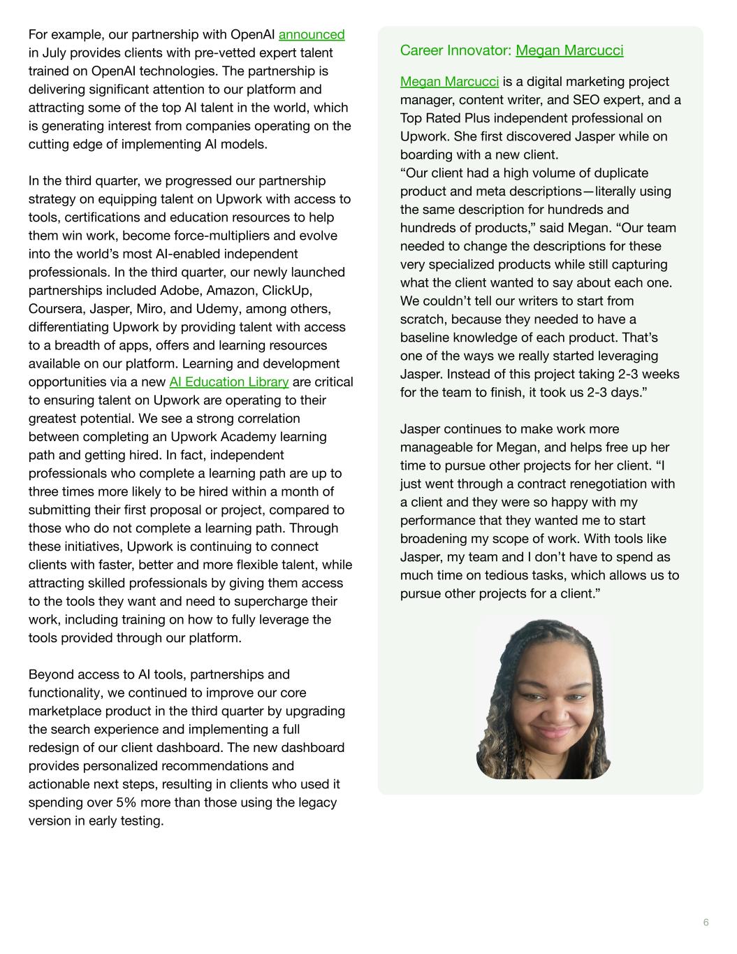 6 For example, our partnership with OpenAI announced in July provides clients with pre-vetted expert talent trained on OpenAI technologies. The partnership is delivering significant attention to our platform and attracting some of the top AI talent in the world, which is generating interest from companies operating on the cutting edge of implementing AI models. In the third quarter, we progressed our partnership strategy on equipping talent on Upwork with access to tools, certifications and education resources to help them win work, become force-multipliers and evolve into the world’s most AI-enabled independent professionals. In the third quarter, our newly launched partnerships included Adobe, Amazon, ClickUp, Coursera, Jasper, Miro, and Udemy, among others, differentiating Upwork by providing talent with access to a breadth of apps, offers and learning resources available on our platform. Learning and development opportunities via a new AI Education Library are critical to ensuring talent on Upwork are operating to their greatest potential. We see a strong correlation between completing an Upwork Academy learning path and getting hired. In fact, independent professionals who complete a learning path are up to three times more likely to be hired within a month of submitting their first proposal or project, compared to those who do not complete a learning path. Through these initiatives, Upwork is continuing to connect clients with faster, better and more flexible talent, while attracting skilled professionals by giving them access to the tools they want and need to supercharge their work, including training on how to fully leverage the tools provided through our platform. Beyond access to AI tools, partnerships and functionality, we continued to improve our core marketplace product in the third quarter by upgrading the search experience and implementing a full redesign of our client dashboard. The new dashboard provides personalized recommendations and actionable next steps, resulting in clients who used it spending over 5% more than those using the legacy version in early testing. Career Innovator: Megan Marcucci Megan Marcucci is a digital marketing project manager, content writer, and SEO expert, and a Top Rated Plus independent professional on Upwork. She first discovered Jasper while on boarding with a new client. “Our client had a high volume of duplicate product and meta descriptions—literally using the same description for hundreds and hundreds of products,” said Megan. “Our team needed to change the descriptions for these very specialized products while still capturing what the client wanted to say about each one. We couldn’t tell our writers to start from scratch, because they needed to have a baseline knowledge of each product. That’s one of the ways we really started leveraging Jasper. Instead of this project taking 2-3 weeks for the team to finish, it took us 2-3 days.” Jasper continues to make work more manageable for Megan, and helps free up her time to pursue other projects for her client. “I just went through a contract renegotiation with a client and they were so happy with my performance that they wanted me to start broadening my scope of work. With tools like Jasper, my team and I don’t have to spend as much time on tedious tasks, which allows us to pursue other projects for a client.”