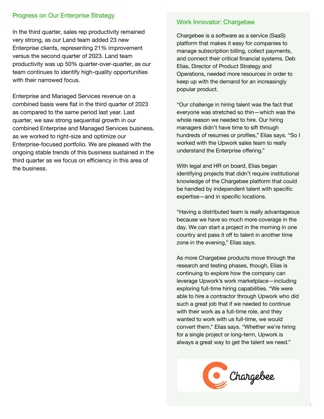 7 Work Innovator: Chargebee Chargebee is a software as a service (SaaS) platform that makes it easy for companies to manage subscription billing, collect payments, and connect their critical financial systems. Deb Elias, Director of Product Strategy and Operations, needed more resources in order to keep up with the demand for an increasingly popular product. “Our challenge in hiring talent was the fact that everyone was stretched so thin—which was the whole reason we needed to hire. Our hiring managers didn’t have time to sift through hundreds of resumes or profiles,” Elias says. “So I worked with the Upwork sales team to really understand the Enterprise offering.” With legal and HR on board, Elias began identifying projects that didn’t require institutional knowledge of the Chargebee platform that could be handled by independent talent with specific expertise—and in specific locations. “Having a distributed team is really advantageous because we have so much more coverage in the day. We can start a project in the morning in one country and pass it off to talent in another time zone in the evening,” Elias says. As more Chargebee products move through the research and testing phases, though, Elias is continuing to explore how the company can leverage Upwork’s work marketplace—including exploring full-time hiring capabilities. “We were able to hire a contractor through Upwork who did such a great job that if we needed to continue with their work as a full-time role, and they wanted to work with us full-time, we would convert them,” Elias says. “Whether we’re hiring for a single project or long-term, Upwork is always a great way to get the talent we need.” Progress on Our Enterprise Strategy In the third quarter, sales rep productivity remained very strong, as our Land team added 23 new Enterprise clients, representing 21% improvement versus the second quarter of 2023. Land team productivity was up 50% quarter-over-quarter, as our team continues to identify high-quality opportunities with their narrowed focus. Enterprise and Managed Services revenue on a combined basis were flat in the third quarter of 2023 as compared to the same period last year. Last quarter, we saw strong sequential growth in our combined Enterprise and Managed Services business, as we worked to right-size and optimize our Enterprise-focused portfolio. We are pleased with the ongoing stable trends of this business sustained in the third quarter as we focus on efficiency in this area of the business.