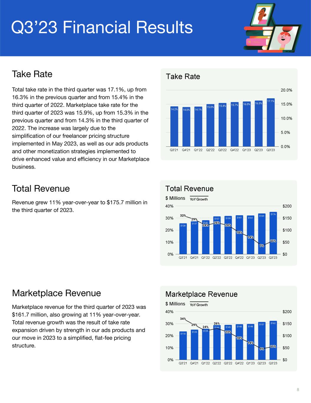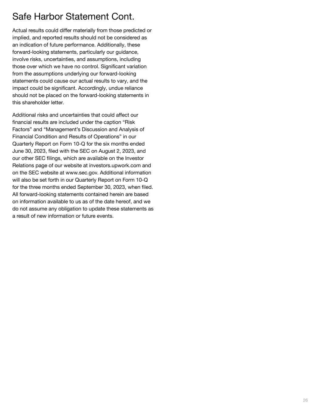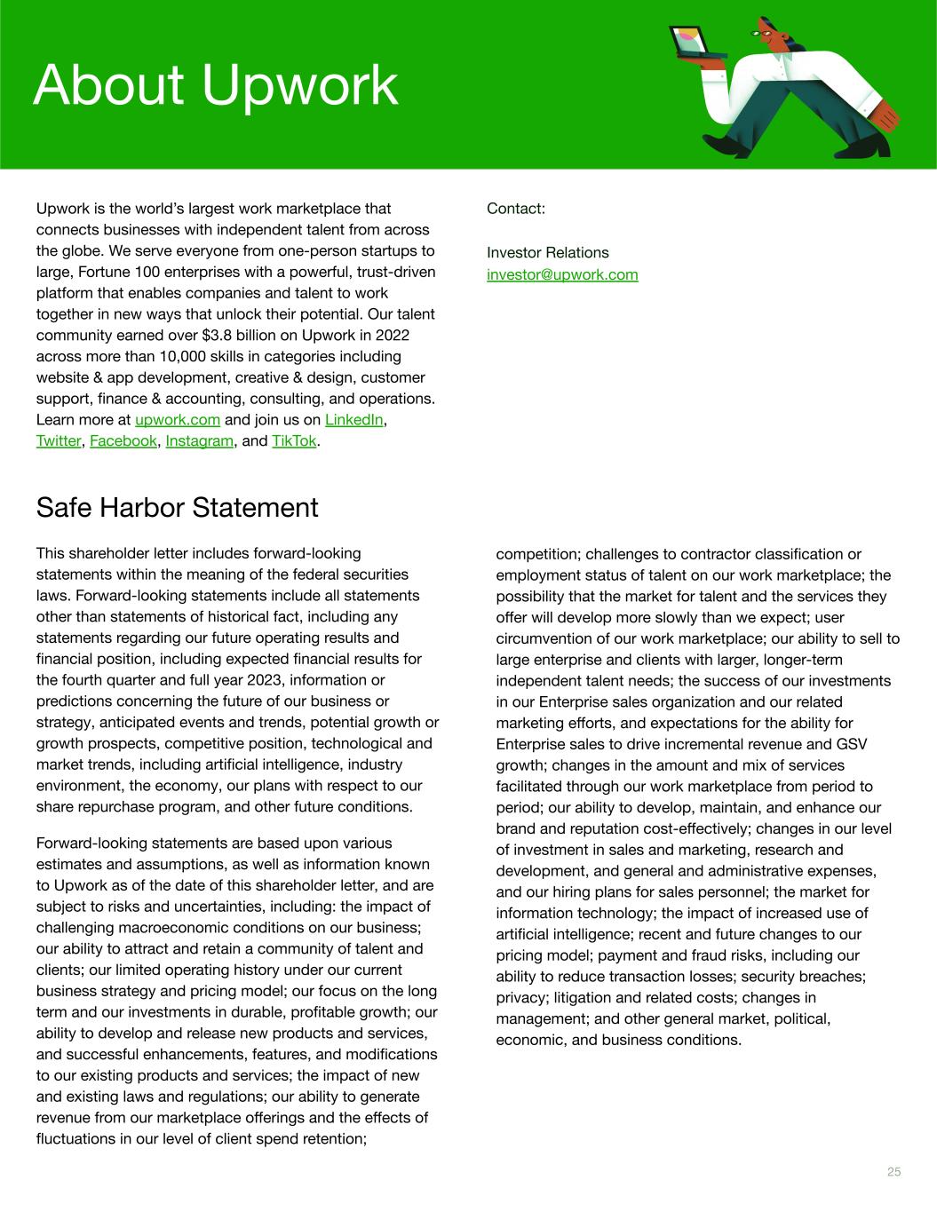 competition; challenges to contractor classification or employment status of talent on our work marketplace; the possibility that the market for talent and the services they offer will develop more slowly than we expect; user circumvention of our work marketplace; our ability to sell to large enterprise and clients with larger, longer-term independent talent needs; the success of our investments in our Enterprise sales organization and our related marketing efforts, and expectations for the ability for Enterprise sales to drive incremental revenue and GSV growth; changes in the amount and mix of services facilitated through our work marketplace from period to period; our ability to develop, maintain, and enhance our brand and reputation cost-effectively; changes in our level of investment in sales and marketing, research and development, and general and administrative expenses, and our hiring plans for sales personnel; the market for information technology; the impact of increased use of artificial intelligence; recent and future changes to our pricing model; payment and fraud risks, including our ability to reduce transaction losses; security breaches; privacy; litigation and related costs; changes in management; and other general market, political, economic, and business conditions. Ken Blanchard and Scott Blanchard About Upwork Upwork is the world’s largest work marketplace that connects businesses with independent talent from across the globe. We serve everyone from one-person startups to large, Fortune 100 enterprises with a powerful, trust-driven platform that enables companies and talent to work together in new ways that unlock their potential. Our talent community earned over $3.8 billion on Upwork in 2022 across more than 10,000 skills in categories including website & app development, creative & design, customer support, finance & accounting, consulting, and operations. Learn more at upwork.com and join us on LinkedIn, Twitter, Facebook, Instagram, and TikTok. Safe Harbor Statement This shareholder letter includes forward-looking statements within the meaning of the federal securities laws. Forward-looking statements include all statements other than statements of historical fact, including any statements regarding our future operating results and financial position, including expected financial results for the fourth quarter and full year 2023, information or predictions concerning the future of our business or strategy, anticipated events and trends, potential growth or growth prospects, competitive position, technological and market trends, including artificial intelligence, industry environment, the economy, our plans with respect to our share repurchase program, and other future conditions. Forward-looking statements are based upon various estimates and assumptions, as well as information known to Upwork as of the date of this shareholder letter, and are subject to risks and uncertainties, including: the impact of challenging macroeconomic conditions on our business; our ability to attract and retain a community of talent and clients; our limited operating history under our current business strategy and pricing model; our focus on the long term and our investments in durable, profitable growth; our ability to develop and release new products and services, and successful enhancements, features, and modifications to our existing products and services; the impact of new and existing laws and regulations; our ability to generate revenue from our marketplace offerings and the effects of fluctuations in our level of client spend retention; 25 Contact: Investor Relations investor@upwork.com