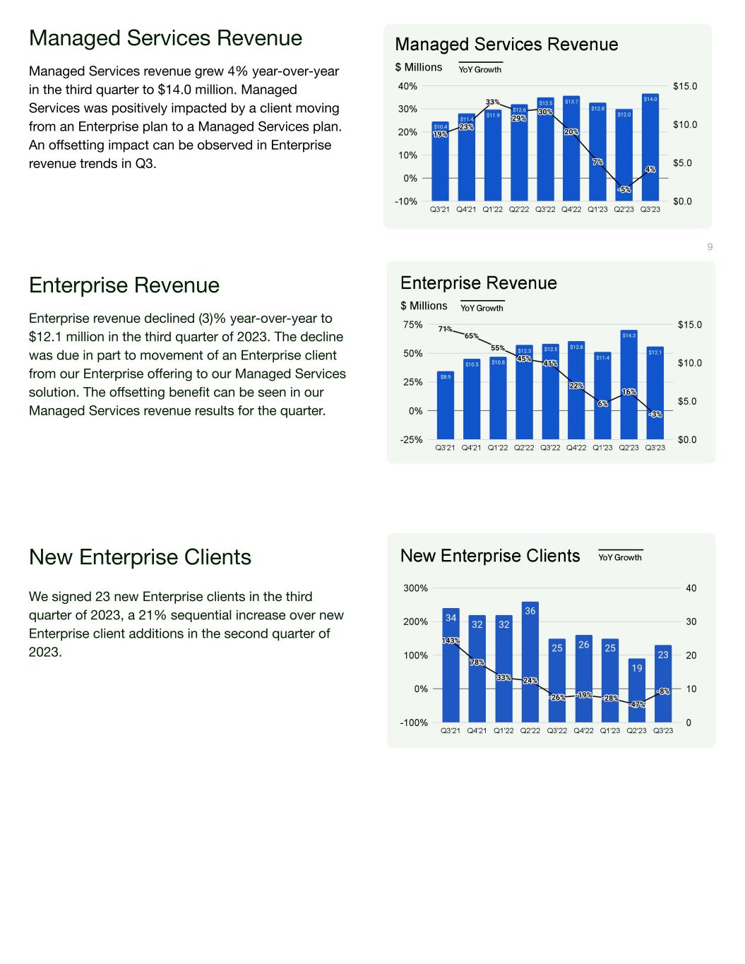 9 Managed Services Revenue Managed Services revenue grew 4% year-over-year in the third quarter to $14.0 million. Managed Services was positively impacted by a client moving from an Enterprise plan to a Managed Services plan. An offsetting impact can be observed in Enterprise revenue trends in Q3. Enterprise Revenue Enterprise revenue declined (3)% year-over-year to $12.1 million in the third quarter of 2023. The decline was due in part to movement of an Enterprise client from our Enterprise offering to our Managed Services solution. The offsetting benefit can be seen in our Managed Services revenue results for the quarter. New Enterprise Clients We signed 23 new Enterprise clients in the third quarter of 2023, a 21% sequential increase over new Enterprise client additions in the second quarter of 2023.