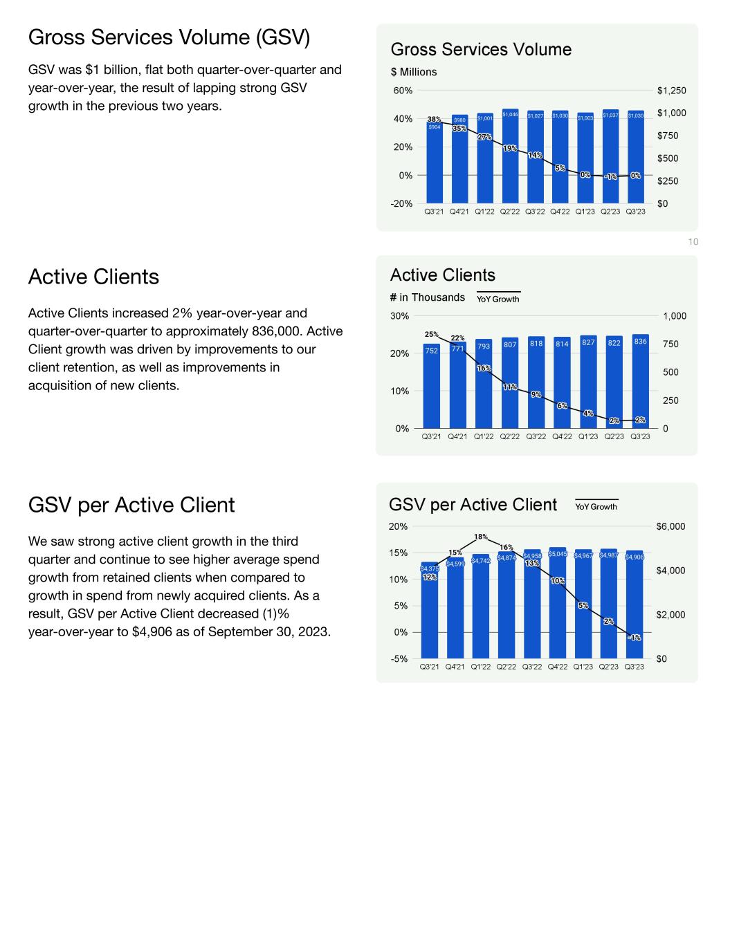 10 Gross Services Volume (GSV) GSV was $1 billion, flat both quarter-over-quarter and year-over-year, the result of lapping strong GSV growth in the previous two years. Active Clients Active Clients increased 2% year-over-year and quarter-over-quarter to approximately 836,000. Active Client growth was driven by improvements to our client retention, as well as improvements in acquisition of new clients. GSV per Active Client We saw strong active client growth in the third quarter and continue to see higher average spend growth from retained clients when compared to growth in spend from newly acquired clients. As a result, GSV per Active Client decreased (1)% year-over-year to $4,906 as of September 30, 2023.