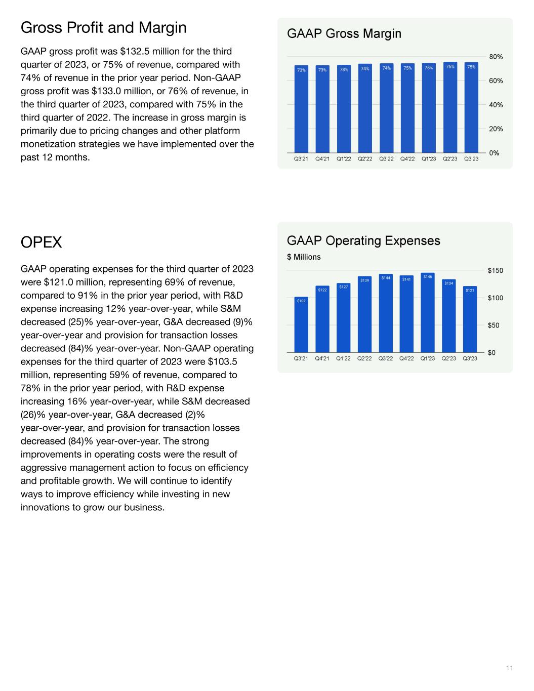 Gross Profit and Margin GAAP gross profit was $132.5 million for the third quarter of 2023, or 75% of revenue, compared with 74% of revenue in the prior year period. Non-GAAP gross profit was $133.0 million, or 76% of revenue, in the third quarter of 2023, compared with 75% in the third quarter of 2022. The increase in gross margin is primarily due to pricing changes and other platform monetization strategies we have implemented over the past 12 months. OPEX GAAP operating expenses for the third quarter of 2023 were $121.0 million, representing 69% of revenue, compared to 91% in the prior year period, with R&D expense increasing 12% year-over-year, while S&M decreased (25)% year-over-year, G&A decreased (9)% year-over-year and provision for transaction losses decreased (84)% year-over-year. Non-GAAP operating expenses for the third quarter of 2023 were $103.5 million, representing 59% of revenue, compared to 78% in the prior year period, with R&D expense increasing 16% year-over-year, while S&M decreased (26)% year-over-year, G&A decreased (2)% year-over-year, and provision for transaction losses decreased (84)% year-over-year. The strong improvements in operating costs were the result of aggressive management action to focus on efficiency and profitable growth. We will continue to identify ways to improve efficiency while investing in new innovations to grow our business. 11