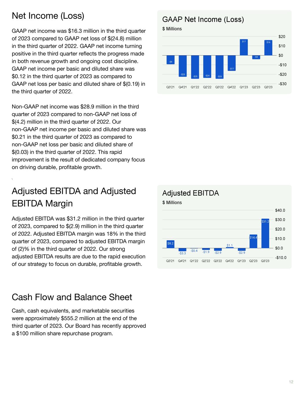 Net Income (Loss) GAAP net income was $16.3 million in the third quarter of 2023 compared to GAAP net loss of $(24.8) million in the third quarter of 2022. GAAP net income turning positive in the third quarter reflects the progress made in both revenue growth and ongoing cost discipline. GAAP net income per basic and diluted share was $0.12 in the third quarter of 2023 as compared to GAAP net loss per basic and diluted share of $(0.19) in the third quarter of 2022. Non-GAAP net income was $28.9 million in the third quarter of 2023 compared to non-GAAP net loss of $(4.2) million in the third quarter of 2022. Our non-GAAP net income per basic and diluted share was $0.21 in the third quarter of 2023 as compared to non-GAAP net loss per basic and diluted share of $(0.03) in the third quarter of 2022. This rapid improvement is the result of dedicated company focus on driving durable, profitable growth. \ Adjusted EBITDA and Adjusted EBITDA Margin Adjusted EBITDA was $31.2 million in the third quarter of 2023, compared to $(2.9) million in the third quarter of 2022. Adjusted EBITDA margin was 18% in the third quarter of 2023, compared to adjusted EBITDA margin of (2)% in the third quarter of 2022. Our strong adjusted EBITDA results are due to the rapid execution of our strategy to focus on durable, profitable growth. Cash Flow and Balance Sheet Cash, cash equivalents, and marketable securities were approximately $555.2 million at the end of the third quarter of 2023. Our Board has recently approved a $100 million share repurchase program. 12