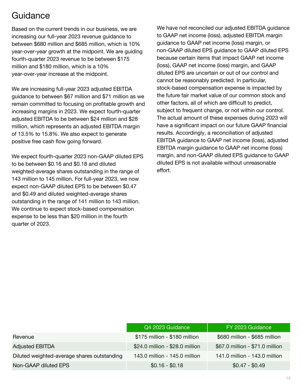 Guidance Based on the current trends in our business, we are increasing our full-year 2023 revenue guidance to between $680 million and $685 million, which is 10% year-over-year growth at the midpoint. We are guiding fourth-quarter 2023 revenue to be between $175 million and $180 million, which is a 10% year-over-year increase at the midpoint. We are increasing full-year 2023 adjusted EBITDA guidance to between $67 million and $71 million as we remain committed to focusing on profitable growth and increasing margins in 2023. We expect fourth-quarter adjusted EBITDA to be between $24 million and $28 million, which represents an adjusted EBITDA margin of 13.5% to 15.8%. We also expect to generate positive free cash flow going forward. We expect fourth-quarter 2023 non-GAAP diluted EPS to be between $0.16 and $0.18 and diluted weighted-average shares outstanding in the range of 143 million to 145 million. For full-year 2023, we now expect non-GAAP diluted EPS to be between $0.47 and $0.49 and diluted weighted-average shares outstanding in the range of 141 million to 143 million. We continue to expect stock-based compensation expense to be less than $20 million in the fourth quarter of 2023. We have not reconciled our adjusted EBITDA guidance to GAAP net income (loss), adjusted EBITDA margin guidance to GAAP net income (loss) margin, or non-GAAP diluted EPS guidance to GAAP diluted EPS because certain items that impact GAAP net income (loss), GAAP net income (loss) margin, and GAAP diluted EPS are uncertain or out of our control and cannot be reasonably predicted. In particular, stock-based compensation expense is impacted by the future fair market value of our common stock and other factors, all of which are difficult to predict, subject to frequent change, or not within our control. The actual amount of these expenses during 2023 will have a significant impact on our future GAAP financial results. Accordingly, a reconciliation of adjusted EBITDA guidance to GAAP net income (loss), adjusted EBITDA margin guidance to GAAP net income (loss) margin, and non-GAAP diluted EPS guidance to GAAP diluted EPS is not available without unreasonable effort. 13 Q4 2023 Guidance FY 2023 Guidance Revenue $175 million - $180 million $680 million - $685 million Adjusted EBITDA $24.0 million - $28.0 million $67.0 million - $71.0 million Diluted weighted-average shares outstanding 143.0 million - 145.0 million 141.0 million - 143.0 million Non-GAAP diluted EPS $0.16 - $0.18 $0.47 - $0.49