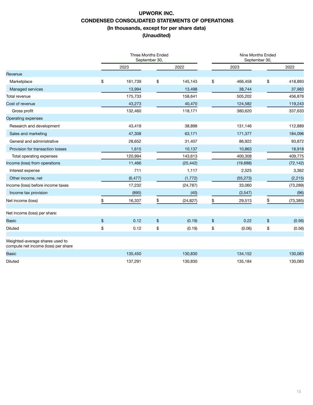 UPWORK INC. CONDENSED CONSOLIDATED STATEMENTS OF OPERATIONS (In thousands, except for per share data) (Unaudited) 15 Three Months Ended September 30, Nine Months Ended September 30, 2023 2022 2023 2022 Revenue Marketplace $ 161,739 $ 145,143 $ 466,458 $ 418,893 Managed services 13,994 13,498 38,744 37,983 Total revenue 175,733 158,641 505,202 456,876 Cost of revenue 43,273 40,470 124,582 119,243 Gross profit 132,460 118,171 380,620 337,633 Operating expenses Research and development 43,419 38,898 131,146 112,889 Sales and marketing 47,308 63,171 171,377 184,096 General and administrative 28,652 31,407 86,922 93,872 Provision for transaction losses 1,615 10,137 10,863 18,918 Total operating expenses 120,994 143,613 400,308 409,775 Income (loss) from operations 11,466 (25,442) (19,688) (72,142) Interest expense 711 1,117 2,525 3,362 Other income, net (6,477) (1,772) (55,273) (2,215) Income (loss) before income taxes 17,232 (24,787) 33,060 (73,289) Income tax provision (895) (40) (3,547) (96) Net income (loss) $ 16,337 $ (24,827) $ 29,513 $ (73,385) Net income (loss) per share: Basic $ 0.12 $ (0.19) $ 0.22 $ (0.56) Diluted $ 0.12 $ (0.19) $ (0.06) $ (0.56) Weighted-average shares used to compute net income (loss) per share Basic 135,450 130,830 134,152 130,083 Diluted 137,291 130,830 135,184 130,083