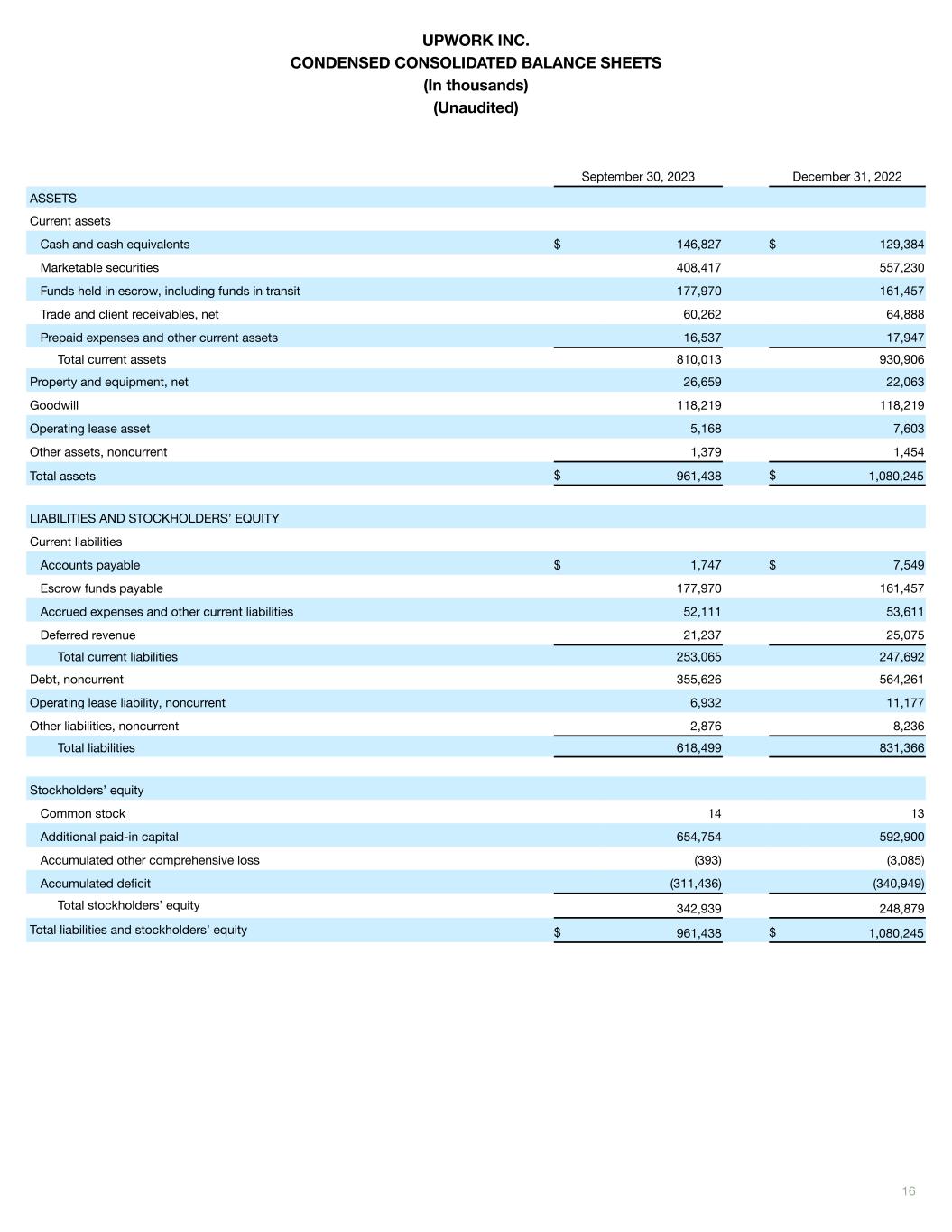 UPWORK INC. CONDENSED CONSOLIDATED BALANCE SHEETS (In thousands) (Unaudited) 16 September 30, 2023 December 31, 2022 ASSETS Current assets Cash and cash equivalents $ 146,827 $ 129,384 Marketable securities 408,417 557,230 Funds held in escrow, including funds in transit 177,970 161,457 Trade and client receivables, net 60,262 64,888 Prepaid expenses and other current assets 16,537 17,947 Total current assets 810,013 930,906 Property and equipment, net 26,659 22,063 Goodwill 118,219 118,219 Operating lease asset 5,168 7,603 Other assets, noncurrent 1,379 1,454 Total assets $ 961,438 $ 1,080,245 LIABILITIES AND STOCKHOLDERS’ EQUITY Current liabilities Accounts payable $ 1,747 $ 7,549 Escrow funds payable 177,970 161,457 Accrued expenses and other current liabilities 52,111 53,611 Deferred revenue 21,237 25,075 Total current liabilities 253,065 247,692 Debt, noncurrent 355,626 564,261 Operating lease liability, noncurrent 6,932 11,177 Other liabilities, noncurrent 2,876 8,236 Total liabilities 618,499 831,366 Stockholders’ equity Common stock 14 13 Additional paid-in capital 654,754 592,900 Accumulated other comprehensive loss (393) (3,085) Accumulated deficit (311,436) (340,949) Total stockholders’ equity 342,939 248,879 Total liabilities and stockholders’ equity $ 961,438 $ 1,080,245