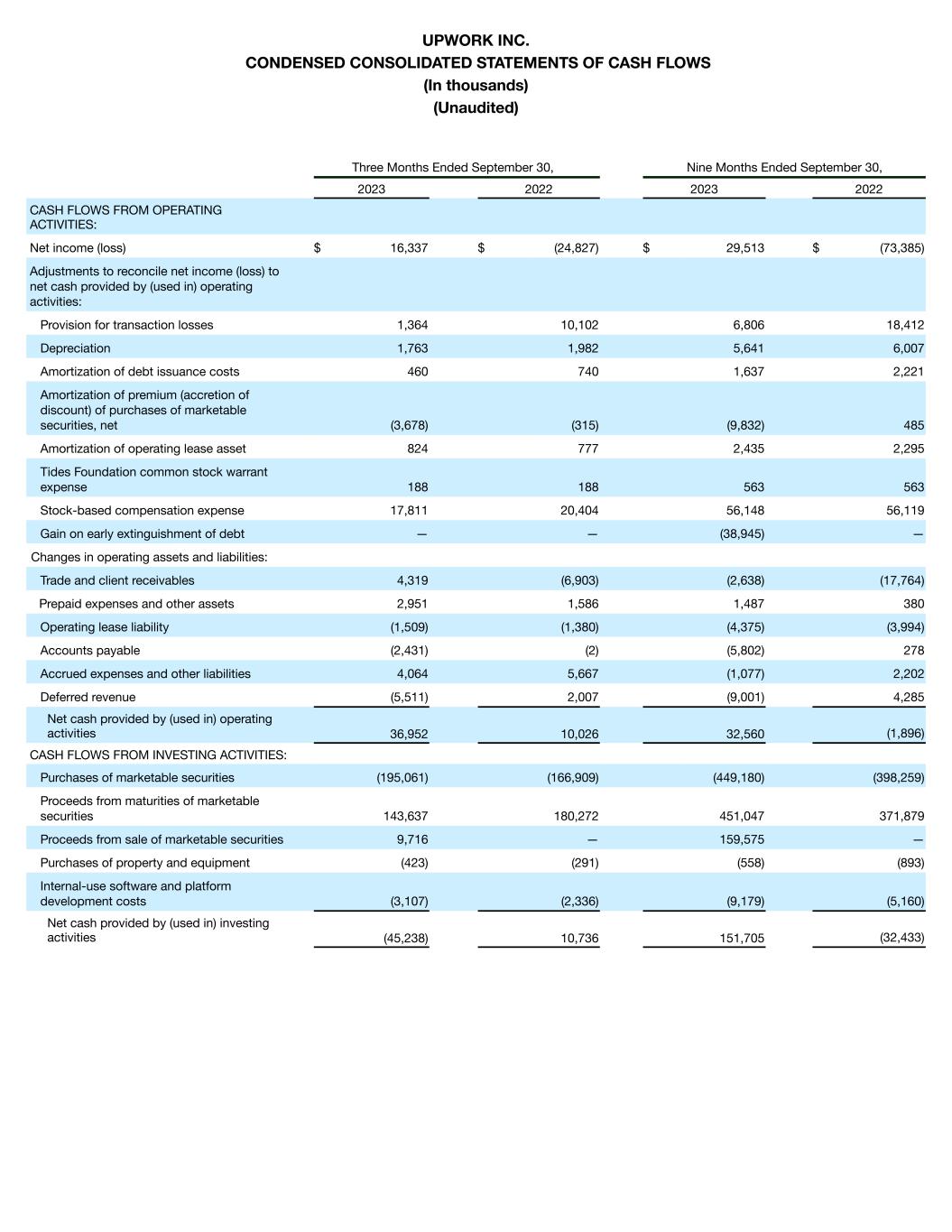 UPWORK INC. CONDENSED CONSOLIDATED STATEMENTS OF CASH FLOWS (In thousands) (Unaudited) Three Months Ended September 30, Nine Months Ended September 30, 2023 2022 2023 2022 CASH FLOWS FROM OPERATING ACTIVITIES: Net income (loss) $ 16,337 $ (24,827) $ 29,513 $ (73,385) Adjustments to reconcile net income (loss) to net cash provided by (used in) operating activities: Provision for transaction losses 1,364 10,102 6,806 18,412 Depreciation 1,763 1,982 5,641 6,007 Amortization of debt issuance costs 460 740 1,637 2,221 Amortization of premium (accretion of discount) of purchases of marketable securities, net (3,678) (315) (9,832) 485 Amortization of operating lease asset 824 777 2,435 2,295 Tides Foundation common stock warrant expense 188 188 563 563 Stock-based compensation expense 17,811 20,404 56,148 56,119 Gain on early extinguishment of debt — — (38,945) — Changes in operating assets and liabilities: Trade and client receivables 4,319 (6,903) (2,638) (17,764) Prepaid expenses and other assets 2,951 1,586 1,487 380 Operating lease liability (1,509) (1,380) (4,375) (3,994) Accounts payable (2,431) (2) (5,802) 278 Accrued expenses and other liabilities 4,064 5,667 (1,077) 2,202 Deferred revenue (5,511) 2,007 (9,001) 4,285 Net cash provided by (used in) operating activities 36,952 10,026 32,560 (1,896) CASH FLOWS FROM INVESTING ACTIVITIES: Purchases of marketable securities (195,061) (166,909) (449,180) (398,259) Proceeds from maturities of marketable securities 143,637 180,272 451,047 371,879 Proceeds from sale of marketable securities 9,716 — 159,575 — Purchases of property and equipment (423) (291) (558) (893) Internal-use software and platform development costs (3,107) (2,336) (9,179) (5,160) Net cash provided by (used in) investing activities (45,238) 10,736 151,705 (32,433)