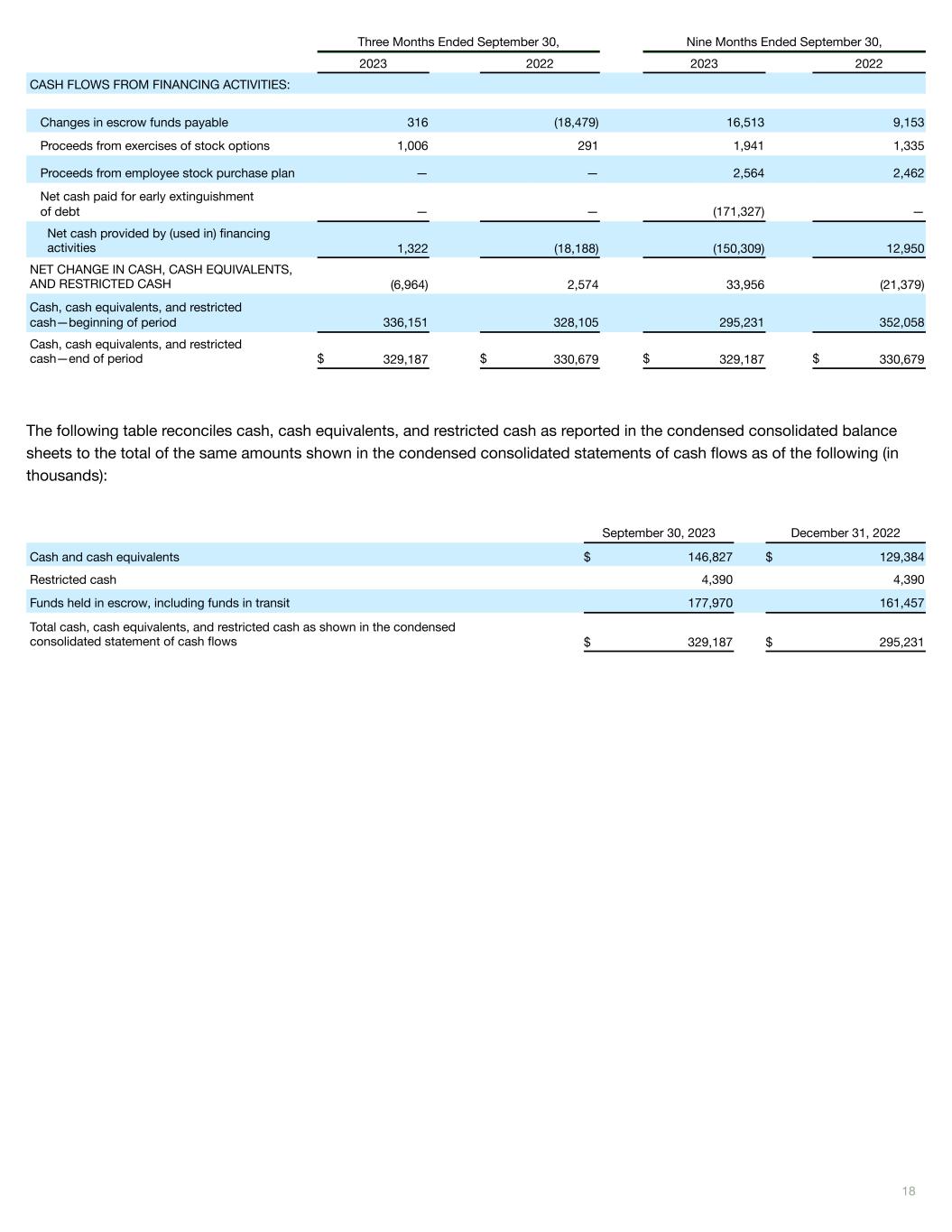 18 Three Months Ended September 30, Nine Months Ended September 30, 2023 2022 2023 2022 CASH FLOWS FROM FINANCING ACTIVITIES: Changes in escrow funds payable 316 (18,479) 16,513 9,153 Proceeds from exercises of stock options 1,006 291 1,941 1,335 Proceeds from employee stock purchase plan — — 2,564 2,462 Net cash paid for early extinguishment of debt — — (171,327) — Net cash provided by (used in) financing activities 1,322 (18,188) (150,309) 12,950 NET CHANGE IN CASH, CASH EQUIVALENTS, AND RESTRICTED CASH (6,964) 2,574 33,956 (21,379) Cash, cash equivalents, and restricted cash—beginning of period 336,151 328,105 295,231 352,058 Cash, cash equivalents, and restricted cash—end of period $ 329,187 $ 330,679 $ 329,187 $ 330,679 The following table reconciles cash, cash equivalents, and restricted cash as reported in the condensed consolidated balance sheets to the total of the same amounts shown in the condensed consolidated statements of cash flows as of the following (in thousands): September 30, 2023 December 31, 2022 Cash and cash equivalents $ 146,827 $ 129,384 Restricted cash 4,390 4,390 Funds held in escrow, including funds in transit 177,970 161,457 Total cash, cash equivalents, and restricted cash as shown in the condensed consolidated statement of cash flows $ 329,187 $ 295,231