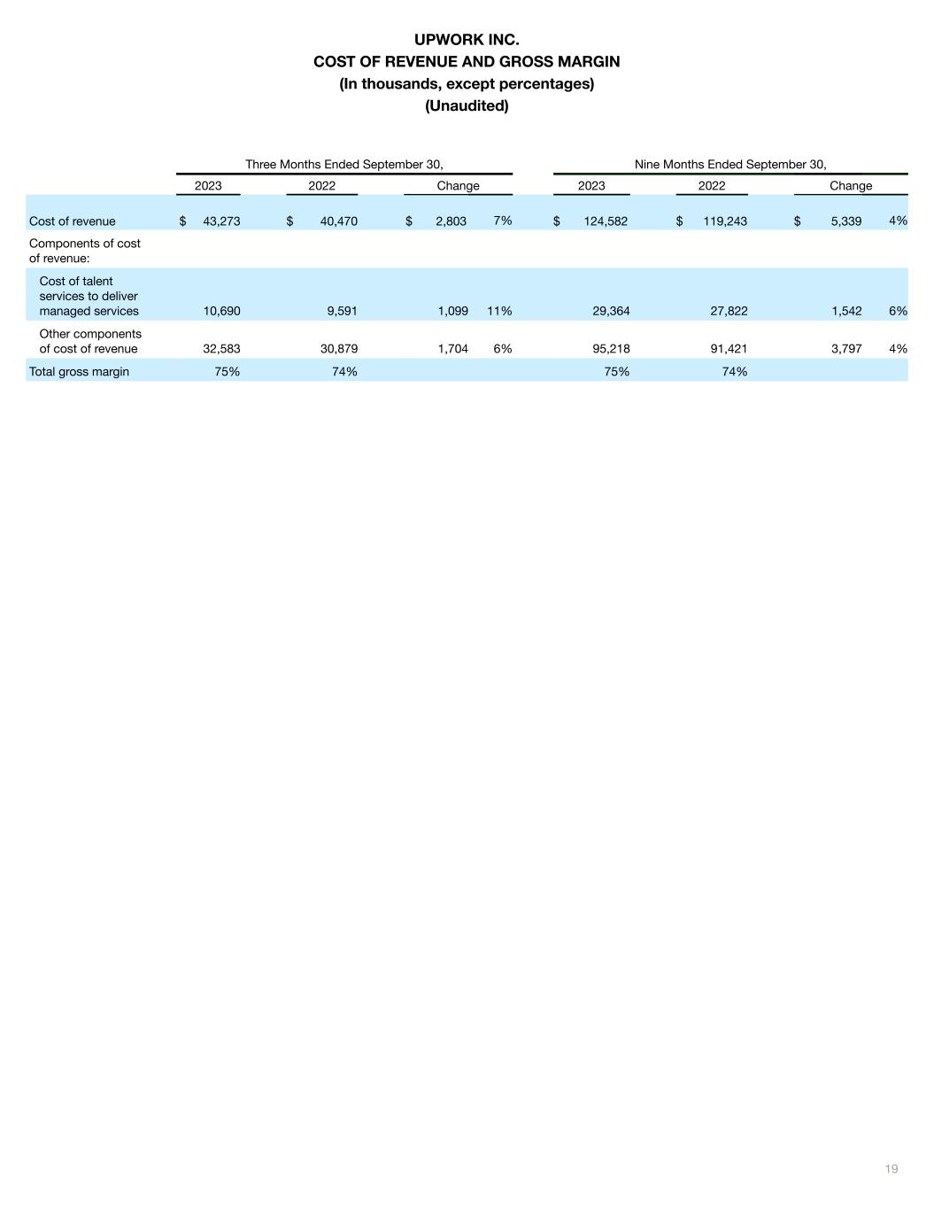 UPWORK INC. COST OF REVENUE AND GROSS MARGIN (In thousands, except percentages) (Unaudited) 19 Three Months Ended September 30, Nine Months Ended September 30, 2023 2022 Change 2023 2022 Change Cost of revenue $ 43,273 $ 40,470 $ 2,803 7% $ 124,582 $ 119,243 $ 5,339 4% Components of cost of revenue: Cost of talent services to deliver managed services 10,690 9,591 1,099 11% 29,364 27,822 1,542 6% Other components of cost of revenue 32,583 30,879 1,704 6% 95,218 91,421 3,797 4% Total gross margin 75% 74% 75% 74%