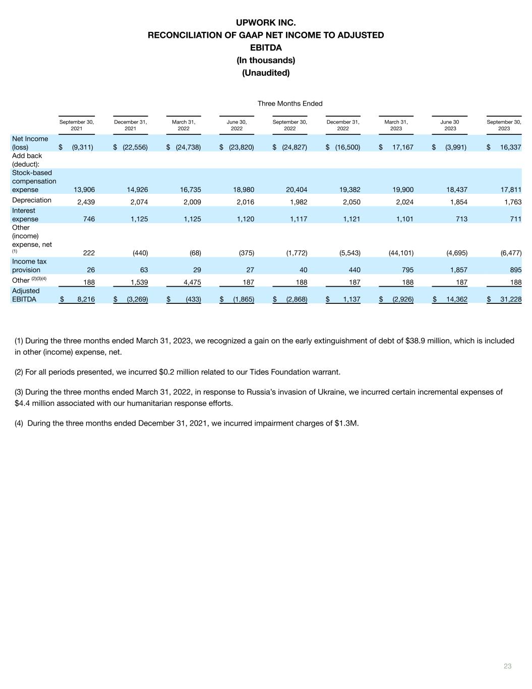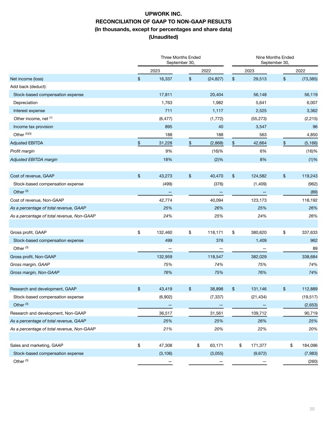 20 Three Months Ended September 30, Nine Months Ended September 30, 2023 2022 2023 2022 Net income (loss) $ 16,337 $ (24,827) $ 29,513 $ (73,385) Add back (deduct): Stock-based compensation expense 17,811 20,404 56,148 56,119 Depreciation 1,763 1,982 5,641 6,007 Interest expense 711 1,117 2,525 3,362 Other income, net (1) (6,477) (1,772) (55,273) (2,215) Income tax provision 895 40 3,547 96 Other (2)(3) 188 188 563 4,850 Adjusted EBITDA $ 31,228 $ (2,868) $ 42,664 $ (5,166) Profit margin 9% (16)% 6% (16)% Adjusted EBITDA margin 18% (2)% 8% (1)% Cost of revenue, GAAP $ 43,273 $ 40,470 $ 124,582 $ 119,243 Stock-based compensation expense (499) (376) (1,409) (962) Other (3) — — — (89) Cost of revenue, Non-GAAP 42,774 40,094 123,173 118,192 As a percentage of total revenue, GAAP 25% 26% 25% 26% As a percentage of total revenue, Non-GAAP 24% 25% 24% 26% Gross profit, GAAP $ 132,460 $ 118,171 $ 380,620 $ 337,633 Stock-based compensation expense 499 376 1,409 962 Other (3) — — — 89 Gross profit, Non-GAAP 132,959 118,547 382,029 338,684 Gross margin, GAAP 75% 74% 75% 74% Gross margin, Non-GAAP 76% 75% 76% 74% Research and development, GAAP $ 43,419 $ 38,898 $ 131,146 $ 112,889 Stock-based compensation expense (6,902) (7,337) (21,434) (19,517) Other (3) — — — (2,653) Research and development, Non-GAAP 36,517 31,561 109,712 90,719 As a percentage of total revenue, GAAP 25% 25% 26% 25% As a percentage of total revenue, Non-GAAP 21% 20% 22% 20% Sales and marketing, GAAP $ 47,308 $ 63,171 $ 171,377 $ 184,096 Stock-based compensation expense (3,106) (3,055) (9,672) (7,983) Other (3) — — — (260) UPWORK INC. RECONCILIATION OF GAAP TO NON-GAAP RESULTS (In thousands, except for percentages and share data) (Unaudited)