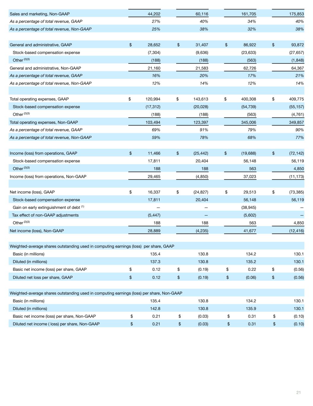 21 Sales and marketing, Non-GAAP 44,202 60,116 161,705 175,853 As a percentage of total revenue, GAAP 27% 40% 34% 40% As a percentage of total revenue, Non-GAAP 25% 38% 32% 38% General and administrative, GAAP $ 28,652 $ 31,407 $ 86,922 $ 93,872 Stock-based compensation expense (7,304) (9,636) (23,633) (27,657) Other (2)(3) (188) (188) (563) (1,848) General and administrative, Non-GAAP 21,160 21,583 62,726 64,367 As a percentage of total revenue, GAAP 16% 20% 17% 21% As a percentage of total revenue, Non-GAAP 12% 14% 12% 14% Total operating expenses, GAAP $ 120,994 $ 143,613 $ 400,308 $ 409,775 Stock-based compensation expense (17,312) (20,028) (54,739) (55,157) Other (2)(3) (188) (188) (563) (4,761) Total operating expenses, Non-GAAP 103,494 123,397 345,006 349,857 As a percentage of total revenue, GAAP 69% 91% 79% 90% As a percentage of total revenue, Non-GAAP 59% 78% 68% 77% Income (loss) from operations, GAAP $ 11,466 $ (25,442) $ (19,688) $ (72,142) Stock-based compensation expense 17,811 20,404 56,148 56,119 Other (2)(3) 188 188 563 4,850 Income (loss) from operations, Non-GAAP 29,465 (4,850) 37,023 (11,173) Net income (loss), GAAP $ 16,337 $ (24,827) $ 29,513 $ (73,385) Stock-based compensation expense 17,811 20,404 56,148 56,119 Gain on early extinguishment of debt (1) — — (38,945) — Tax effect of non-GAAP adjustments (5,447) — (5,602) — Other (2)(3) 188 188 563 4,850 Net income (loss), Non-GAAP 28,889 (4,235) 41,677 (12,416) Weighted-average shares outstanding used in computing earnings (loss) per share, GAAP Basic (in millions) 135.4 130.8 134.2 130.1 Diluted (in millions) 137.3 130.8 135.2 130.1 Basic net income (loss) per share, GAAP $ 0.12 $ (0.19) $ 0.22 $ (0.56) Diluted net loss per share, GAAP $ 0.12 $ (0.19) $ (0.06) $ (0.56) Weighted-average shares outstanding used in computing earnings (loss) per share, Non-GAAP Basic (in millions) 135.4 130.8 134.2 130.1 Diluted (in millions) 142.8 130.8 135.9 130.1 Basic net income (loss) per share, Non-GAAP $ 0.21 $ (0.03) $ 0.31 $ (0.10) Diluted net income ( loss) per share, Non-GAAP $ 0.21 $ (0.03) $ 0.31 $ (0.10)