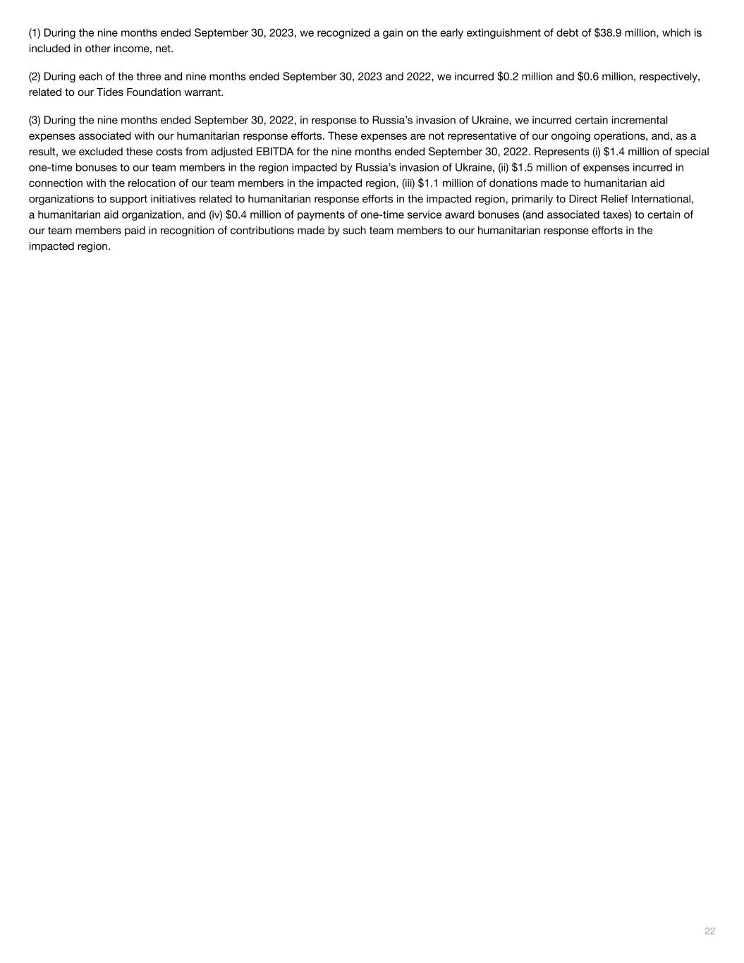 22 (1) During the nine months ended September 30, 2023, we recognized a gain on the early extinguishment of debt of $38.9 million, which is included in other income, net. (2) During each of the three and nine months ended September 30, 2023 and 2022, we incurred $0.2 million and $0.6 million, respectively, related to our Tides Foundation warrant. (3) During the nine months ended September 30, 2022, in response to Russia’s invasion of Ukraine, we incurred certain incremental expenses associated with our humanitarian response efforts. These expenses are not representative of our ongoing operations, and, as a result, we excluded these costs from adjusted EBITDA for the nine months ended September 30, 2022. Represents (i) $1.4 million of special one-time bonuses to our team members in the region impacted by Russia’s invasion of Ukraine, (ii) $1.5 million of expenses incurred in connection with the relocation of our team members in the impacted region, (iii) $1.1 million of donations made to humanitarian aid organizations to support initiatives related to humanitarian response efforts in the impacted region, primarily to Direct Relief International, a humanitarian aid organization, and (iv) $0.4 million of payments of one-time service award bonuses (and associated taxes) to certain of our team members paid in recognition of contributions made by such team members to our humanitarian response efforts in the impacted region.