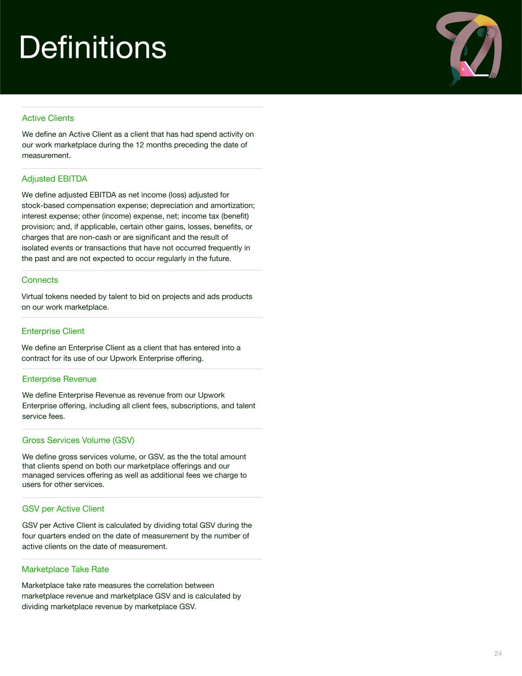 Definitions 24 Active Clients We define an Active Client as a client that has had spend activity on our work marketplace during the 12 months preceding the date of measurement. Virtual tokens needed by talent to bid on projects and ads products on our work marketplace. Connects Adjusted EBITDA We define adjusted EBITDA as net income (loss) adjusted for stock-based compensation expense; depreciation and amortization; interest expense; other (income) expense, net; income tax (benefit) provision; and, if applicable, certain other gains, losses, benefits, or charges that are non-cash or are significant and the result of isolated events or transactions that have not occurred frequently in the past and are not expected to occur regularly in the future. We define an Enterprise Client as a client that has entered into a contract for its use of our Upwork Enterprise offering. Enterprise Client Enterprise Revenue We define Enterprise Revenue as revenue from our Upwork Enterprise offering, including all client fees, subscriptions, and talent service fees. We define gross services volume, or GSV, as the the total amount that clients spend on both our marketplace offerings and our managed services offering as well as additional fees we charge to users for other services. Gross Services Volume (GSV) GSV per Active Client is calculated by dividing total GSV during the four quarters ended on the date of measurement by the number of active clients on the date of measurement. GSV per Active Client Marketplace Take Rate Marketplace take rate measures the correlation between marketplace revenue and marketplace GSV and is calculated by dividing marketplace revenue by marketplace GSV.