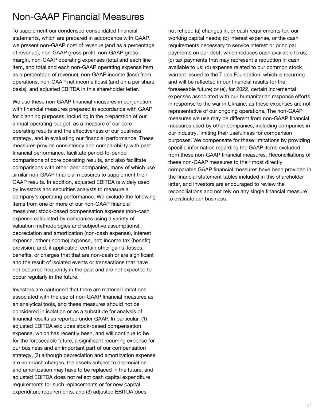 not reflect: (a) changes in, or cash requirements for, our working capital needs; (b) interest expense, or the cash requirements necessary to service interest or principal payments on our debt, which reduces cash available to us; (c) tax payments that may represent a reduction in cash available to us; (d) expense related to our common stock warrant issued to the Tides Foundation, which is recurring and will be reflected in our financial results for the foreseeable future; or (e), for 2022, certain incremental expenses associated with our humanitarian response efforts in response to the war in Ukraine, as these expenses are not representative of our ongoing operations. The non-GAAP measures we use may be different from non-GAAP financial measures used by other companies, including companies in our industry, limiting their usefulness for comparison purposes. We compensate for these limitations by providing specific information regarding the GAAP items excluded from these non-GAAP financial measures. Reconciliations of these non-GAAP measures to their most directly comparable GAAP financial measures have been provided in the financial statement tables included in this shareholder letter, and investors are encouraged to review the reconciliations and not rely on any single financial measure to evaluate our business. Non-GAAP Financial Measures To supplement our condensed consolidated financial statements, which are prepared in accordance with GAAP, we present non-GAAP cost of revenue (and as a percentage of revenue), non-GAAP gross profit, non-GAAP gross margin, non-GAAP operating expenses (total and each line item, and total and each non-GAAP operating expense item as a percentage of revenue), non-GAAP income (loss) from operations, non-GAAP net income (loss) (and on a per share basis), and adjusted EBITDA in this shareholder letter. We use these non-GAAP financial measures in conjunction with financial measures prepared in accordance with GAAP for planning purposes, including in the preparation of our annual operating budget, as a measure of our core operating results and the effectiveness of our business strategy, and in evaluating our financial performance. These measures provide consistency and comparability with past financial performance, facilitate period-to-period comparisons of core operating results, and also facilitate comparisons with other peer companies, many of which use similar non-GAAP financial measures to supplement their GAAP results. In addition, adjusted EBITDA is widely used by investors and securities analysts to measure a company’s operating performance. We exclude the following items from one or more of our non-GAAP financial measures: stock-based compensation expense (non-cash expense calculated by companies using a variety of valuation methodologies and subjective assumptions), depreciation and amortization (non-cash expense), interest expense, other (income) expense, net; income tax (benefit) provision; and, if applicable, certain other gains, losses, benefits, or charges that that are non-cash or are significant and the result of isolated events or transactions that have not occurred frequently in the past and are not expected to occur regularly in the future. Investors are cautioned that there are material limitations associated with the use of non-GAAP financial measures as an analytical tools, and these measures should not be considered in isolation or as a substitute for analysis of financial results as reported under GAAP. In particular, (1) adjusted EBITDA excludes stock-based compensation expense, which has recently been, and will continue to be for the foreseeable future, a significant recurring expense for our business and an important part of our compensation strategy, (2) although depreciation and amortization expense are non-cash charges, the assets subject to depreciation and amortization may have to be replaced in the future, and adjusted EBITDA does not reflect cash capital expenditure requirements for such replacements or for new capital expenditure requirements, and (3) adjusted EBITDA does 27