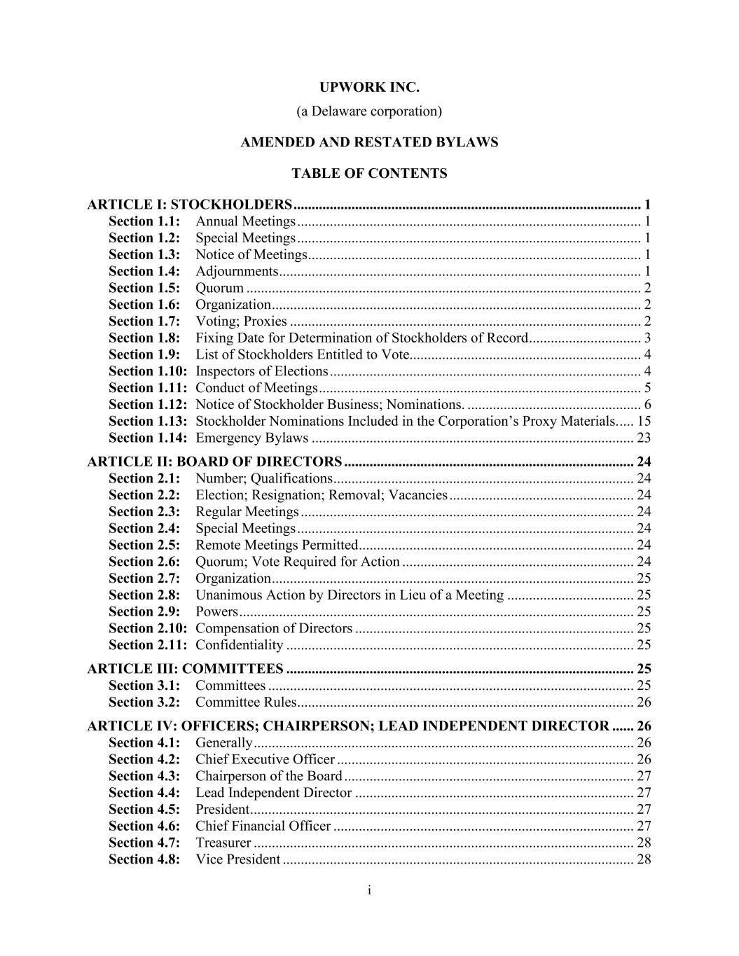 i UPWORK INC. (a Delaware corporation) AMENDED AND RESTATED BYLAWS TABLE OF CONTENTS ARTICLE I: STOCKHOLDERS ................................................................................................ 1 Section 1.1: Annual Meetings ............................................................................................... 1 Section 1.2: Special Meetings ............................................................................................... 1 Section 1.3: Notice of Meetings ............................................................................................ 1 Section 1.4: Adjournments .................................................................................................... 1 Section 1.5: Quorum ............................................................................................................. 2 Section 1.6: Organization ...................................................................................................... 2 Section 1.7: Voting; Proxies ................................................................................................. 2 Section 1.8: Fixing Date for Determination of Stockholders of Record ............................... 3 Section 1.9: List of Stockholders Entitled to Vote................................................................ 4 Section 1.10: Inspectors of Elections ...................................................................................... 4 Section 1.11: Conduct of Meetings ......................................................................................... 5 Section 1.12: Notice of Stockholder Business; Nominations. ................................................ 6 Section 1.13: Stockholder Nominations Included in the Corporation’s Proxy Materials. .... 15 Section 1.14: Emergency Bylaws ......................................................................................... 23 ARTICLE II: BOARD OF DIRECTORS ................................................................................ 24 Section 2.1: Number; Qualifications ................................................................................... 24 Section 2.2: Election; Resignation; Removal; Vacancies ................................................... 24 Section 2.3: Regular Meetings ............................................................................................ 24 Section 2.4: Special Meetings ............................................................................................. 24 Section 2.5: Remote Meetings Permitted ............................................................................ 24 Section 2.6: Quorum; Vote Required for Action ................................................................ 24 Section 2.7: Organization .................................................................................................... 25 Section 2.8: Unanimous Action by Directors in Lieu of a Meeting ................................... 25 Section 2.9: Powers ............................................................................................................. 25 Section 2.10: Compensation of Directors ............................................................................. 25 Section 2.11: Confidentiality ................................................................................................ 25 ARTICLE III: COMMITTEES ................................................................................................ 25 Section 3.1: Committees ..................................................................................................... 25 Section 3.2: Committee Rules ............................................................................................. 26 ARTICLE IV: OFFICERS; CHAIRPERSON; LEAD INDEPENDENT DIRECTOR ...... 26 Section 4.1: Generally ......................................................................................................... 26 Section 4.2: Chief Executive Officer .................................................................................. 26 Section 4.3: Chairperson of the Board ................................................................................ 27 Section 4.4: Lead Independent Director ............................................................................. 27 Section 4.5: President .......................................................................................................... 27 Section 4.6: Chief Financial Officer ................................................................................... 27 Section 4.7: Treasurer ......................................................................................................... 28 Section 4.8: Vice President ................................................................................................. 28