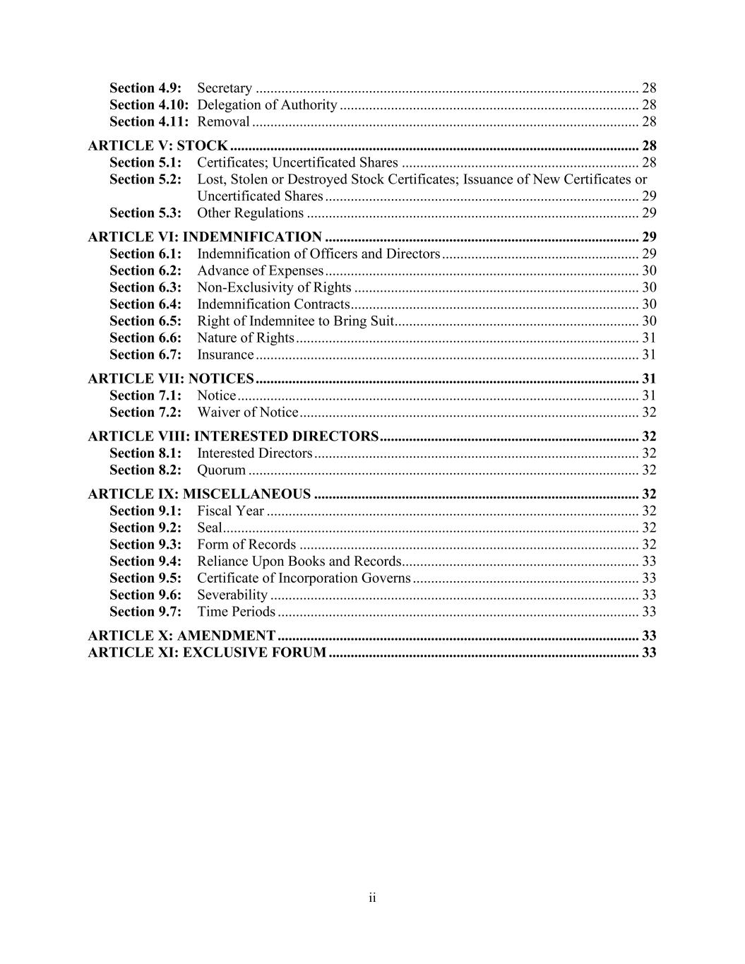 ii Section 4.9: Secretary ......................................................................................................... 28 Section 4.10: Delegation of Authority .................................................................................. 28 Section 4.11: Removal .......................................................................................................... 28 ARTICLE V: STOCK ................................................................................................................ 28 Section 5.1: Certificates; Uncertificated Shares ................................................................. 28 Section 5.2: Lost, Stolen or Destroyed Stock Certificates; Issuance of New Certificates or Uncertificated Shares ...................................................................................... 29 Section 5.3: Other Regulations ........................................................................................... 29 ARTICLE VI: INDEMNIFICATION ...................................................................................... 29 Section 6.1: Indemnification of Officers and Directors ...................................................... 29 Section 6.2: Advance of Expenses ...................................................................................... 30 Section 6.3: Non-Exclusivity of Rights .............................................................................. 30 Section 6.4: Indemnification Contracts ............................................................................... 30 Section 6.5: Right of Indemnitee to Bring Suit ................................................................... 30 Section 6.6: Nature of Rights .............................................................................................. 31 Section 6.7: Insurance ......................................................................................................... 31 ARTICLE VII: NOTICES ......................................................................................................... 31 Section 7.1: Notice .............................................................................................................. 31 Section 7.2: Waiver of Notice ............................................................................................. 32 ARTICLE VIII: INTERESTED DIRECTORS ....................................................................... 32 Section 8.1: Interested Directors ......................................................................................... 32 Section 8.2: Quorum ........................................................................................................... 32 ARTICLE IX: MISCELLANEOUS ......................................................................................... 32 Section 9.1: Fiscal Year ...................................................................................................... 32 Section 9.2: Seal .................................................................................................................. 32 Section 9.3: Form of Records ............................................................................................. 32 Section 9.4: Reliance Upon Books and Records................................................................. 33 Section 9.5: Certificate of Incorporation Governs .............................................................. 33 Section 9.6: Severability ..................................................................................................... 33 Section 9.7: Time Periods ................................................................................................... 33 ARTICLE X: AMENDMENT ................................................................................................... 33 ARTICLE XI: EXCLUSIVE FORUM ..................................................................................... 33