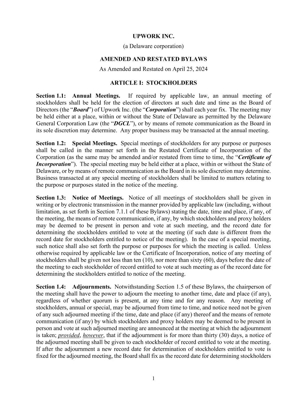 1 UPWORK INC. (a Delaware corporation) AMENDED AND RESTATED BYLAWS As Amended and Restated on April 25, 2024 ARTICLE I: STOCKHOLDERS Section 1.1: Annual Meetings. If required by applicable law, an annual meeting of stockholders shall be held for the election of directors at such date and time as the Board of Directors (the “Board”) of Upwork Inc. (the “Corporation”) shall each year fix. The meeting may be held either at a place, within or without the State of Delaware as permitted by the Delaware General Corporation Law (the “DGCL”), or by means of remote communication as the Board in its sole discretion may determine. Any proper business may be transacted at the annual meeting. Section 1.2: Special Meetings. Special meetings of stockholders for any purpose or purposes shall be called in the manner set forth in the Restated Certificate of Incorporation of the Corporation (as the same may be amended and/or restated from time to time, the “Certificate of Incorporation”). The special meeting may be held either at a place, within or without the State of Delaware, or by means of remote communication as the Board in its sole discretion may determine. Business transacted at any special meeting of stockholders shall be limited to matters relating to the purpose or purposes stated in the notice of the meeting. Section 1.3: Notice of Meetings. Notice of all meetings of stockholders shall be given in writing or by electronic transmission in the manner provided by applicable law (including, without limitation, as set forth in Section 7.1.1 of these Bylaws) stating the date, time and place, if any, of the meeting, the means of remote communication, if any, by which stockholders and proxy holders may be deemed to be present in person and vote at such meeting, and the record date for determining the stockholders entitled to vote at the meeting (if such date is different from the record date for stockholders entitled to notice of the meeting). In the case of a special meeting, such notice shall also set forth the purpose or purposes for which the meeting is called. Unless otherwise required by applicable law or the Certificate of Incorporation, notice of any meeting of stockholders shall be given not less than ten (10), nor more than sixty (60), days before the date of the meeting to each stockholder of record entitled to vote at such meeting as of the record date for determining the stockholders entitled to notice of the meeting. Section 1.4: Adjournments. Notwithstanding Section 1.5 of these Bylaws, the chairperson of the meeting shall have the power to adjourn the meeting to another time, date and place (if any), regardless of whether quorum is present, at any time and for any reason. Any meeting of stockholders, annual or special, may be adjourned from time to time, and notice need not be given of any such adjourned meeting if the time, date and place (if any) thereof and the means of remote communication (if any) by which stockholders and proxy holders may be deemed to be present in person and vote at such adjourned meeting are announced at the meeting at which the adjournment is taken; provided, however, that if the adjournment is for more than thirty (30) days, a notice of the adjourned meeting shall be given to each stockholder of record entitled to vote at the meeting. If after the adjournment a new record date for determination of stockholders entitled to vote is fixed for the adjourned meeting, the Board shall fix as the record date for determining stockholders