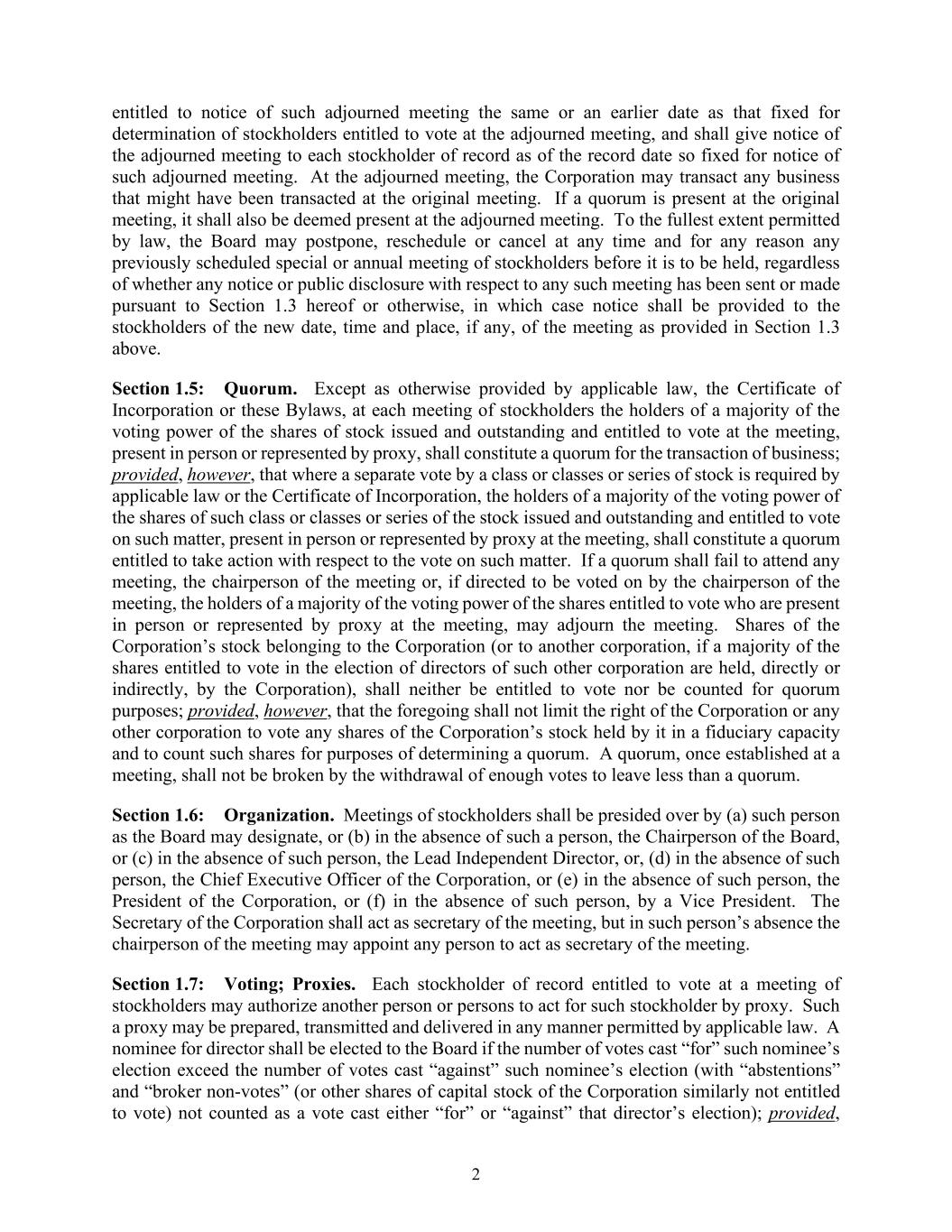 2 entitled to notice of such adjourned meeting the same or an earlier date as that fixed for determination of stockholders entitled to vote at the adjourned meeting, and shall give notice of the adjourned meeting to each stockholder of record as of the record date so fixed for notice of such adjourned meeting. At the adjourned meeting, the Corporation may transact any business that might have been transacted at the original meeting. If a quorum is present at the original meeting, it shall also be deemed present at the adjourned meeting. To the fullest extent permitted by law, the Board may postpone, reschedule or cancel at any time and for any reason any previously scheduled special or annual meeting of stockholders before it is to be held, regardless of whether any notice or public disclosure with respect to any such meeting has been sent or made pursuant to Section 1.3 hereof or otherwise, in which case notice shall be provided to the stockholders of the new date, time and place, if any, of the meeting as provided in Section 1.3 above. Section 1.5: Quorum. Except as otherwise provided by applicable law, the Certificate of Incorporation or these Bylaws, at each meeting of stockholders the holders of a majority of the voting power of the shares of stock issued and outstanding and entitled to vote at the meeting, present in person or represented by proxy, shall constitute a quorum for the transaction of business; provided, however, that where a separate vote by a class or classes or series of stock is required by applicable law or the Certificate of Incorporation, the holders of a majority of the voting power of the shares of such class or classes or series of the stock issued and outstanding and entitled to vote on such matter, present in person or represented by proxy at the meeting, shall constitute a quorum entitled to take action with respect to the vote on such matter. If a quorum shall fail to attend any meeting, the chairperson of the meeting or, if directed to be voted on by the chairperson of the meeting, the holders of a majority of the voting power of the shares entitled to vote who are present in person or represented by proxy at the meeting, may adjourn the meeting. Shares of the Corporation’s stock belonging to the Corporation (or to another corporation, if a majority of the shares entitled to vote in the election of directors of such other corporation are held, directly or indirectly, by the Corporation), shall neither be entitled to vote nor be counted for quorum purposes; provided, however, that the foregoing shall not limit the right of the Corporation or any other corporation to vote any shares of the Corporation’s stock held by it in a fiduciary capacity and to count such shares for purposes of determining a quorum. A quorum, once established at a meeting, shall not be broken by the withdrawal of enough votes to leave less than a quorum. Section 1.6: Organization. Meetings of stockholders shall be presided over by (a) such person as the Board may designate, or (b) in the absence of such a person, the Chairperson of the Board, or (c) in the absence of such person, the Lead Independent Director, or, (d) in the absence of such person, the Chief Executive Officer of the Corporation, or (e) in the absence of such person, the President of the Corporation, or (f) in the absence of such person, by a Vice President. The Secretary of the Corporation shall act as secretary of the meeting, but in such person’s absence the chairperson of the meeting may appoint any person to act as secretary of the meeting. Section 1.7: Voting; Proxies. Each stockholder of record entitled to vote at a meeting of stockholders may authorize another person or persons to act for such stockholder by proxy. Such a proxy may be prepared, transmitted and delivered in any manner permitted by applicable law. A nominee for director shall be elected to the Board if the number of votes cast “for” such nominee’s election exceed the number of votes cast “against” such nominee’s election (with “abstentions” and “broker non-votes” (or other shares of capital stock of the Corporation similarly not entitled to vote) not counted as a vote cast either “for” or “against” that director’s election); provided,