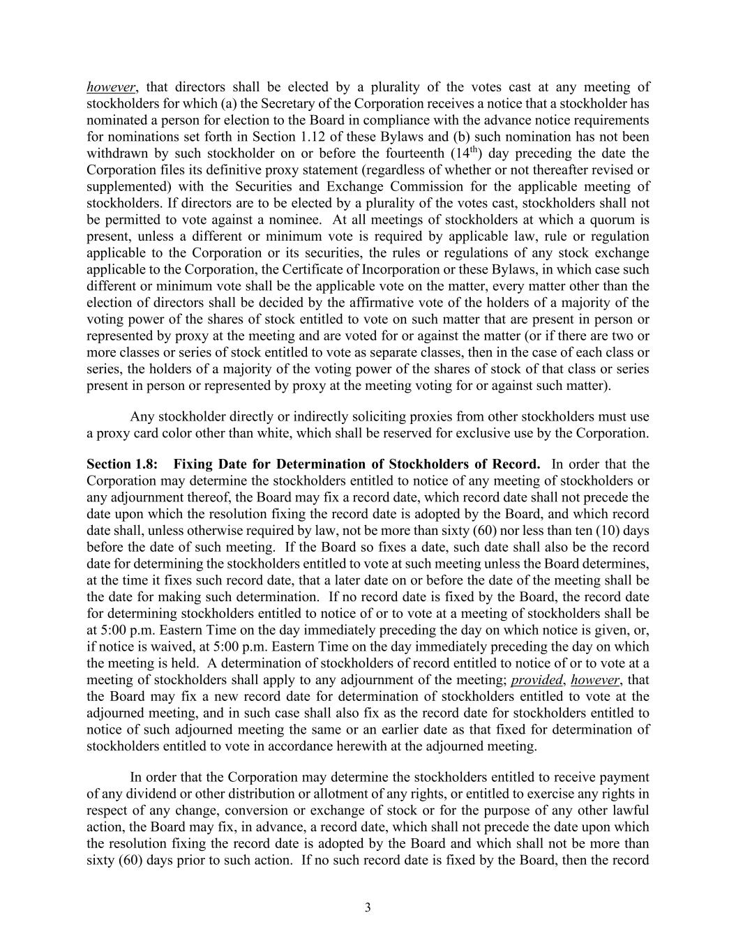 3 however, that directors shall be elected by a plurality of the votes cast at any meeting of stockholders for which (a) the Secretary of the Corporation receives a notice that a stockholder has nominated a person for election to the Board in compliance with the advance notice requirements for nominations set forth in Section 1.12 of these Bylaws and (b) such nomination has not been withdrawn by such stockholder on or before the fourteenth (14th) day preceding the date the Corporation files its definitive proxy statement (regardless of whether or not thereafter revised or supplemented) with the Securities and Exchange Commission for the applicable meeting of stockholders. If directors are to be elected by a plurality of the votes cast, stockholders shall not be permitted to vote against a nominee. At all meetings of stockholders at which a quorum is present, unless a different or minimum vote is required by applicable law, rule or regulation applicable to the Corporation or its securities, the rules or regulations of any stock exchange applicable to the Corporation, the Certificate of Incorporation or these Bylaws, in which case such different or minimum vote shall be the applicable vote on the matter, every matter other than the election of directors shall be decided by the affirmative vote of the holders of a majority of the voting power of the shares of stock entitled to vote on such matter that are present in person or represented by proxy at the meeting and are voted for or against the matter (or if there are two or more classes or series of stock entitled to vote as separate classes, then in the case of each class or series, the holders of a majority of the voting power of the shares of stock of that class or series present in person or represented by proxy at the meeting voting for or against such matter). Any stockholder directly or indirectly soliciting proxies from other stockholders must use a proxy card color other than white, which shall be reserved for exclusive use by the Corporation. Section 1.8: Fixing Date for Determination of Stockholders of Record. In order that the Corporation may determine the stockholders entitled to notice of any meeting of stockholders or any adjournment thereof, the Board may fix a record date, which record date shall not precede the date upon which the resolution fixing the record date is adopted by the Board, and which record date shall, unless otherwise required by law, not be more than sixty (60) nor less than ten (10) days before the date of such meeting. If the Board so fixes a date, such date shall also be the record date for determining the stockholders entitled to vote at such meeting unless the Board determines, at the time it fixes such record date, that a later date on or before the date of the meeting shall be the date for making such determination. If no record date is fixed by the Board, the record date for determining stockholders entitled to notice of or to vote at a meeting of stockholders shall be at 5:00 p.m. Eastern Time on the day immediately preceding the day on which notice is given, or, if notice is waived, at 5:00 p.m. Eastern Time on the day immediately preceding the day on which the meeting is held. A determination of stockholders of record entitled to notice of or to vote at a meeting of stockholders shall apply to any adjournment of the meeting; provided, however, that the Board may fix a new record date for determination of stockholders entitled to vote at the adjourned meeting, and in such case shall also fix as the record date for stockholders entitled to notice of such adjourned meeting the same or an earlier date as that fixed for determination of stockholders entitled to vote in accordance herewith at the adjourned meeting. In order that the Corporation may determine the stockholders entitled to receive payment of any dividend or other distribution or allotment of any rights, or entitled to exercise any rights in respect of any change, conversion or exchange of stock or for the purpose of any other lawful action, the Board may fix, in advance, a record date, which shall not precede the date upon which the resolution fixing the record date is adopted by the Board and which shall not be more than sixty (60) days prior to such action. If no such record date is fixed by the Board, then the record